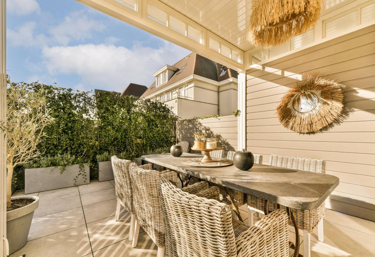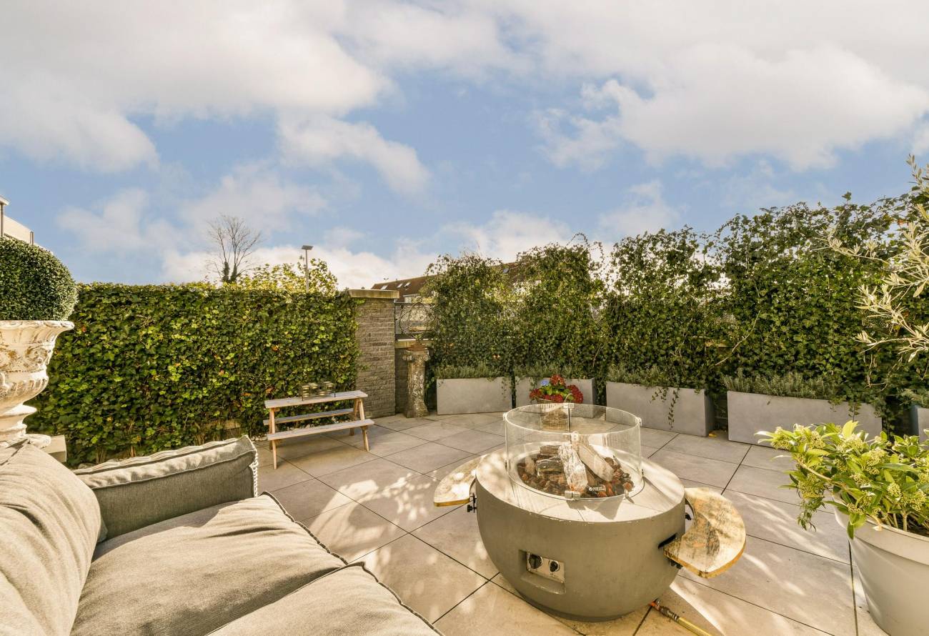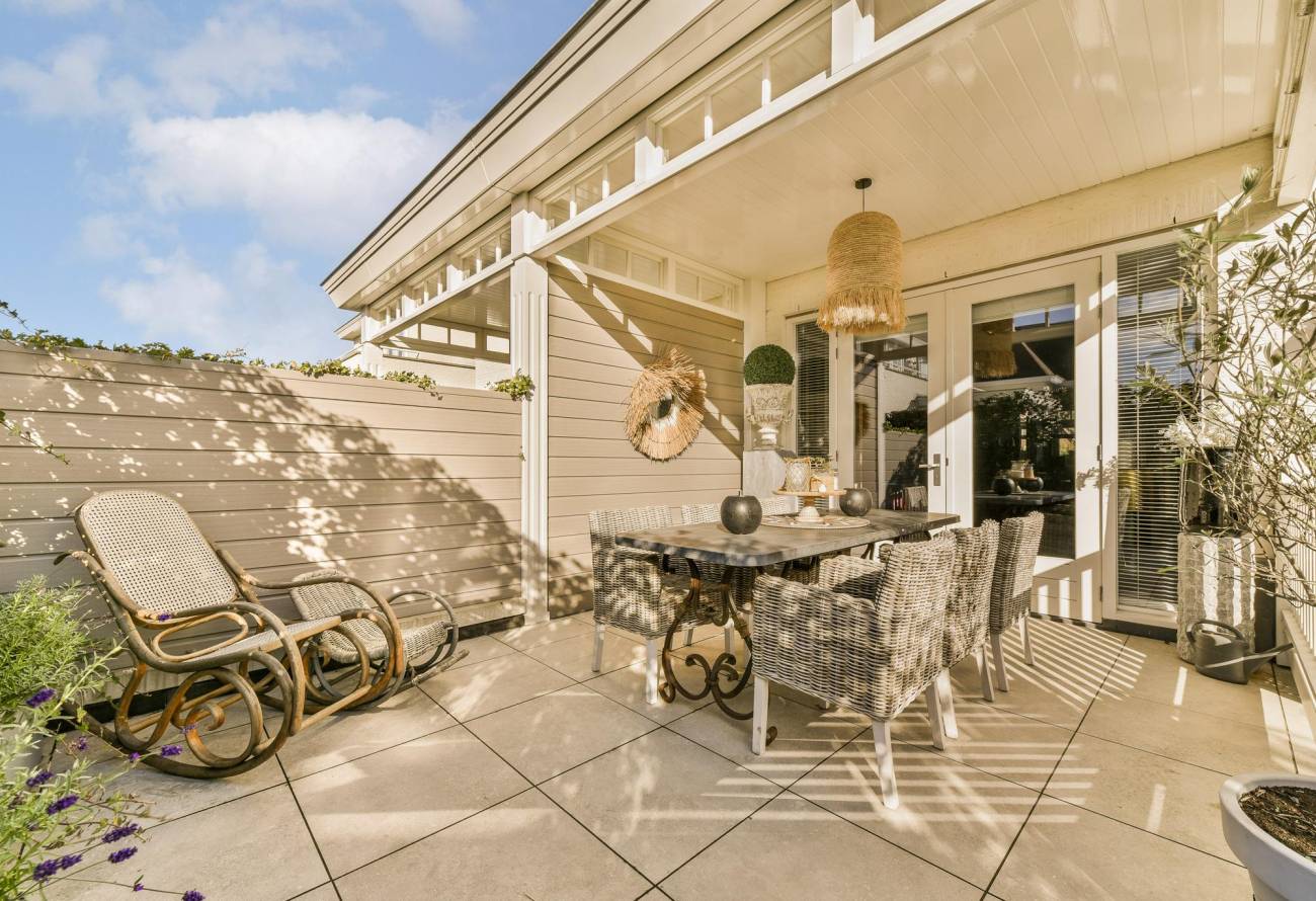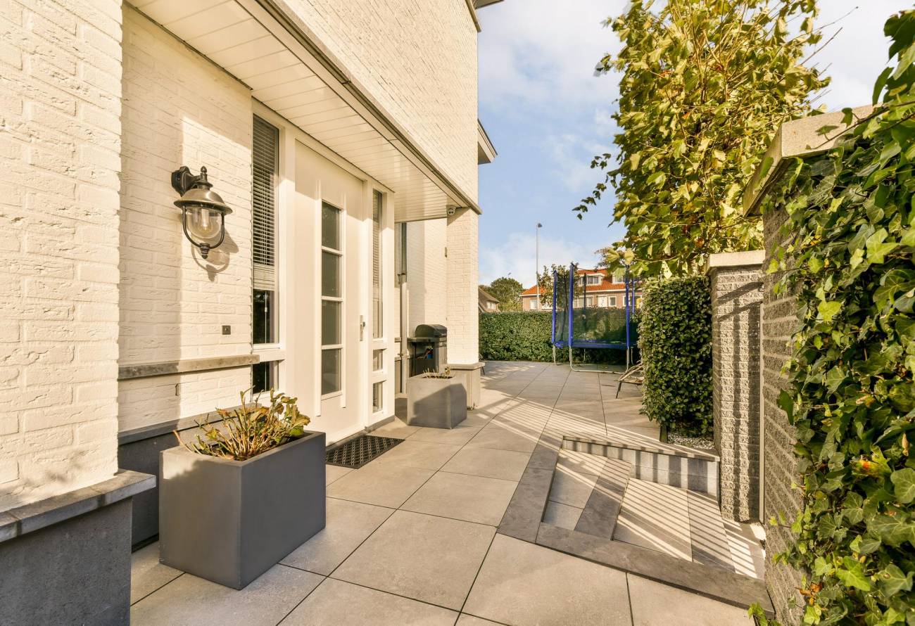 Via de openslaande deuren van de living komen we in de, op het zuidwesten gelegen, tuin met veranda die zeer veel privacy biedt. De veranda geeft een gezellige sfeer aan de tuin en met de aanwezige gasaansluitingen voor bbq of gasheater is het hier altijd comfortabel vertoeven. De tuin is fraai aangelegd met een halfhoge muur, een haag en grote plantenbakken in grindvakken.