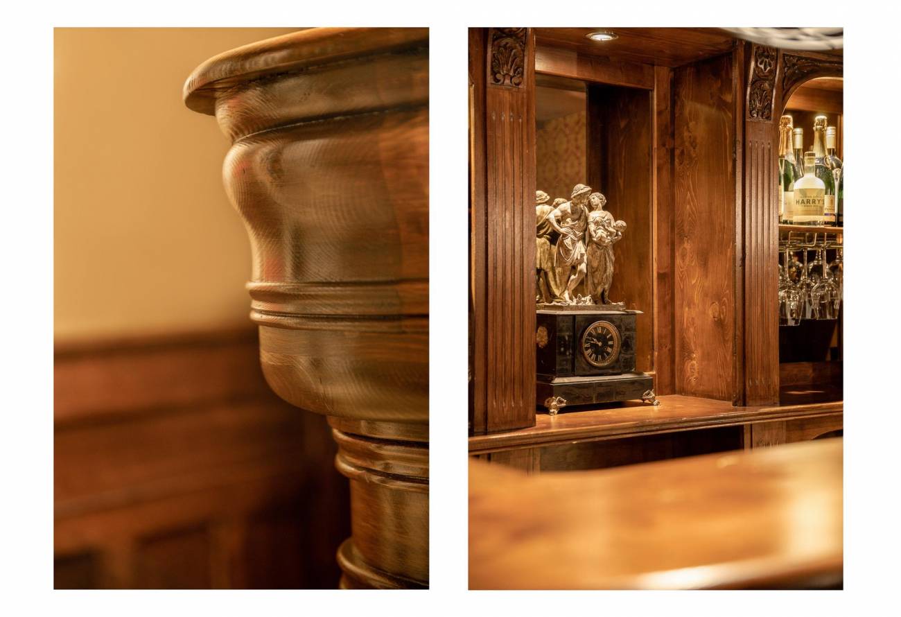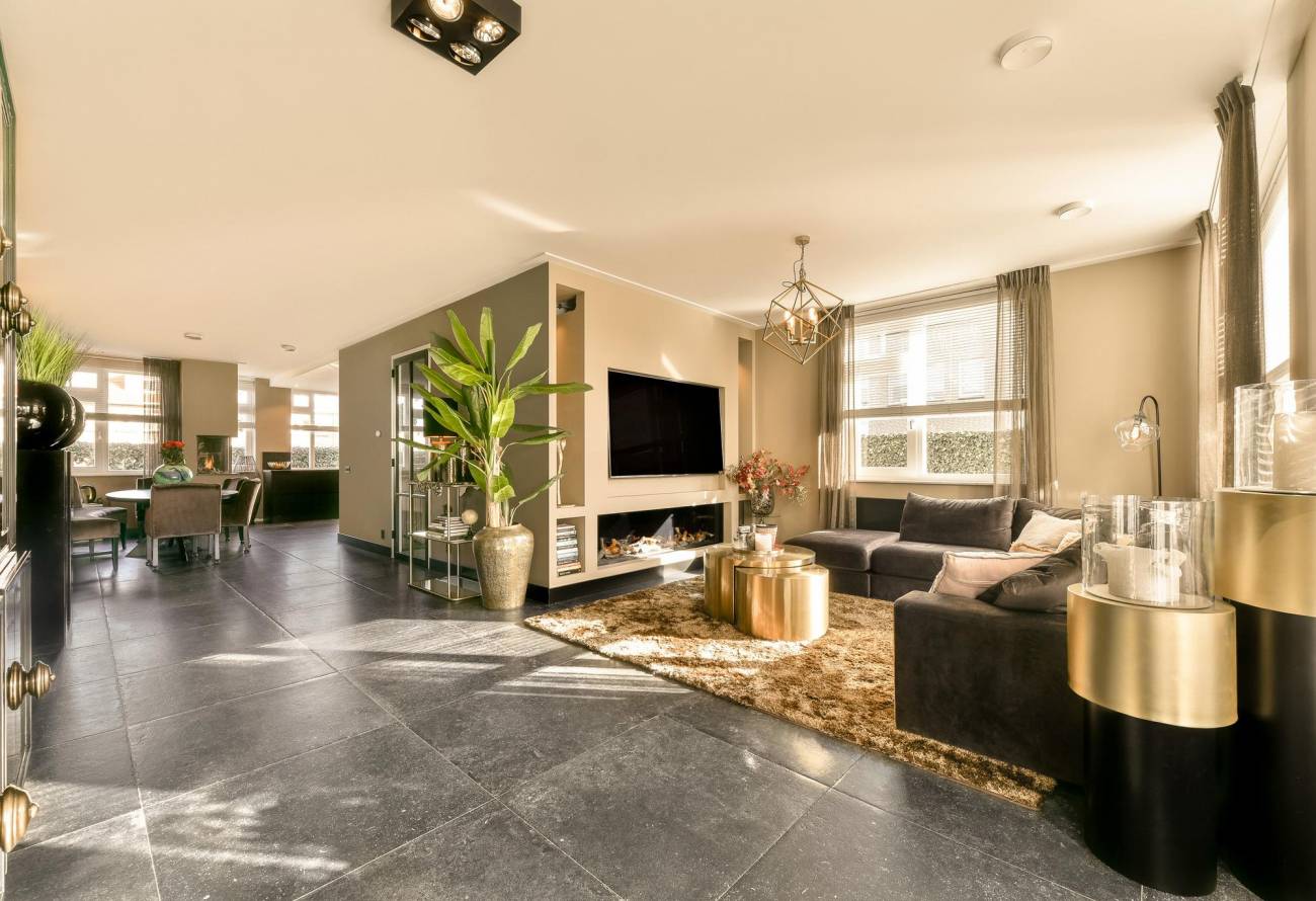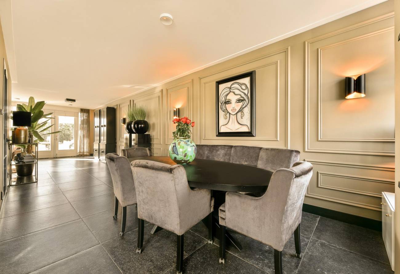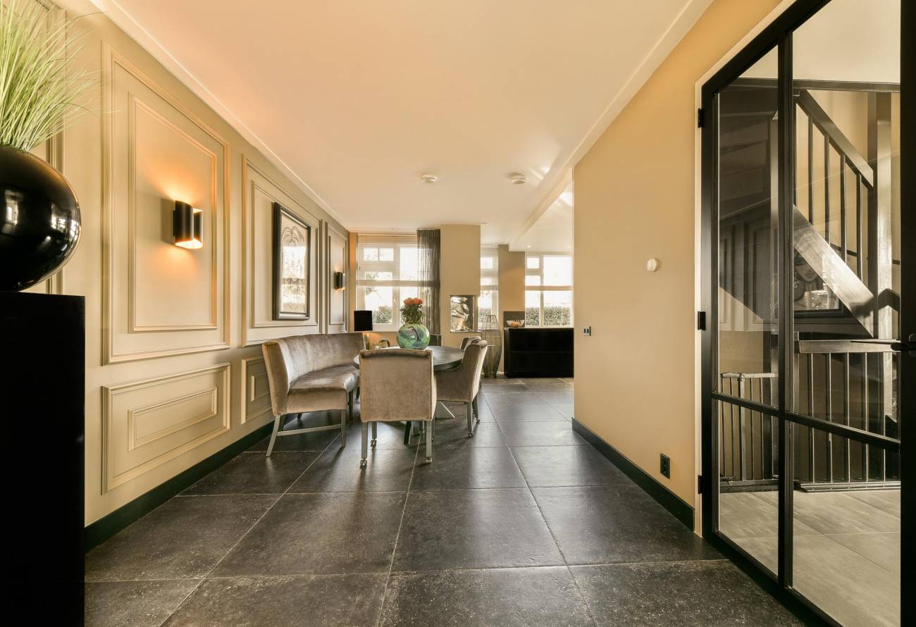 De royale L-vormige woon/eetkamer heeft een wandmeubel met daarin een gasgestookte openhaard, een Belgisch hardstenen vloer, heerlijk voorzien van vloerverwarming en openslaande deuren naar de tuin met veranda.