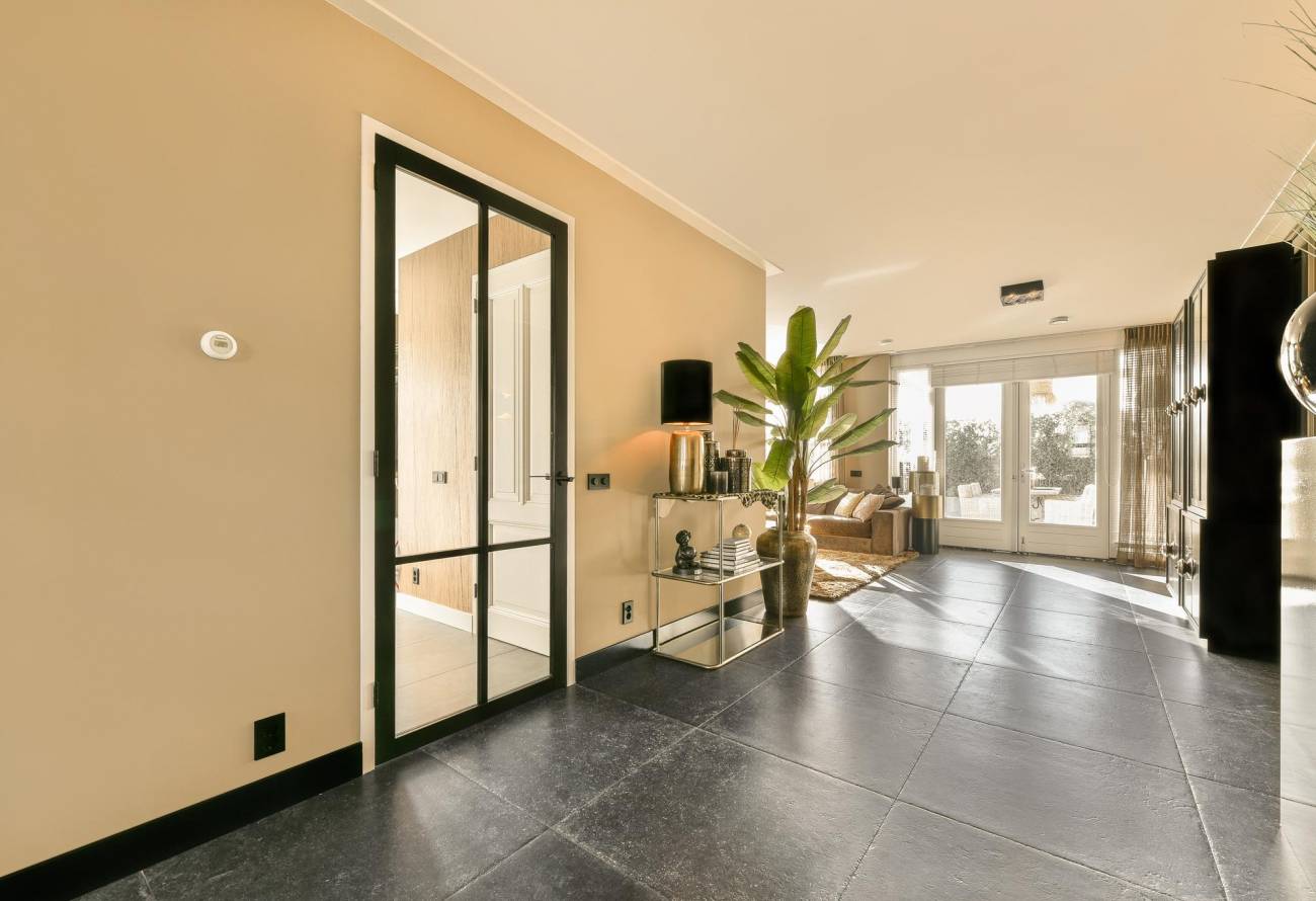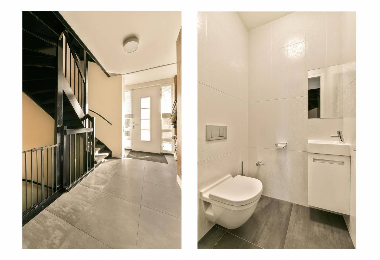 Fraaie overdekte entree met steunpilaren, lichte hal met garderobe, meterkast, modern gastentoilet, een ruim trappenhuis en is voorzien van een donkere tegelvloer.