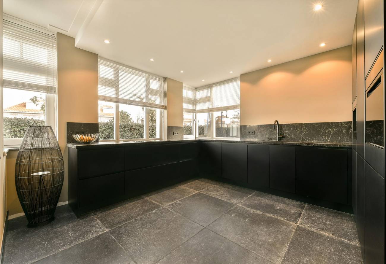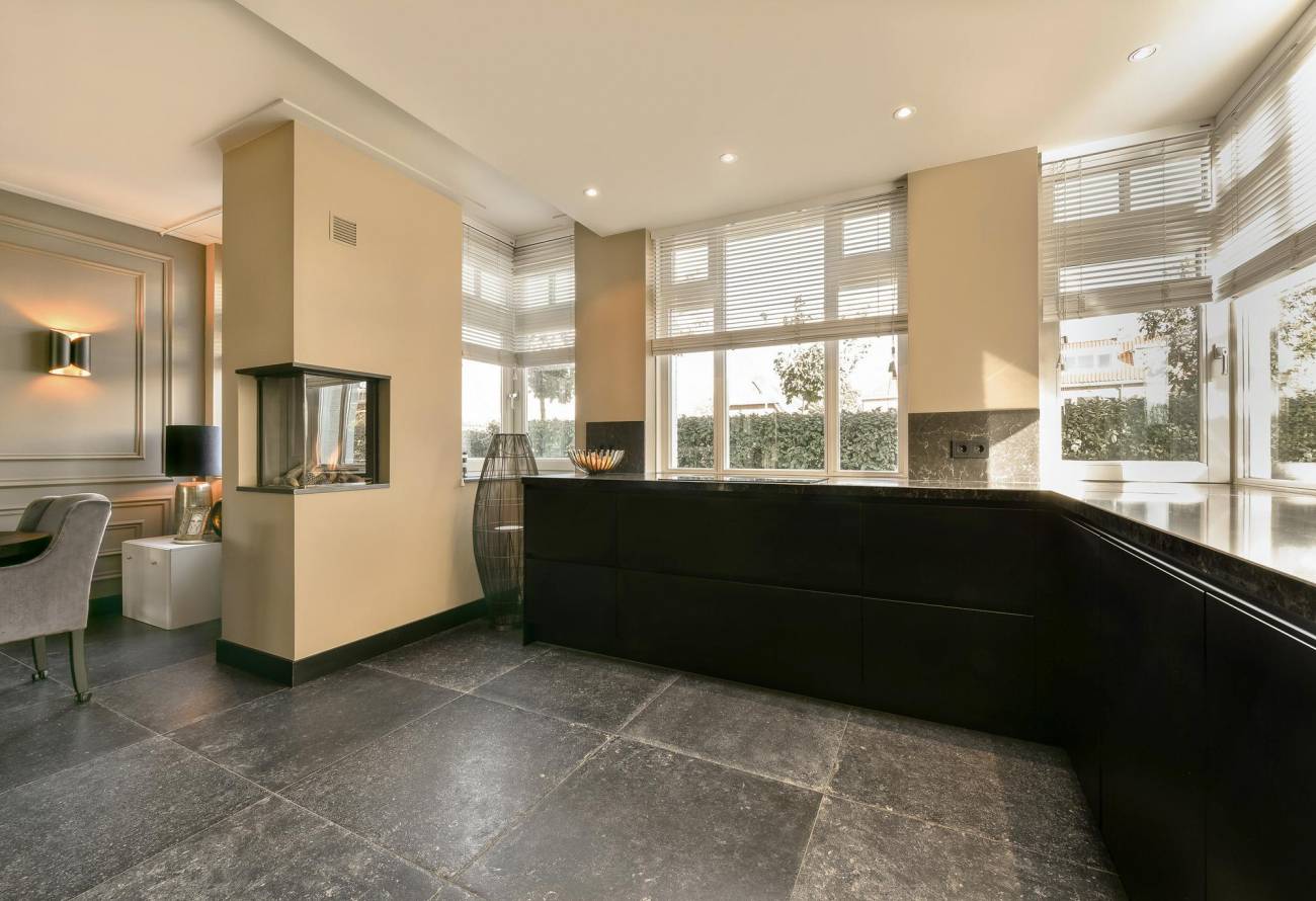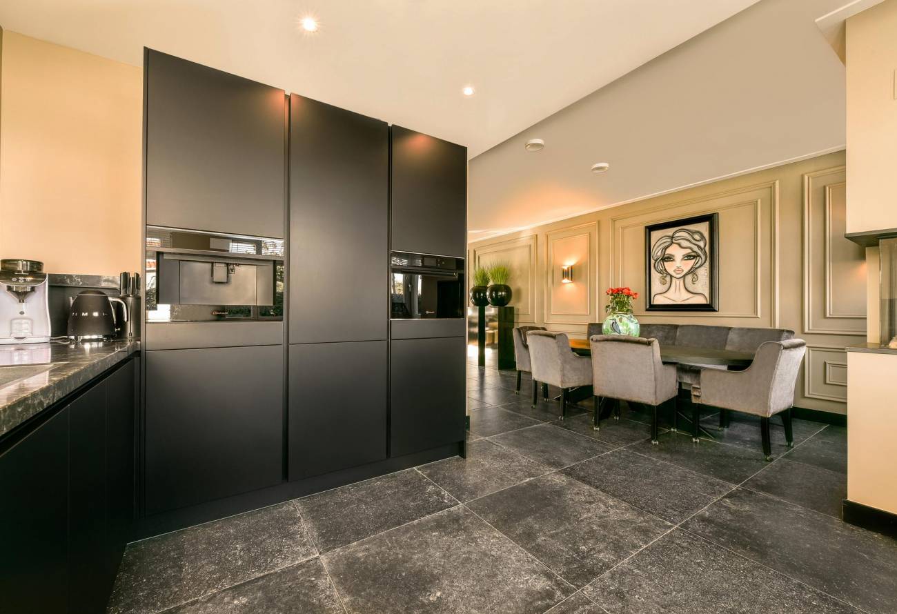 De luxe keuken heeft een donker natuurstenenblad en luxe inbouwapparatuur.