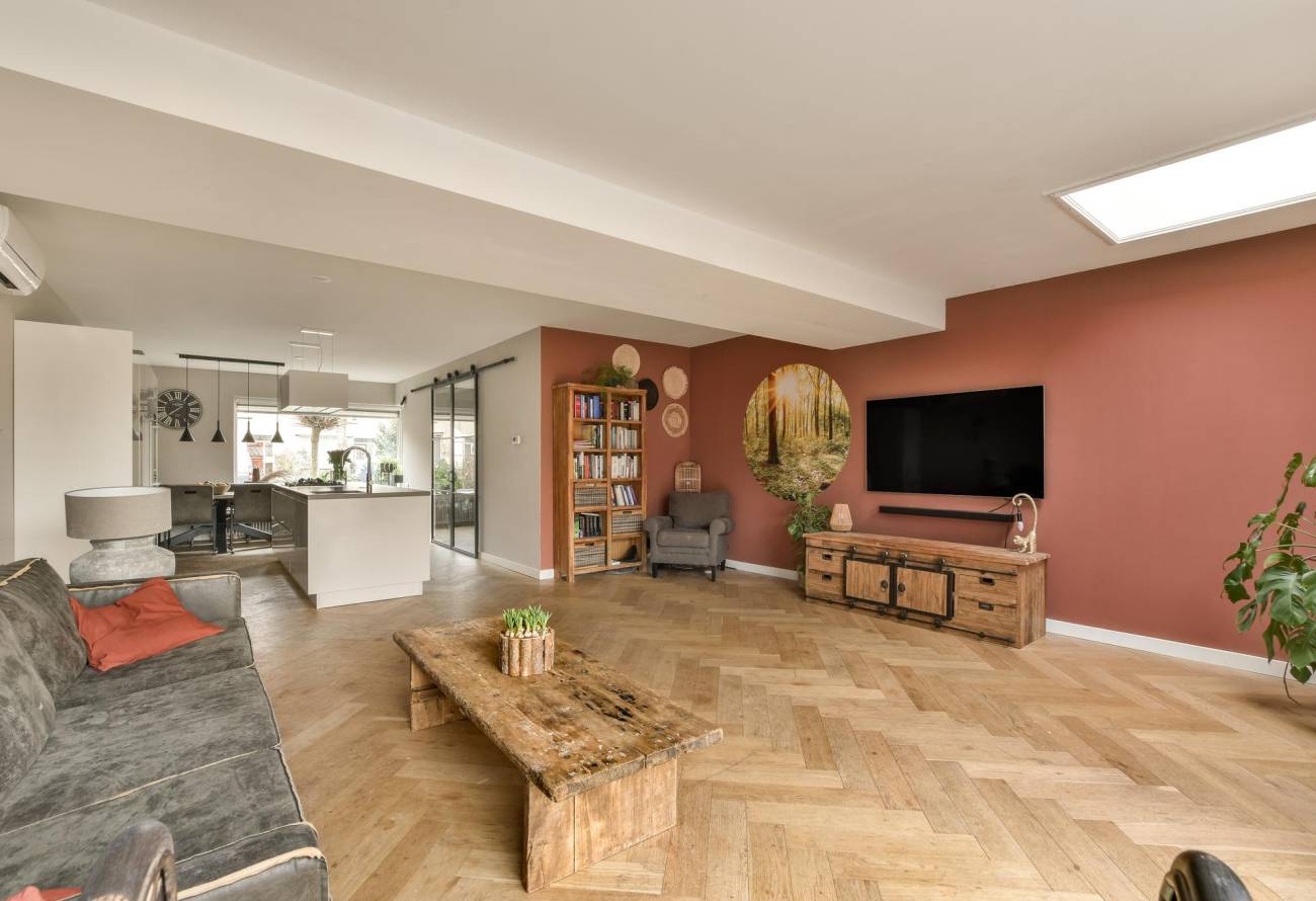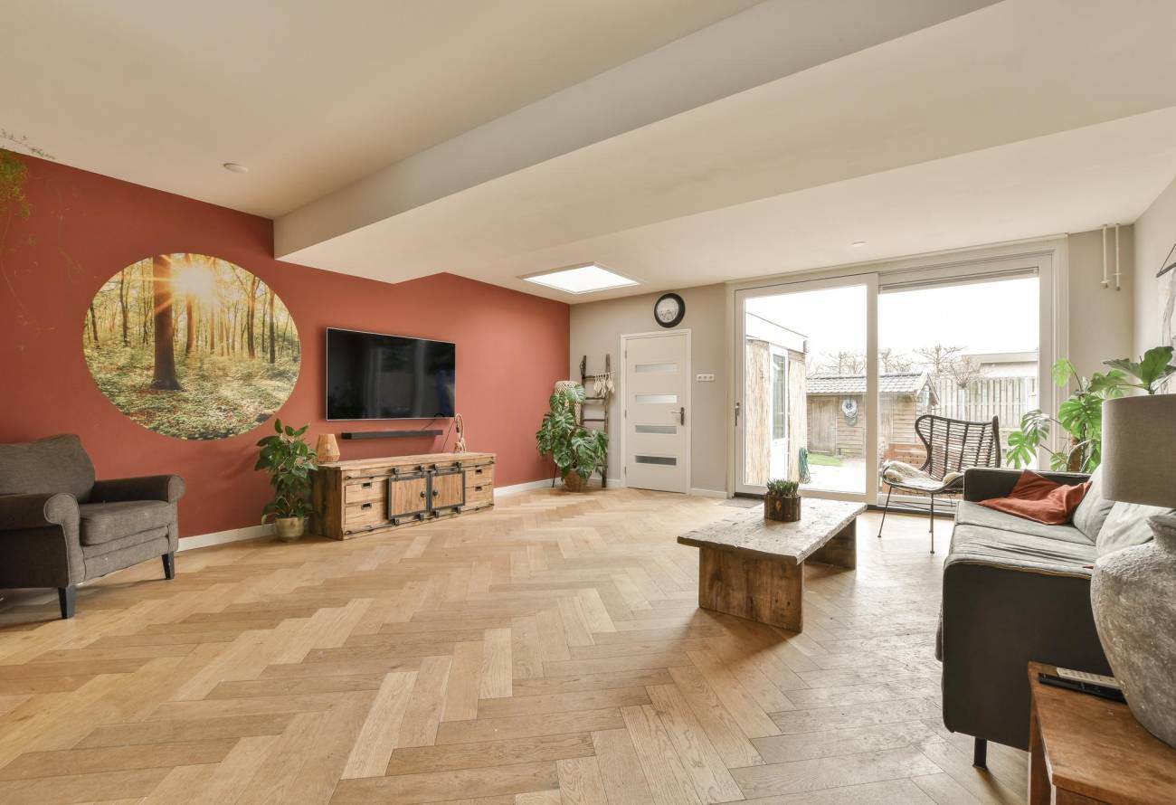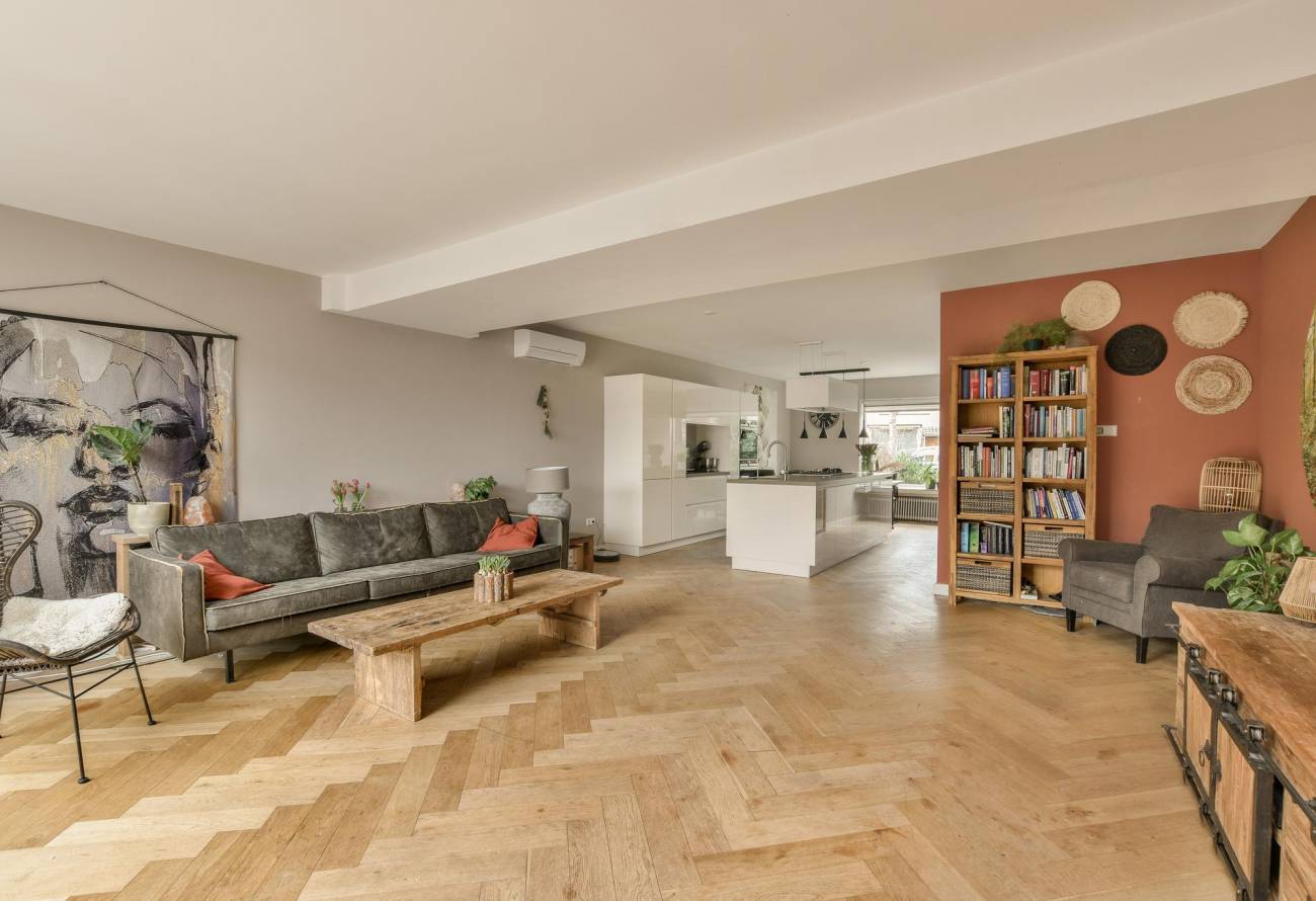 De uitgebouwde woonkamer van ruim 40m² is naar de tuin gericht en heeft een nieuwe schuifpui. De gehele begane grondvloer is voorzien van een massief eiken vloer in visgraat (2021). In de betegelde bijkeuken staat o.a. de wasapparatuur opgesteld.