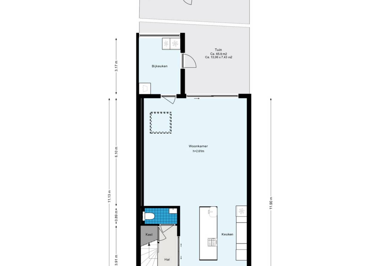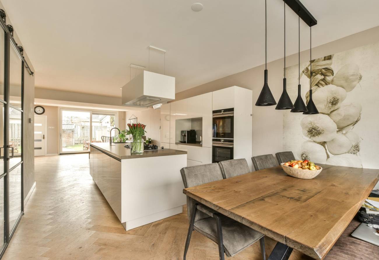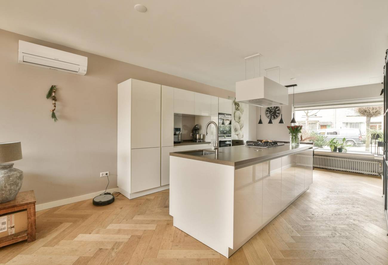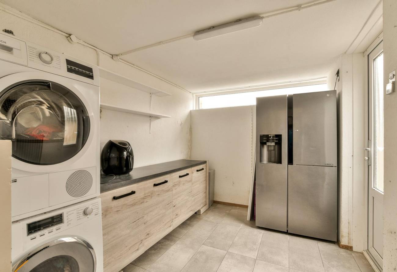 De uitgebouwde woonkamer van ruim 40m² is naar de tuin gericht en heeft een nieuwe schuifpui. De gehele begane grondvloer is voorzien van een massief eiken vloer in visgraat (2021). In de betegelde bijkeuken staat o.a. de wasapparatuur opgesteld.
