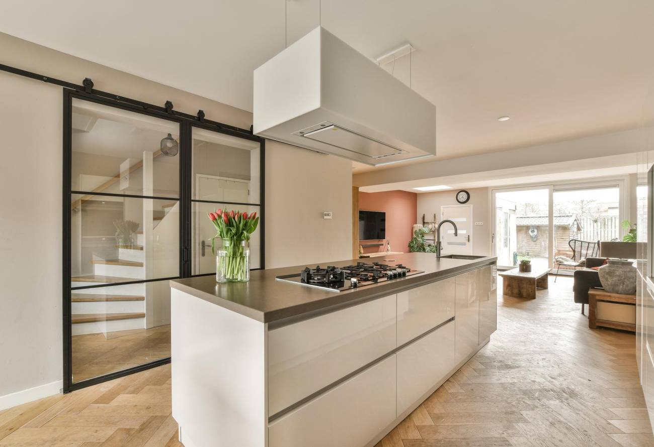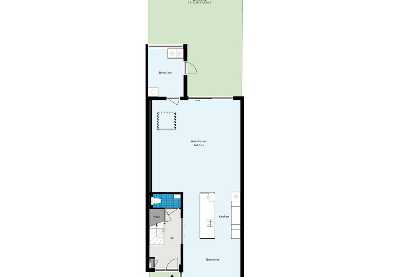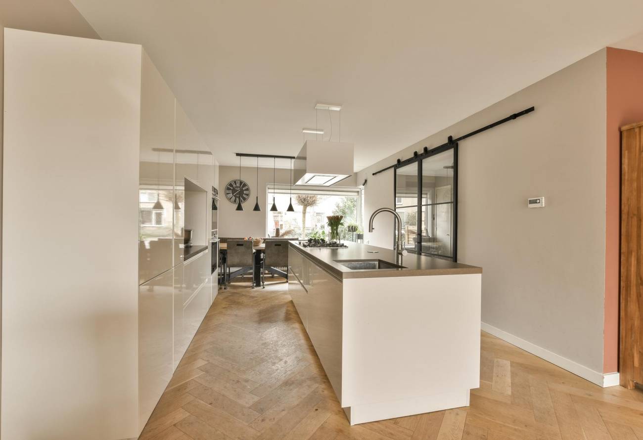 Indeling: royale hal, nieuwe meterkast, nieuwe fraaie trap, garderobekast en nieuw luxe toilet met wandcloset en fontein (2021). De fraaie zwart stalen schuifdeuren met glas geven toegang tot de grote luxe woonkeuken van 21m² met kook-/en spoeleiland, witte hoogglans inrichting en leverkleurig composiet werkblad, koffiecorner en alle inbouwapparatuur.