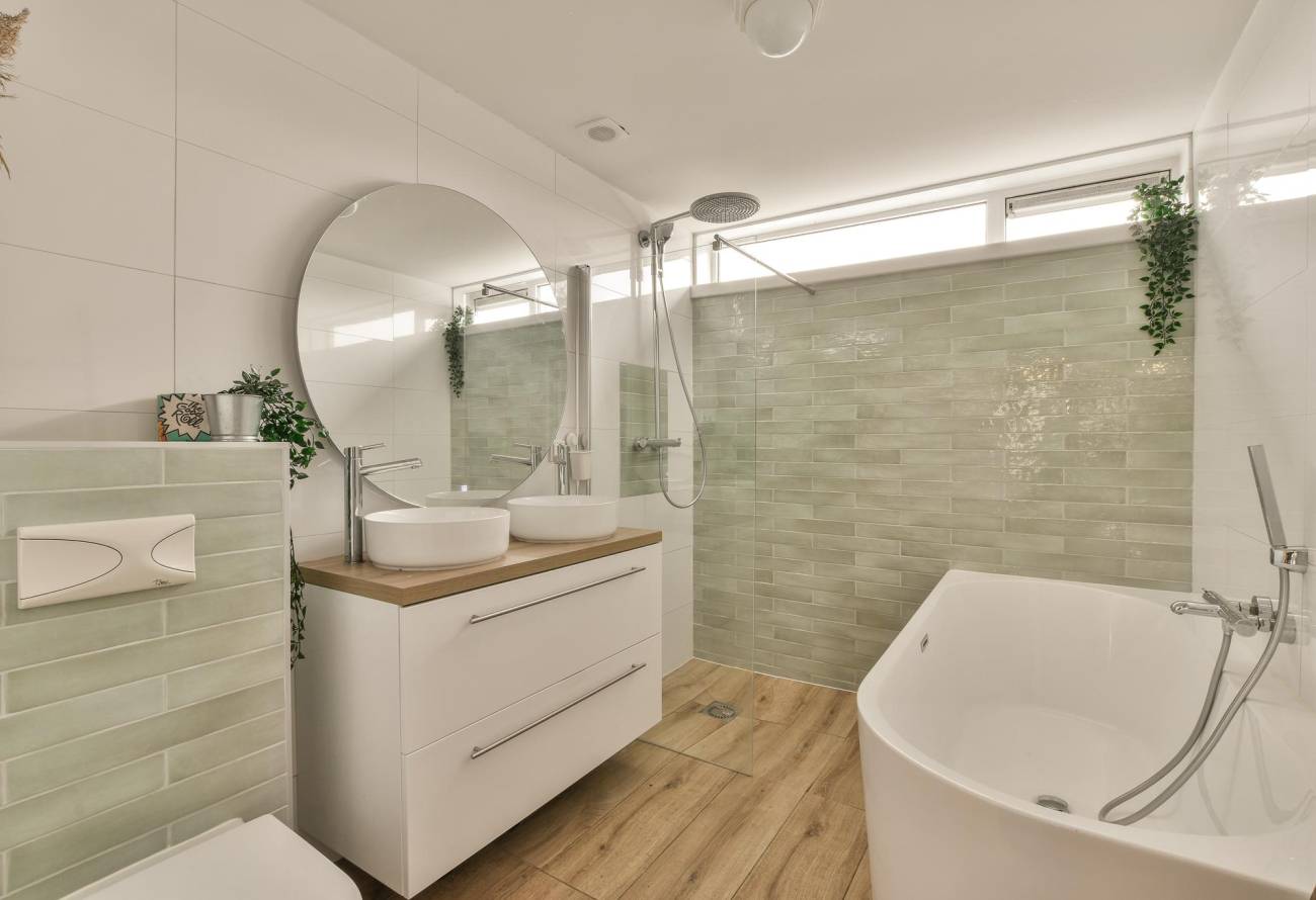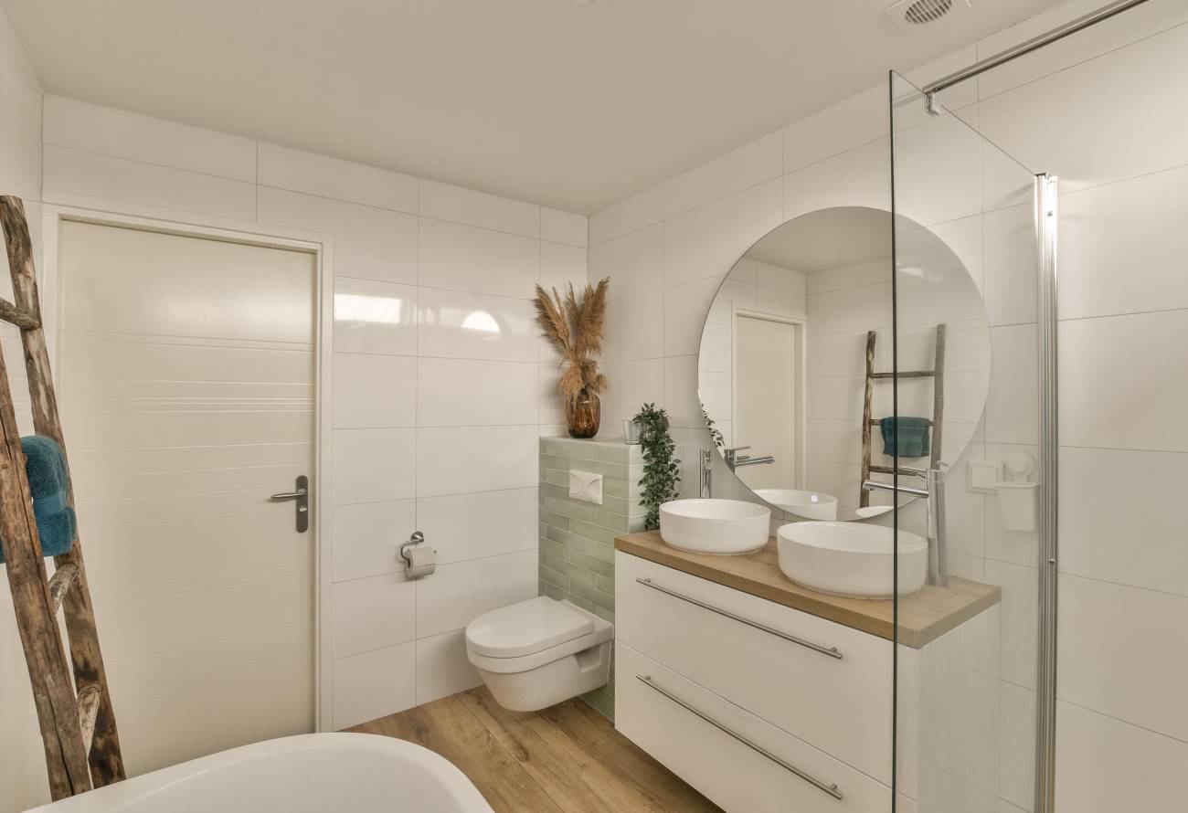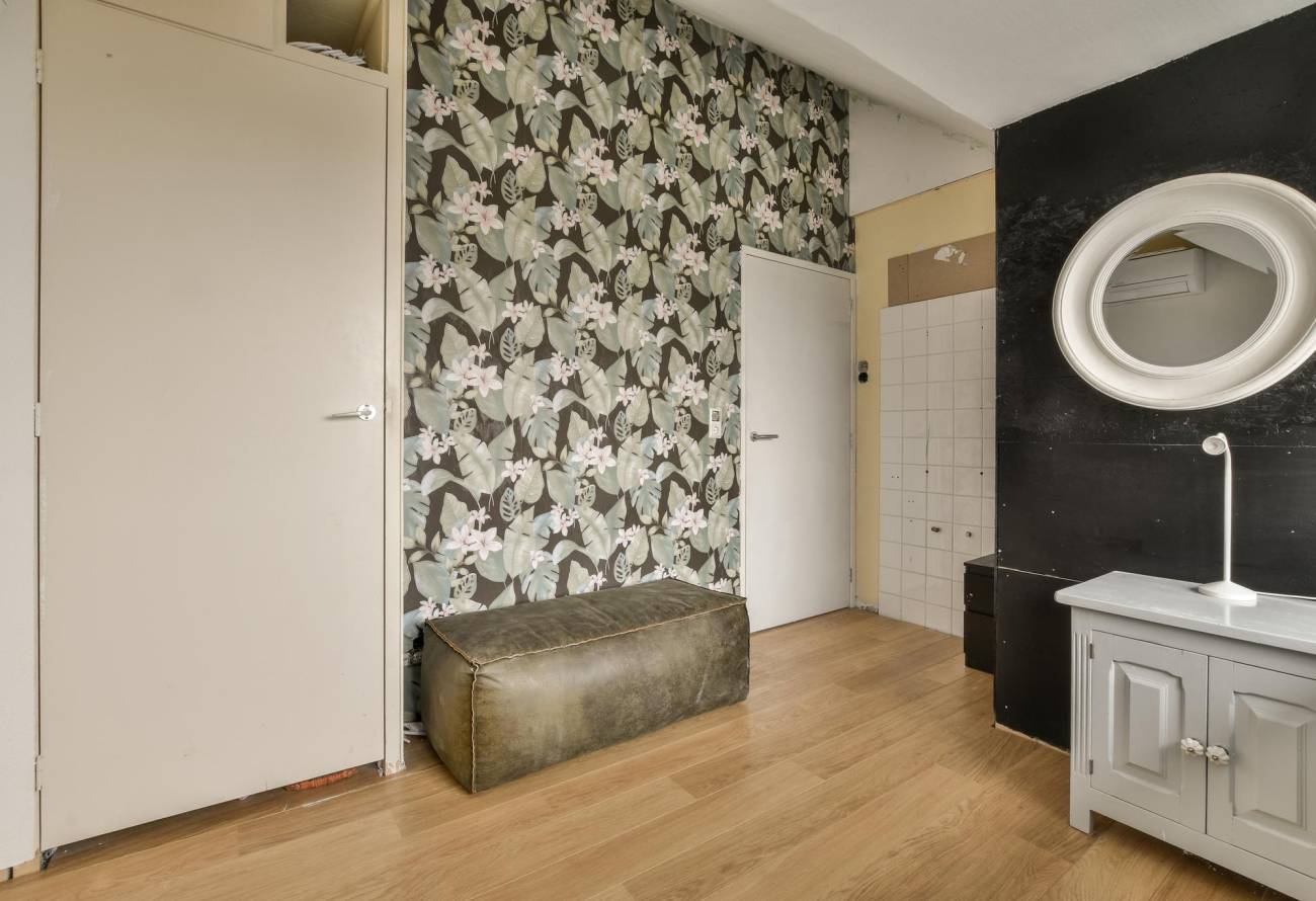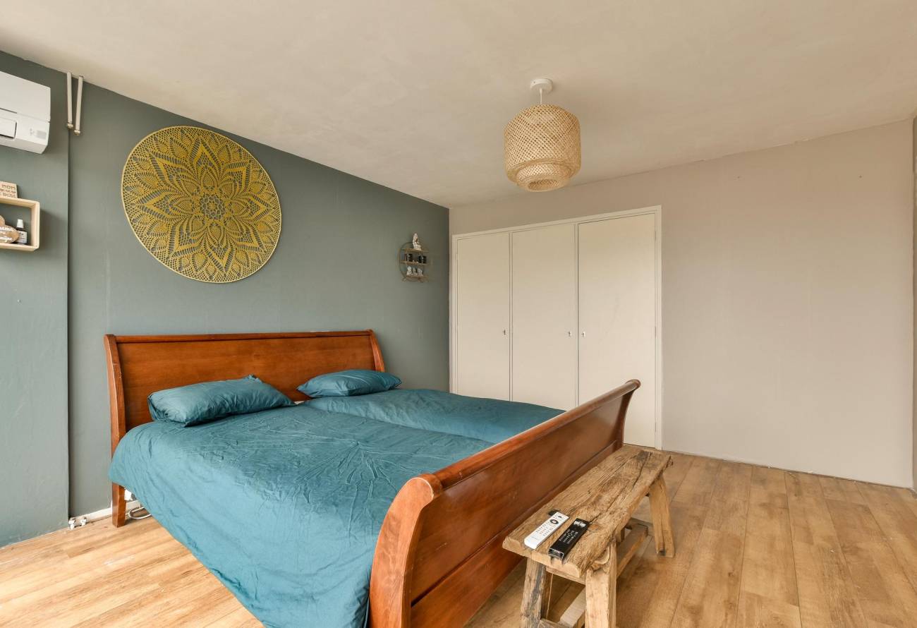 1e Etage: overloop met vaste kast, aan voorzijde een kleine en een grote slaapkamer welke voorzien is van twee vaste kasten en een eiken laminaatvloer, hoofdslaapkamer aan achterzijde met 3 vaste kasten, een eiken laminaatvloer en een schuifpui naar groot dakterras. De nieuwe ruime badkamer (2022) is zeer fraai, voorzien van een ligbad, inloopdouche, groot wastafelmeubel met twee witte waskommen waarboven een grote ronde spiegel.