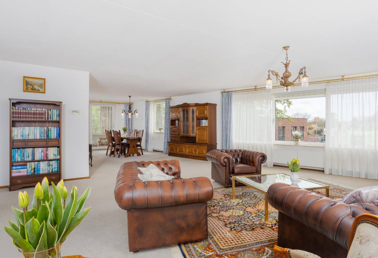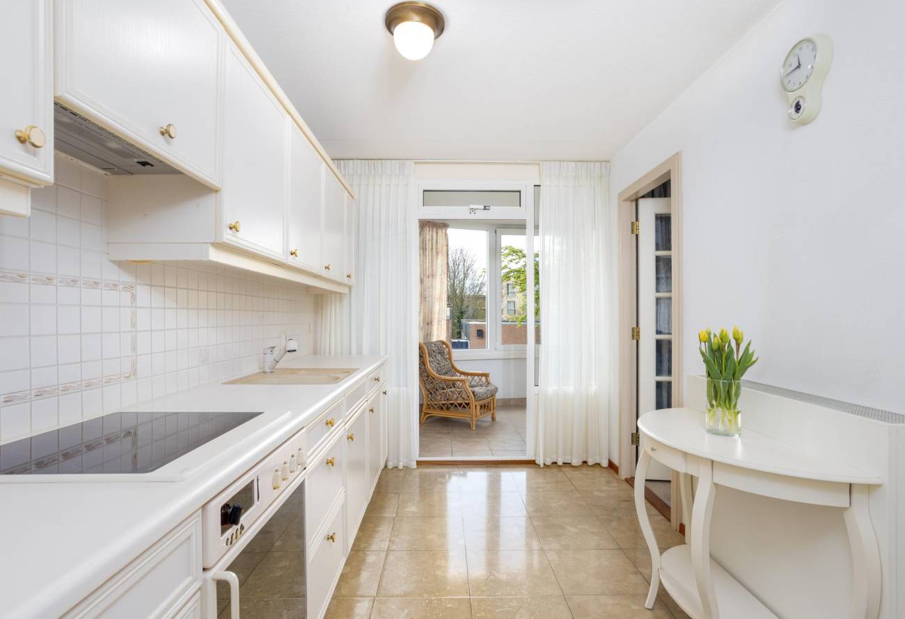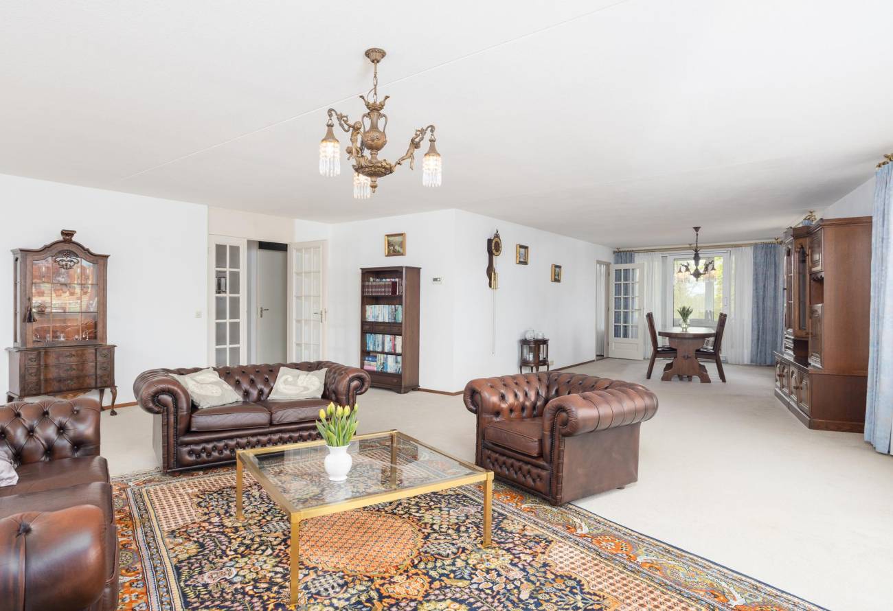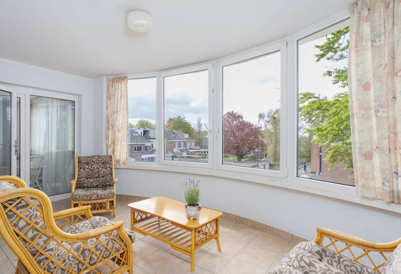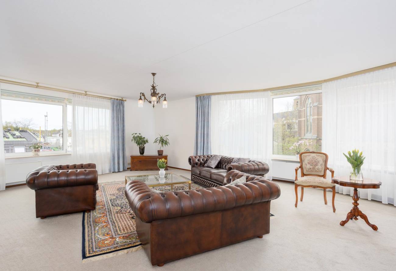 Indeling 2e Etage: Hal met garderobe, toiletruimte, meterkast en cv kast, de zeer grote living van circa 70m² is door de vele raampartijen heerlijk licht, de dichte en ruime keuken is enigszins gedateerd en geeft toegang tot zowel de grote bijkeuken als tot het terras. De royale badkamer heeft zowel een ligbad als douchecabine en een toilet. De hoofdslaapkamer is 22m² en heeft ook toegang tot het terras, de 2e slaapkamer aan de voorzijde is ook ruim te noemen.