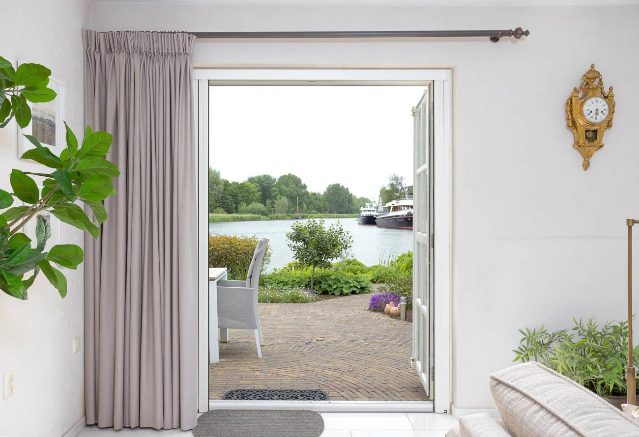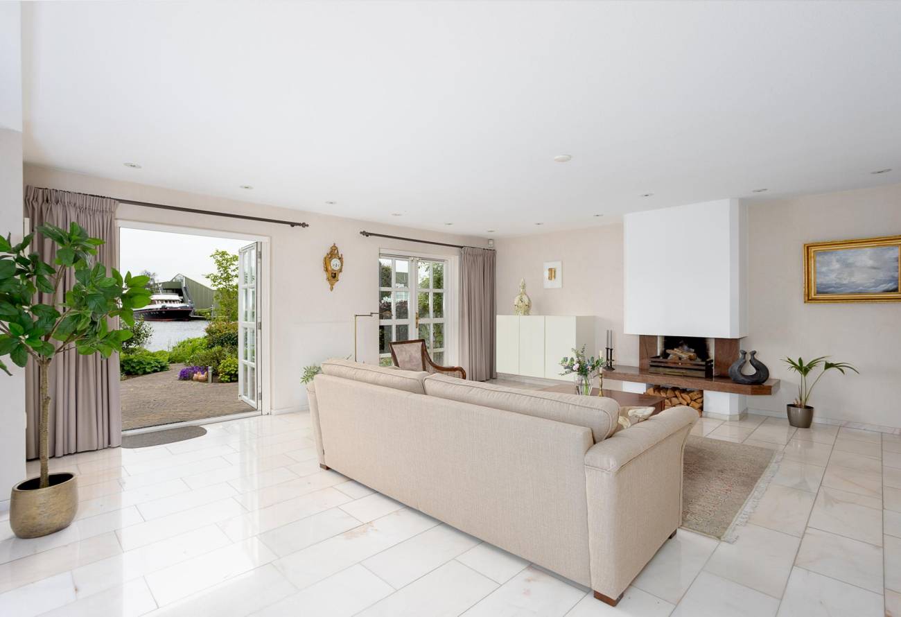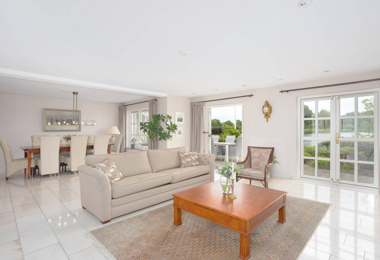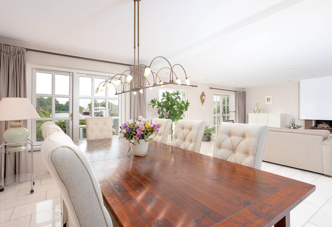 De heerlijk lichte en royale woonkamer nodigt uit voor gezellig samenzijn. Of het nu gaat om een drankje bij de haard of een gezellig diner met familie of vrienden aan een grote tafel, deze woning biedt daar volop mogelijkheid voor. Een enthousiaste kok kan prima overweg met de ruime keuken die voorzien is van een lang aanrechtblad, veel kastruimte en diverse inbouwapparatuur. Vele grote raampartijen zorgen voor veel natuurlijke lichtinval enerzijds en een fraai uitzicht over het water en het landschap anderzijds.