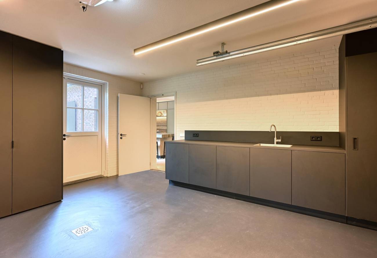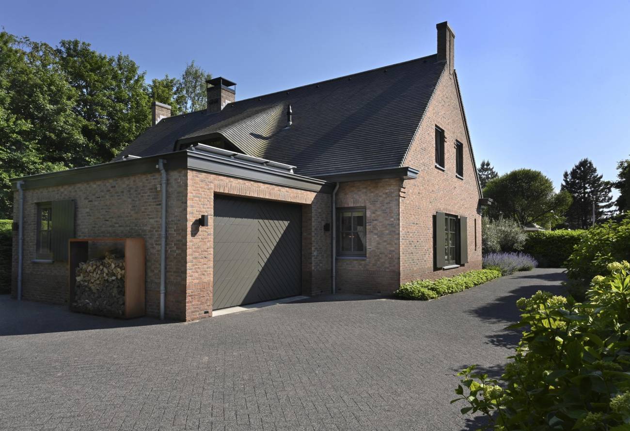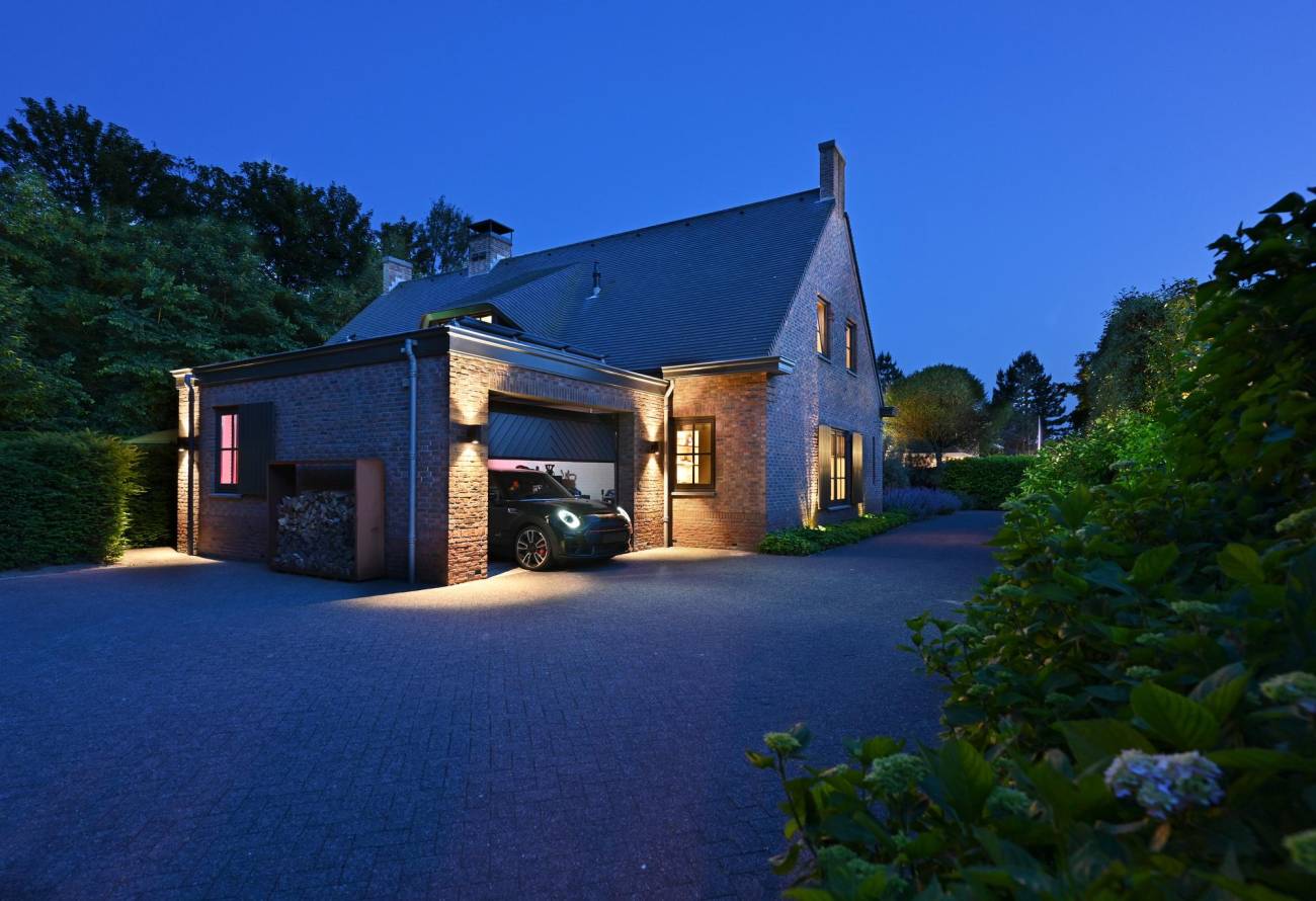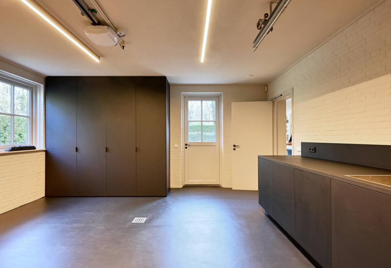 De grandioze entree verwelkomt u met een ruime hal, voorzien van een garderobe en gastentoilet. De woonkamer, verlicht door natuurlijk licht dat door overvloedige raampartijen stroomt, biedt een gezellige open haard en openslaande deuren die uitkijken op de rijke tuin. De gastronomische keuken, compleet met kookeiland en overvloedige opbergruimte, vormt het hart van het huis en opent naar een zonovergoten terras, omgeven door een prachtig aangelegde tuin. Een doorgang leidt naar de garage/bijkeuken, met een eigen achterdeur voor ultieme functionaliteit.