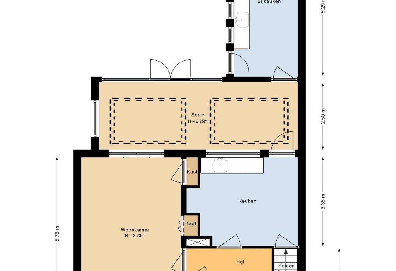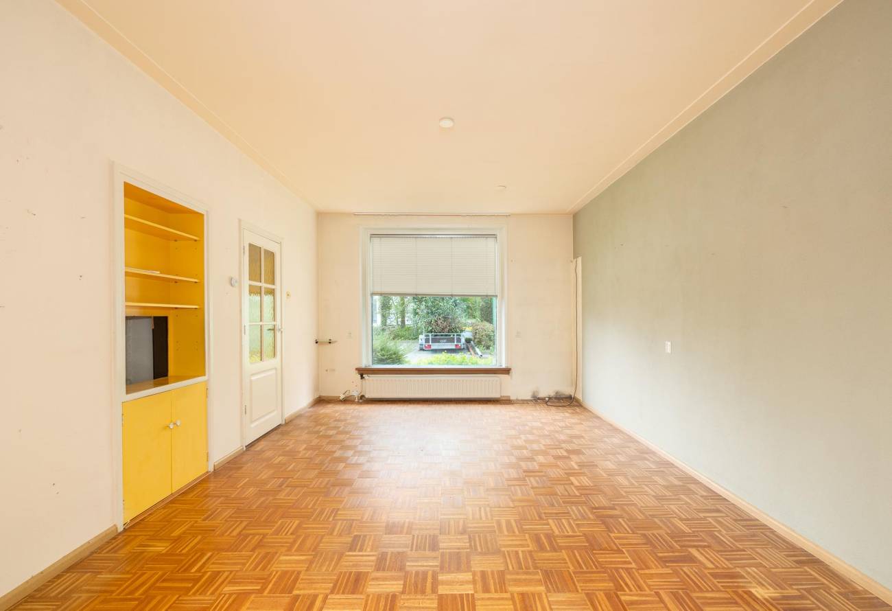 Hal, gang, lichte doorzonwoonkamer met mozaïek parketvloer, 2 vaste kasten en schuifpui naar serrekamer. Serrekamer met vloertegel en dubbele deuren naar de tuin, grote keuken met eenvoudige inrichting en toegang naar de verdiepte kelderkast, aangebouwde bijkeuken/berging.