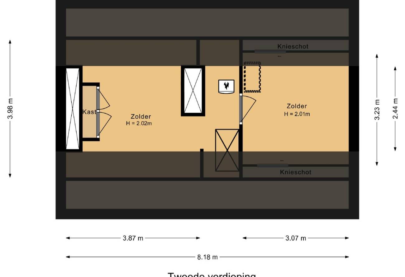 Met een steektrap is deze verdieping te bereiken en deze is verdeeld in twee ruimten, beide met een dakraam. Verder is op deze etage de cv combiketel opgesteld.