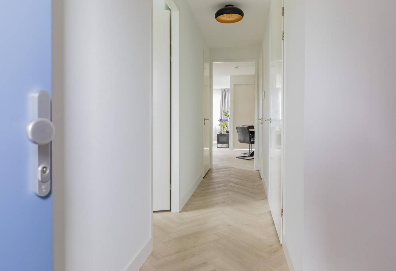 Bij binnenkomst valt meteen de ruime hal en de prachtige wit eiken in visgraat gelegde pvc vloer op. Deze fraaie vloer en de vloerverwarming zijn in 2021 in het gehele appartement aangebracht.