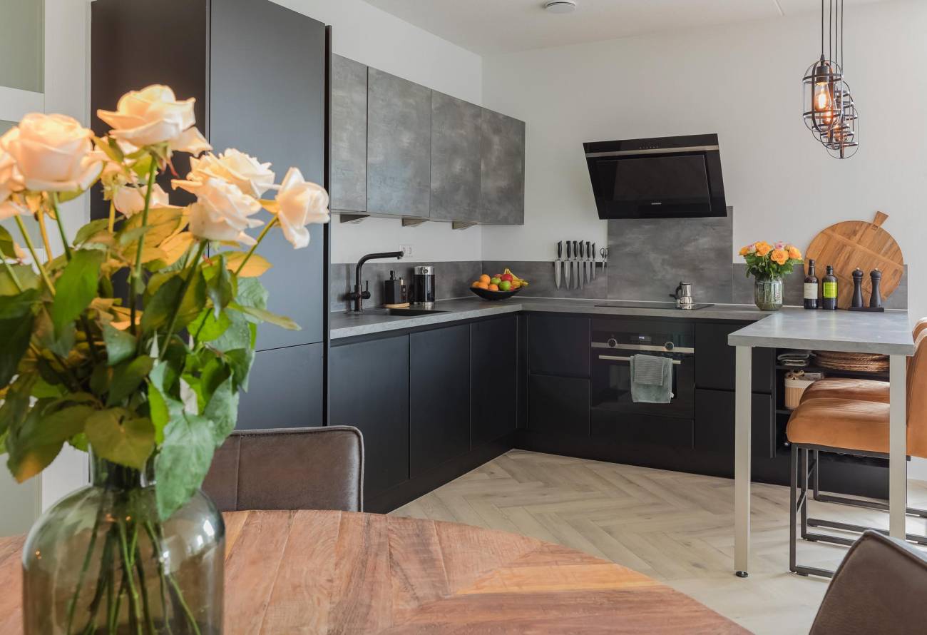 De moderne open hoekkeuken is voorzien van alle inbouwapparatuur die je nodig hebt, zoals een vaatwasmachine en combimagnetron.