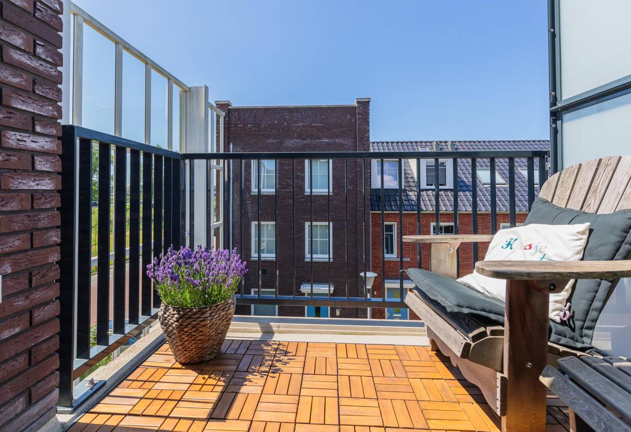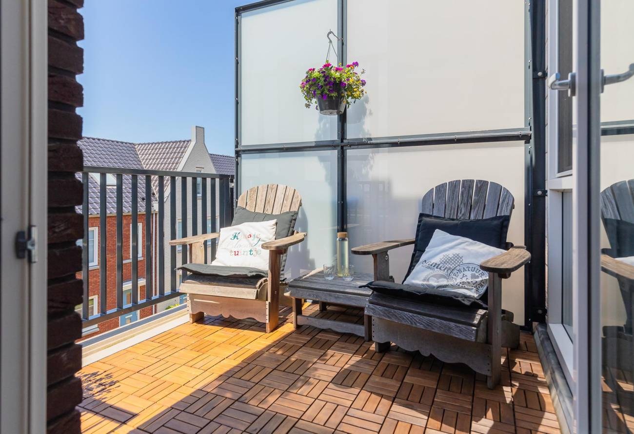 Vanuit de woonkamer stap je op het zonnige balkon, gelegen op het westen. Het geluidsscherm zorgt voor een rustige buitenruimte, ideaal om te ontspannen. Aan de andere zijde van het appartement kan je heerlijk loungen op een te warme dag.