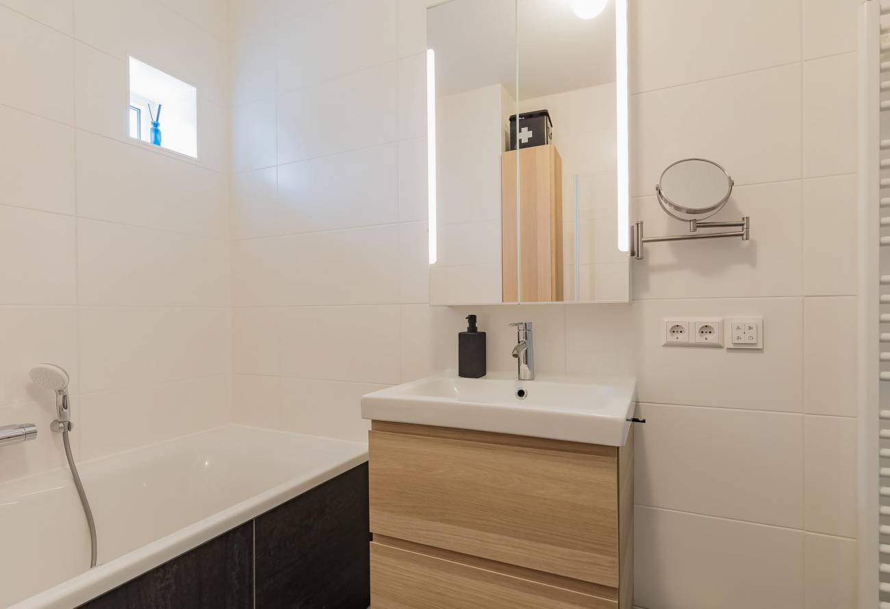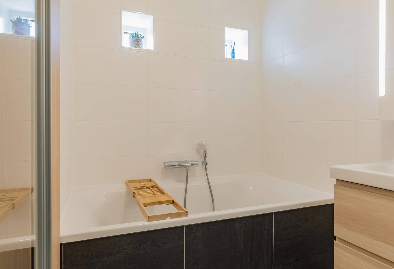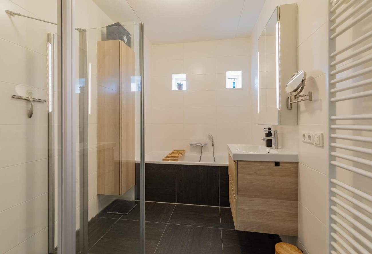 De moderne badkamer is voorzien van vloerverwarming, een ligbad, aparte douche, wastafelmeubel en handdoekenradiator. Twee speelse ramen zorgen voor extra lichtinval. Het aparte toilet is ook modern afgewerkt.