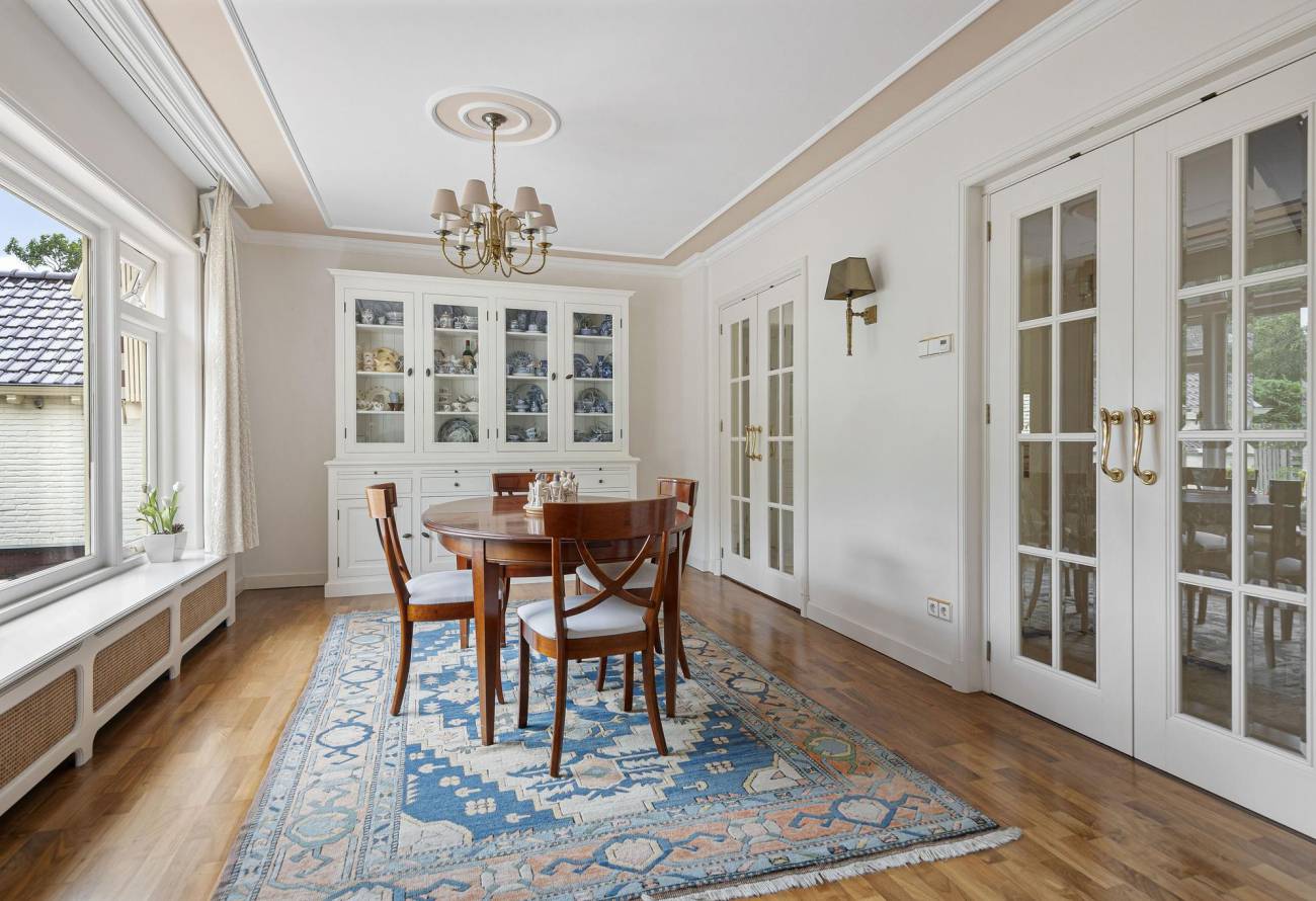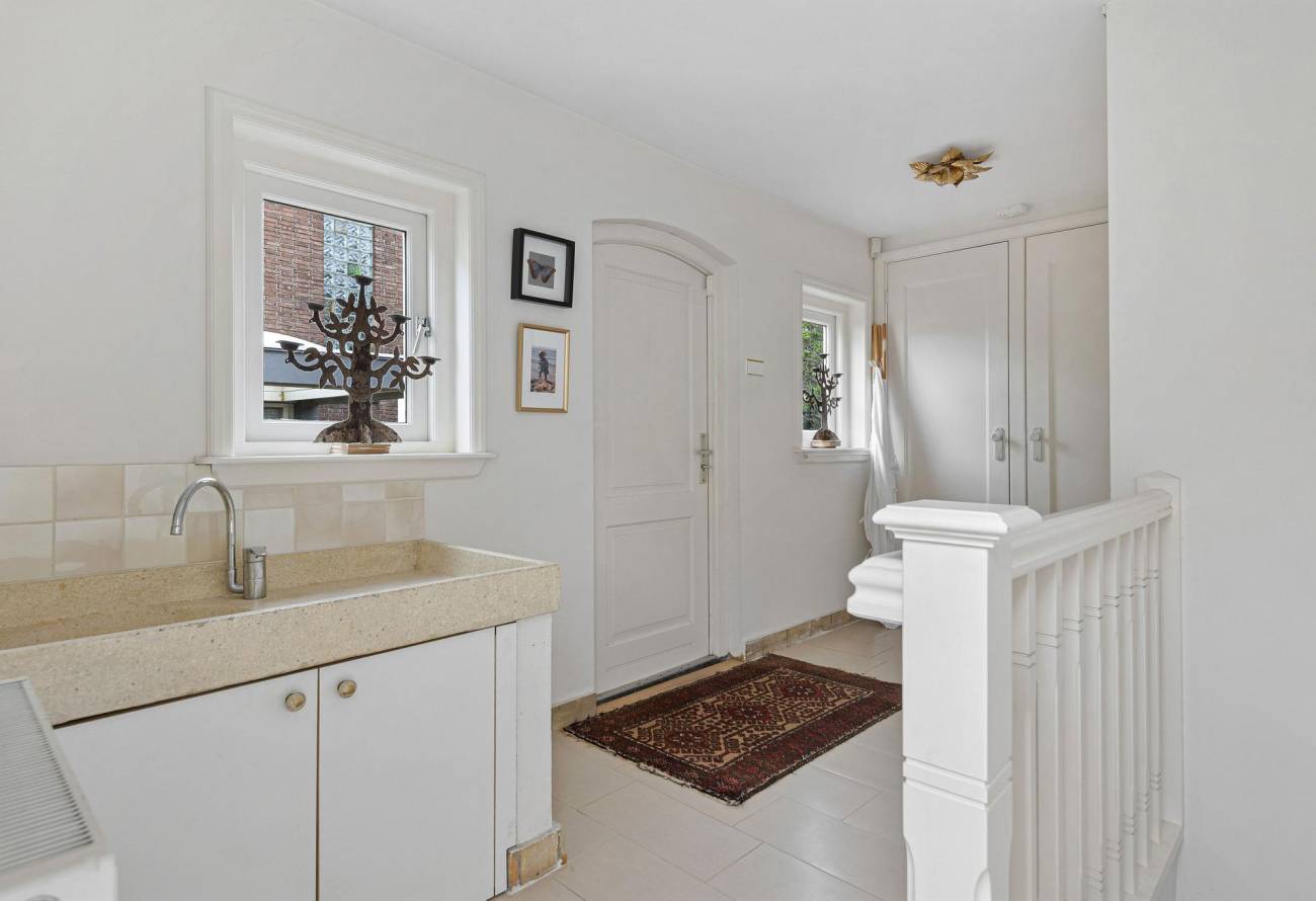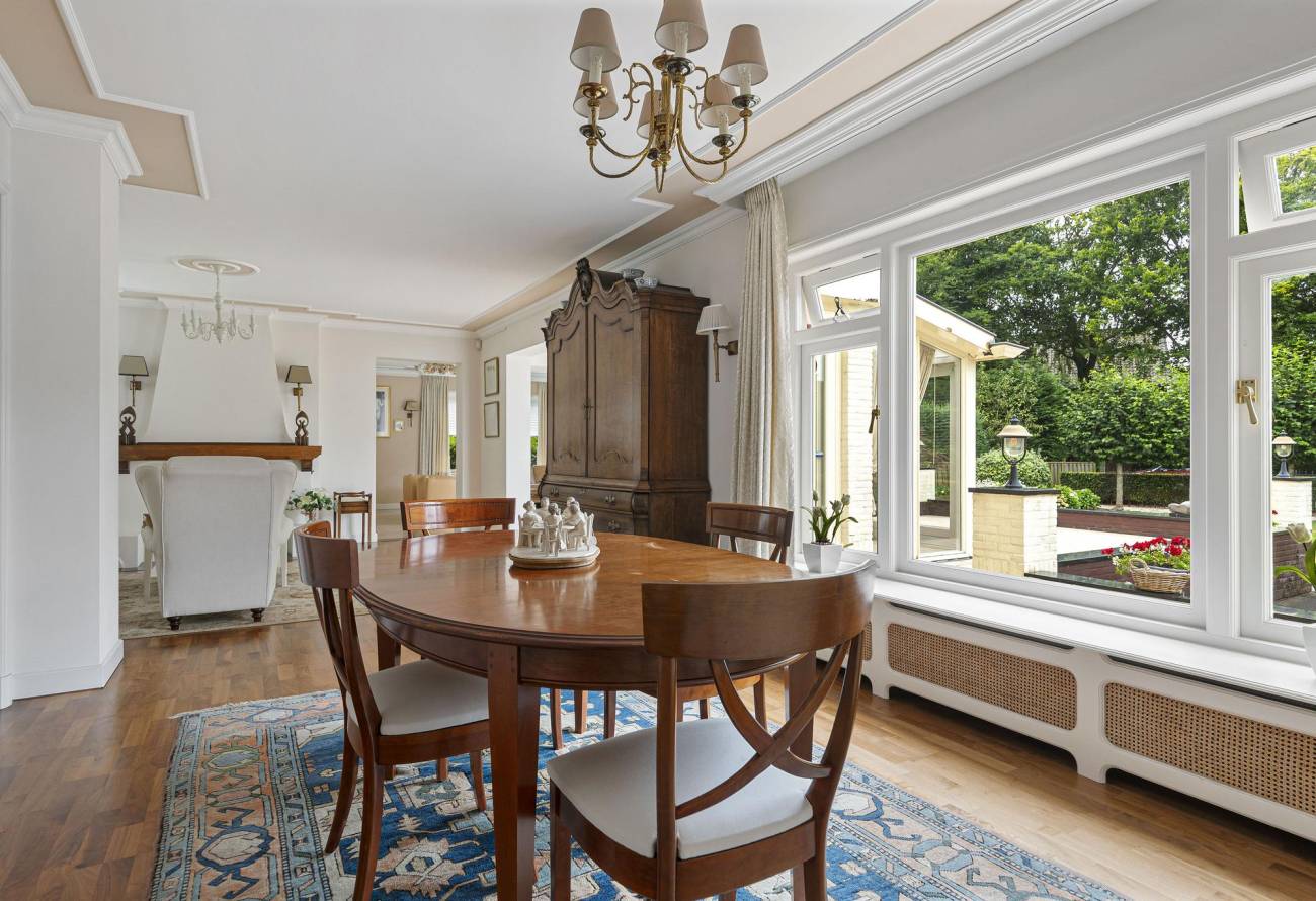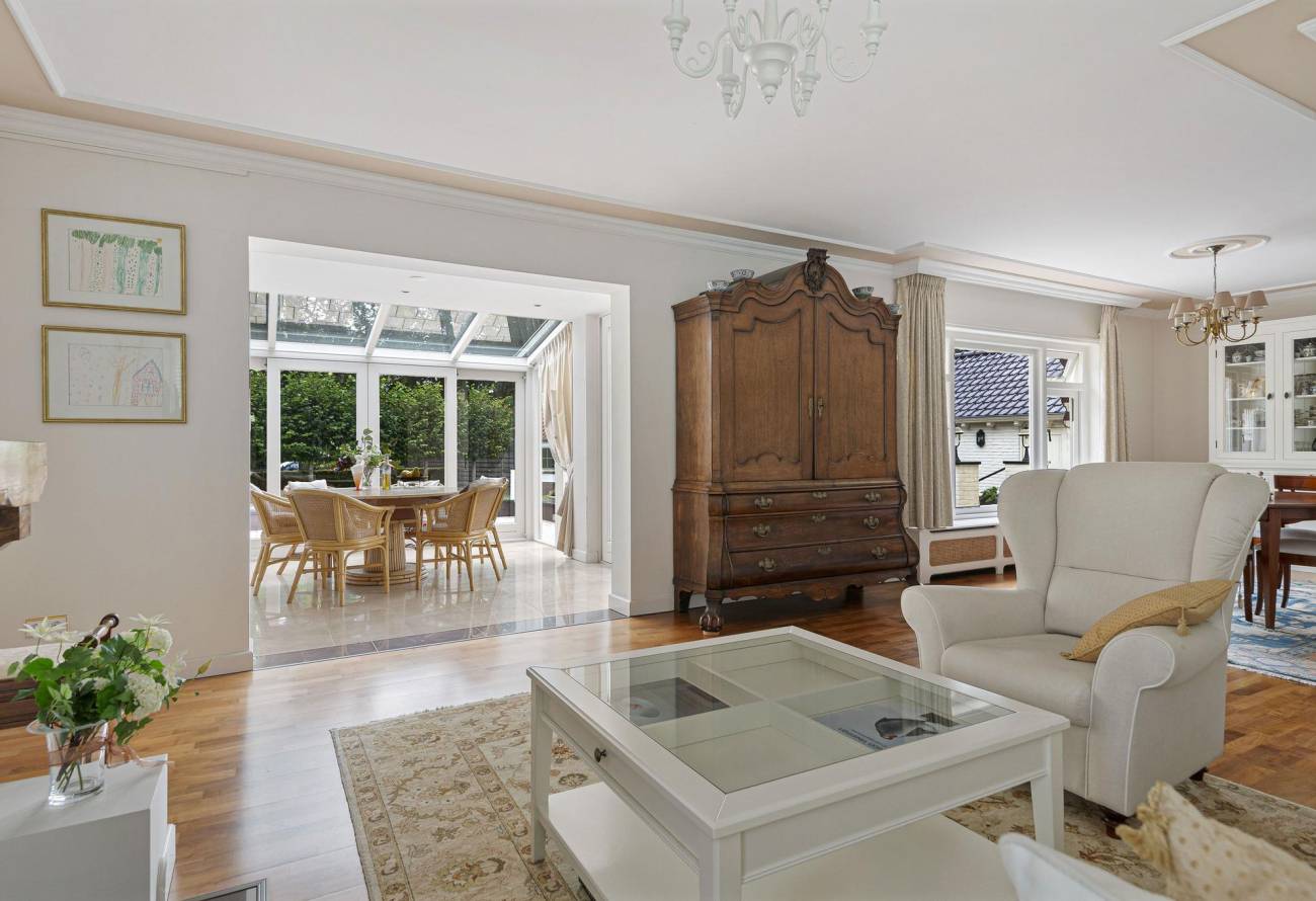 Entree in zeer ruime hal, sfeervolle glas in lood ramen, toilet en verdiepte garderobe. De woonkamer is opgesteld in L-vorm, heeft veel lichtinval, sfeervolle gashaard en is voorzien van een prachtige houten parketvloer. De serre en tweede woonkamer zijn later aangebouwd waardoor er veel extra ruimte is gecreëerd welke meerdere mogelijkheden geven. De serre en tweede woonkamer zijn voorzien van een nette tegelvloer met vloerverwarming. De keuken is gelegen aan de voorzijde van de woning welke tevens toegang biedt tot de ruime bijkeuken.