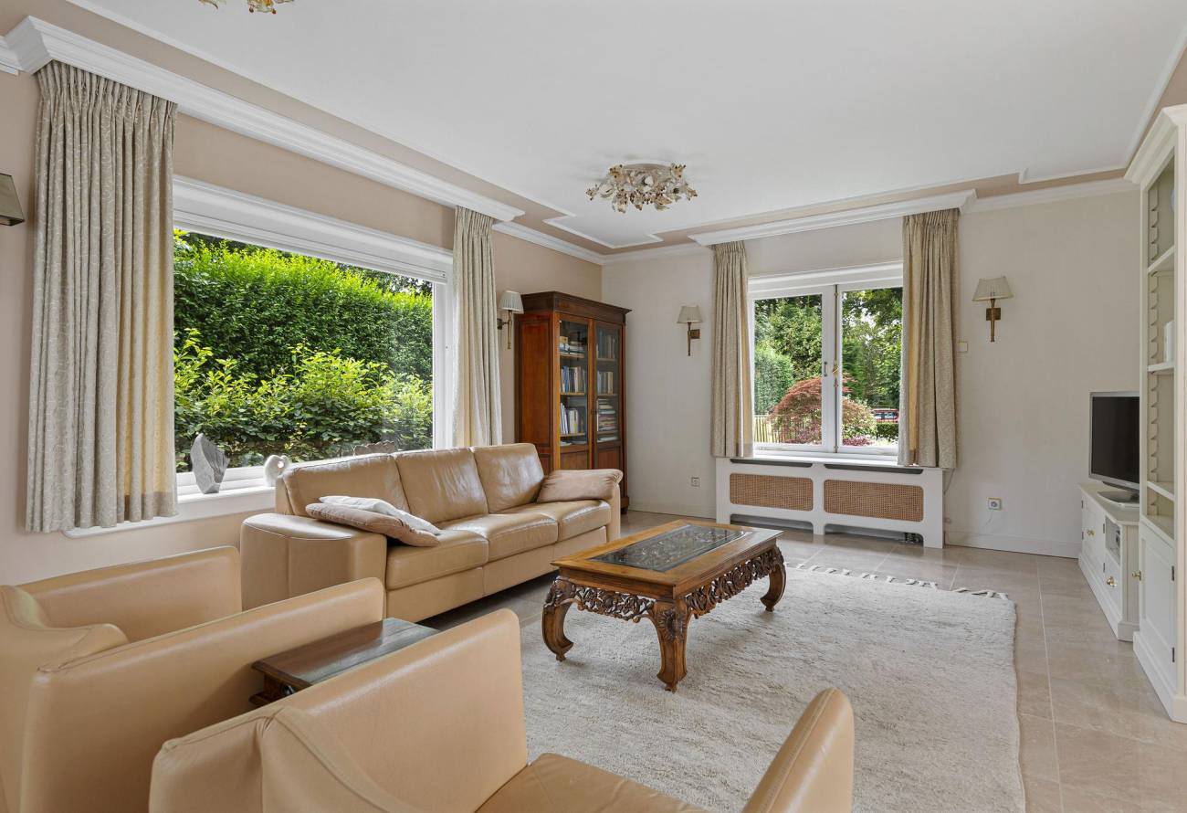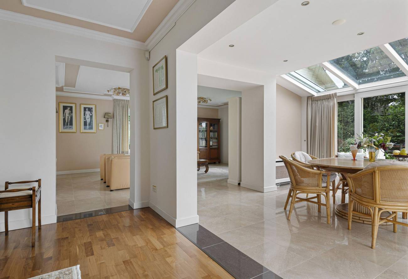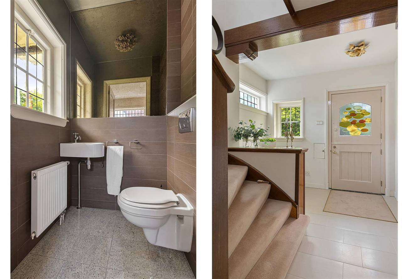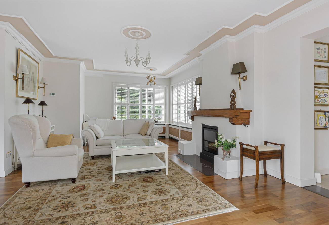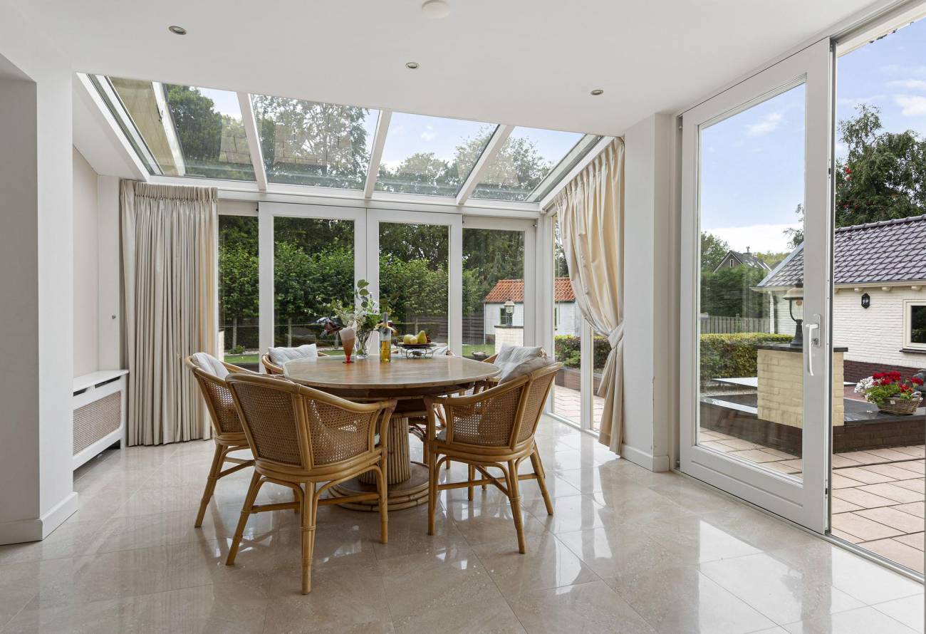Entree in zeer ruime hal, sfeervolle glas in lood ramen, toilet en verdiepte garderobe. De woonkamer is opgesteld in L-vorm, heeft veel lichtinval, sfeervolle gashaard en is voorzien van een prachtige houten parketvloer. De serre en tweede woonkamer zijn later aangebouwd waardoor er veel extra ruimte is gecreëerd welke meerdere mogelijkheden geven. De serre en tweede woonkamer zijn voorzien van een nette tegelvloer met vloerverwarming. De keuken is gelegen aan de voorzijde van de woning welke tevens toegang biedt tot de ruime bijkeuken.