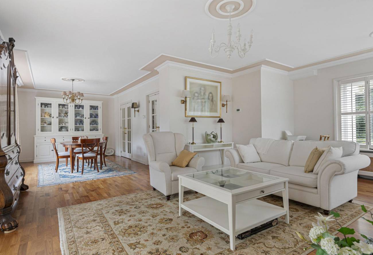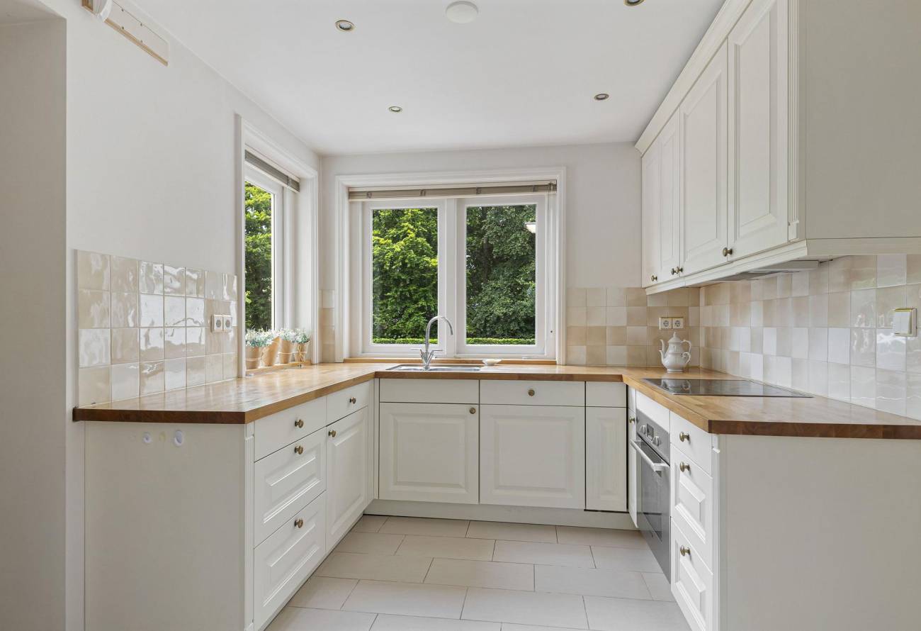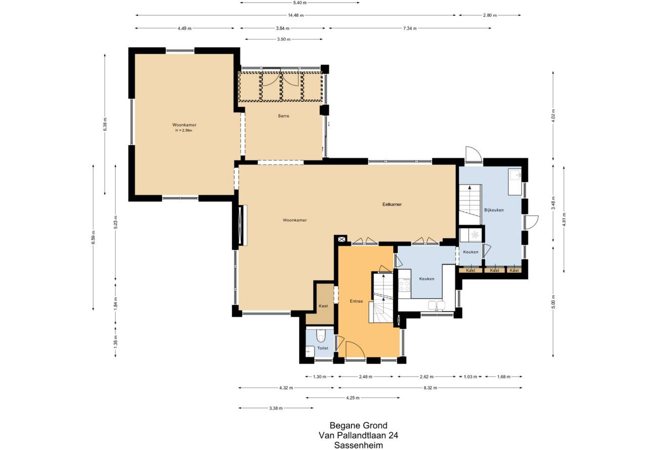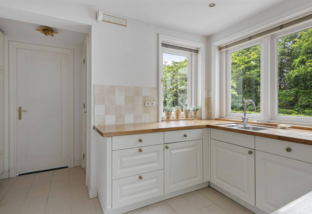 Entree in zeer ruime hal, sfeervolle glas in lood ramen, toilet en verdiepte garderobe. De woonkamer is opgesteld in L-vorm, heeft veel lichtinval, sfeervolle gashaard en is voorzien van een prachtige houten parketvloer. De serre en tweede woonkamer zijn later aangebouwd waardoor er veel extra ruimte is gecreëerd welke meerdere mogelijkheden geven. De serre en tweede woonkamer zijn voorzien van een nette tegelvloer met vloerverwarming. De keuken is gelegen aan de voorzijde van de woning welke tevens toegang biedt tot de ruime bijkeuken.