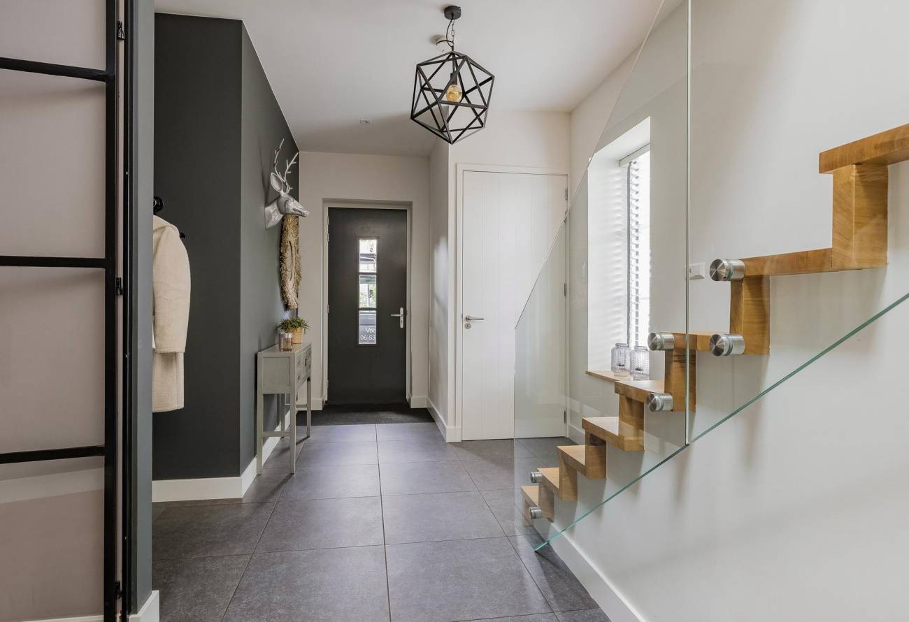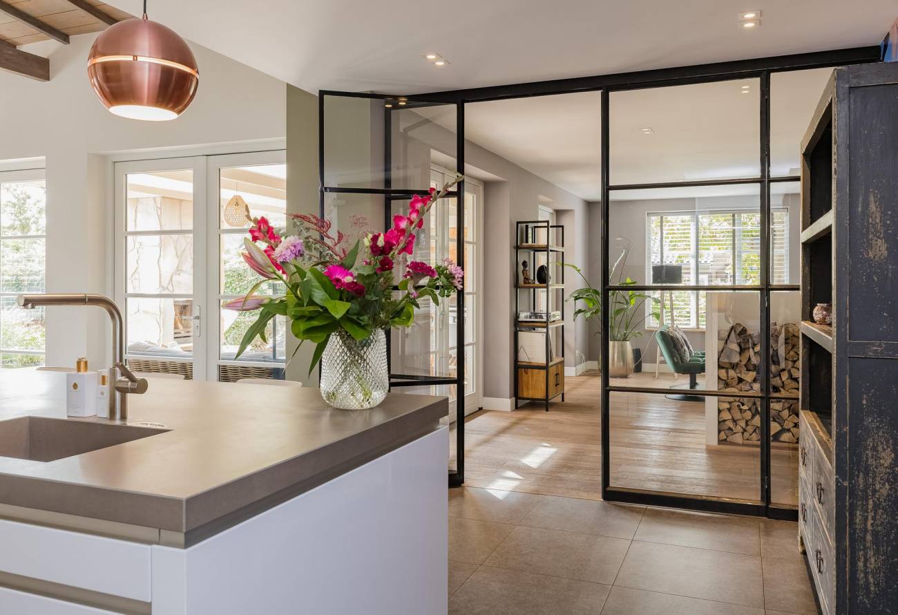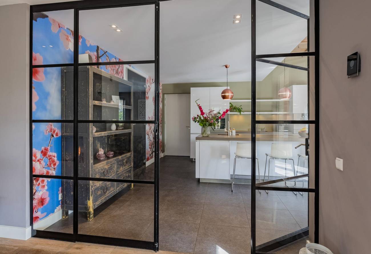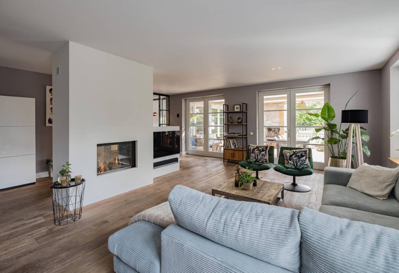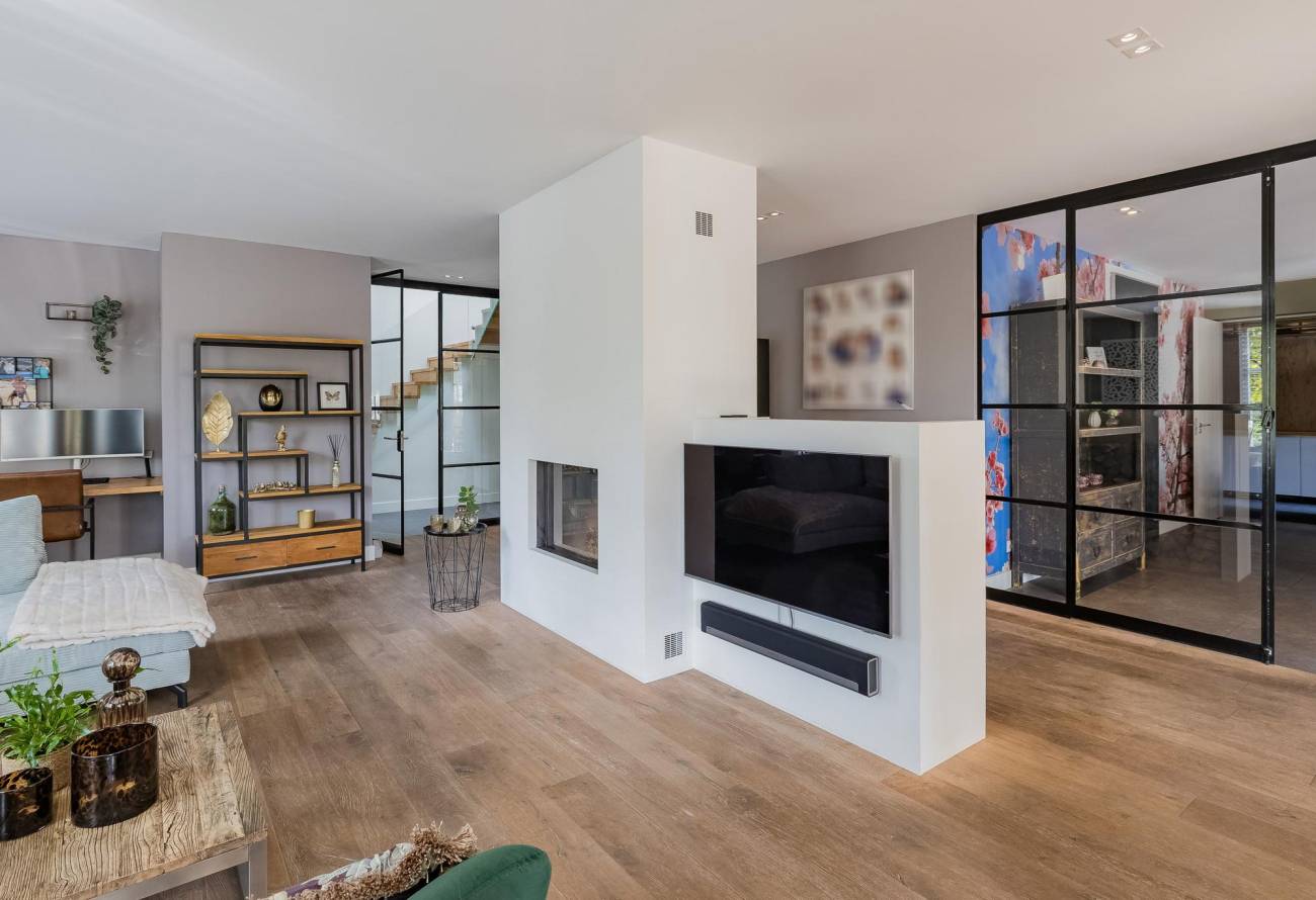 Via entree aan de voorzijde kom je in de zeer ruime hal met toilet, trap naar de etage en prachtige staaldeuren naar de woonkamer. De moderne woonkamer is ruim en licht, met een sfeervolle doorkijk openhaard. Er zijn deuren naar de veranda en tuin en via staaldeuren loop je zo de woonkeuken binnen.