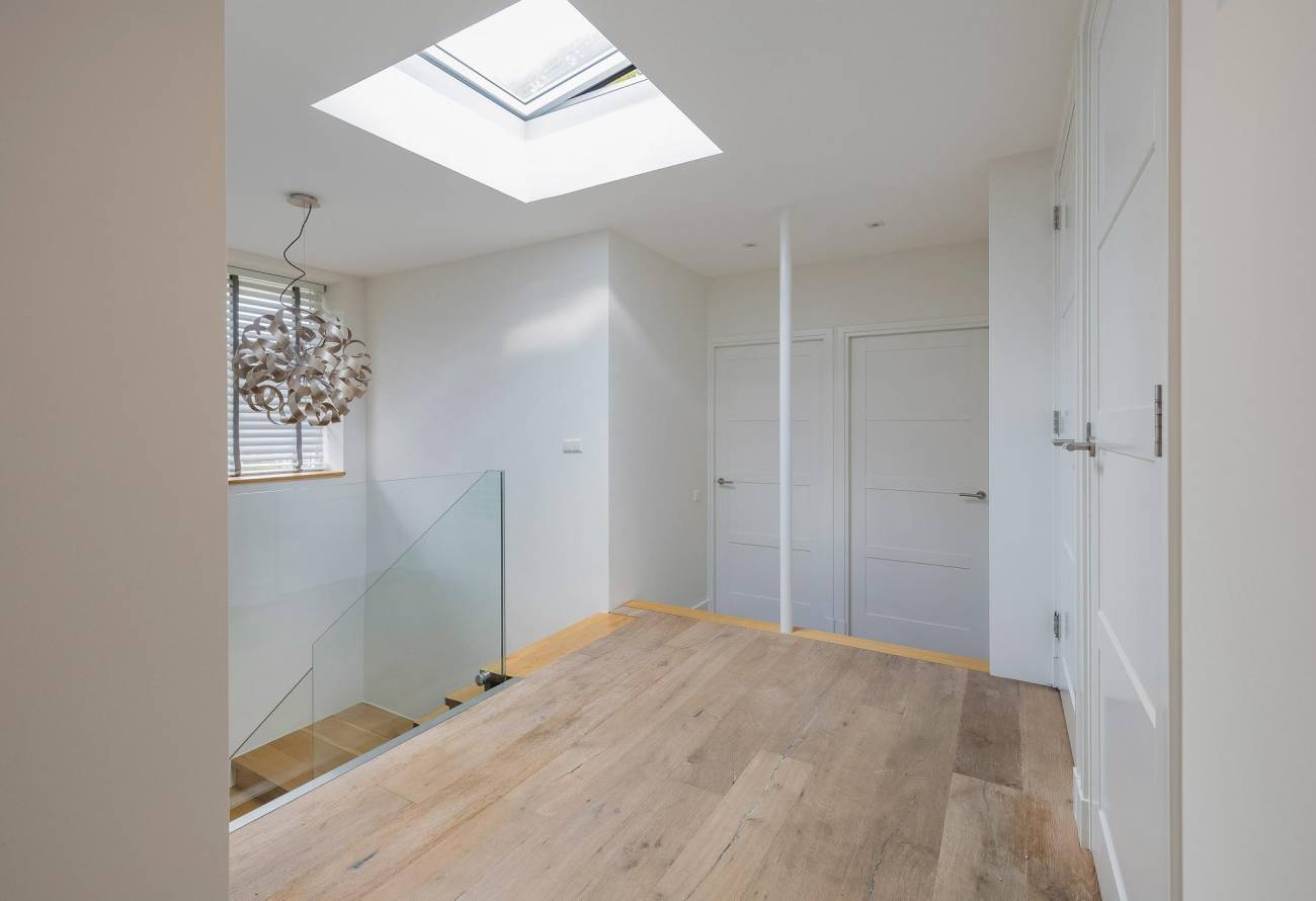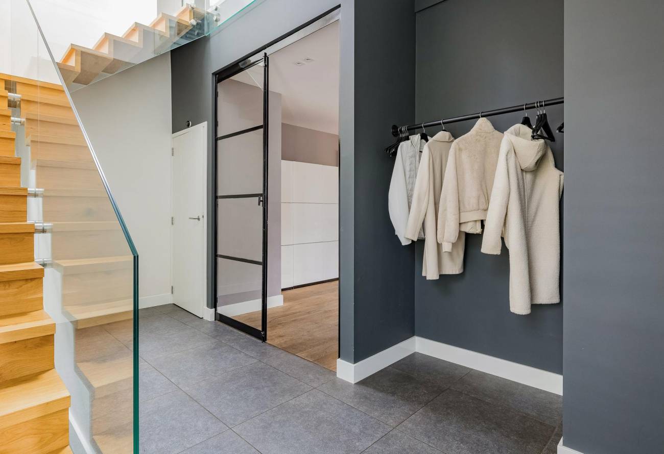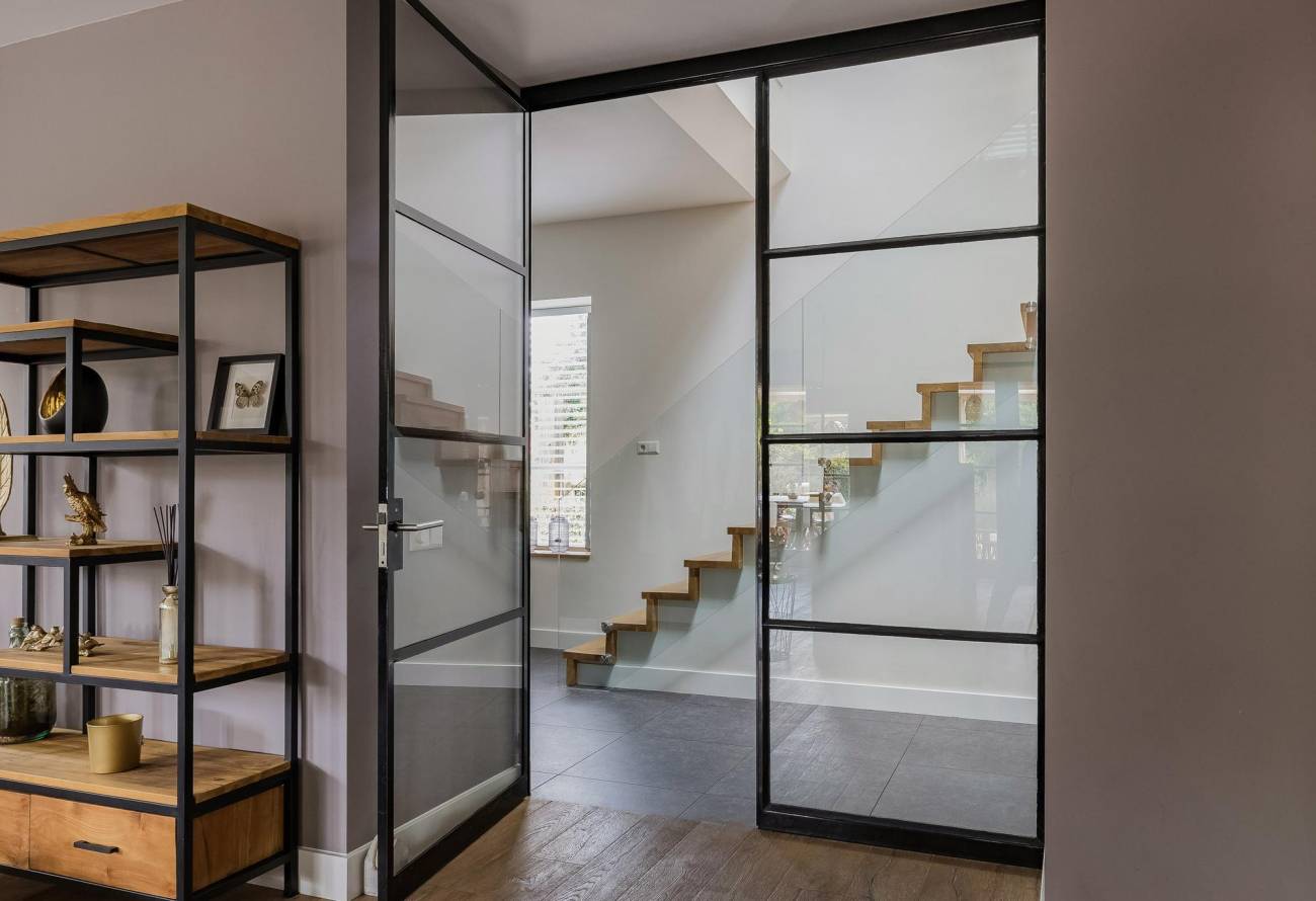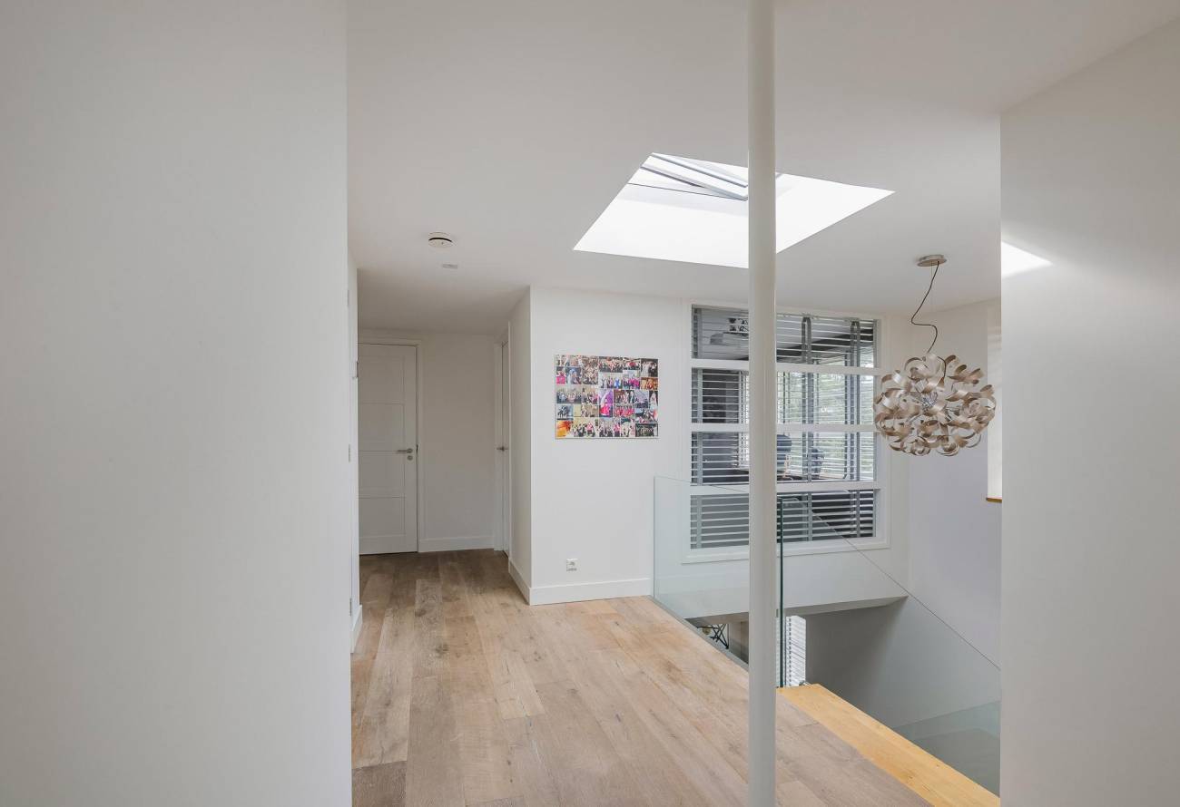 Via entree aan de voorzijde kom je in de zeer ruime hal met toilet, trap naar de etage en prachtige staaldeuren naar de woonkamer. De moderne woonkamer is ruim en licht, met een sfeervolle doorkijk openhaard. Er zijn deuren naar de veranda en tuin en via staaldeuren loop je zo de woonkeuken binnen.