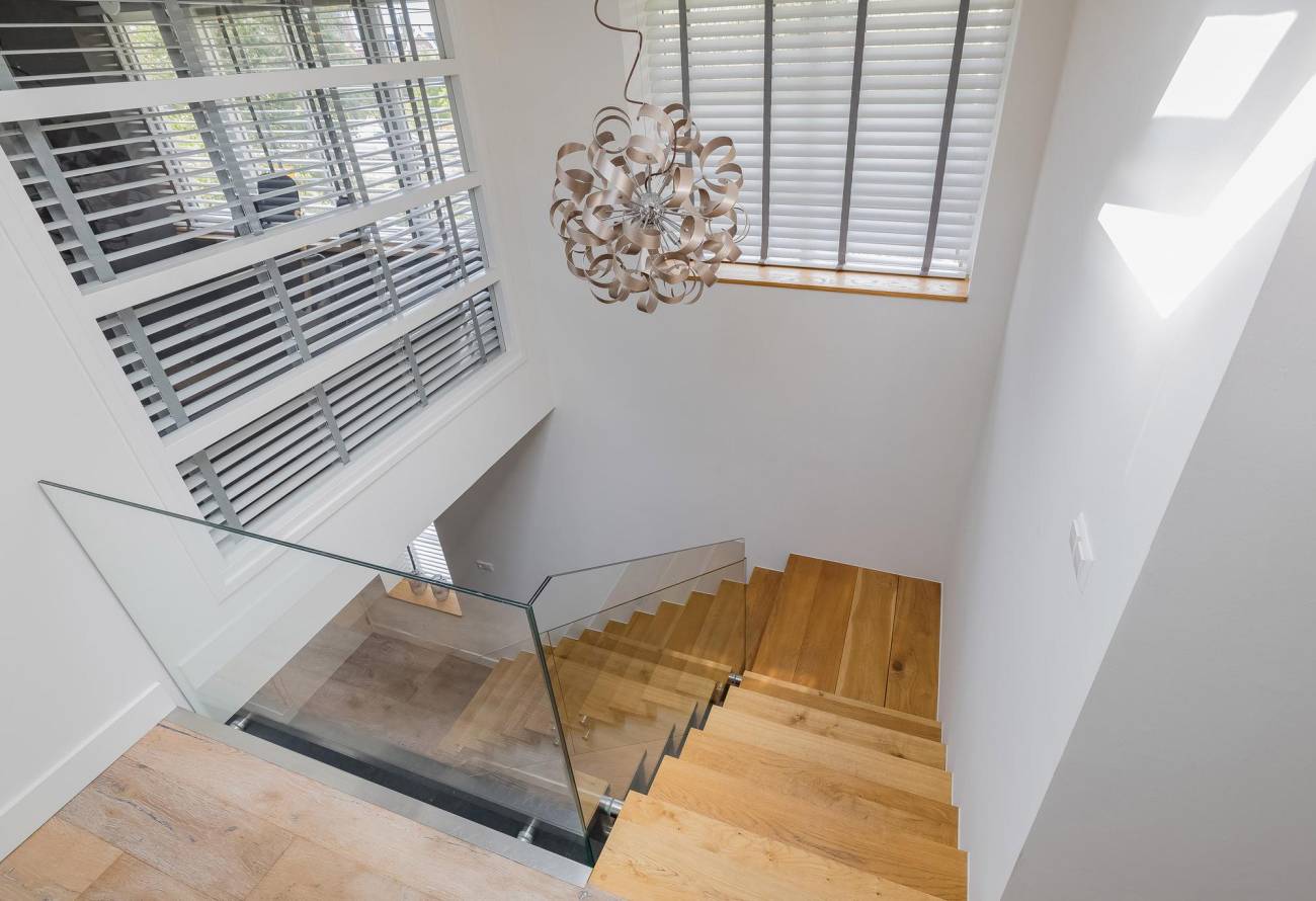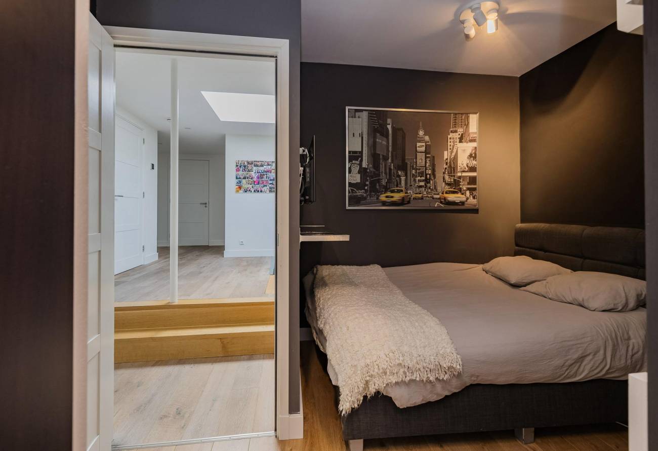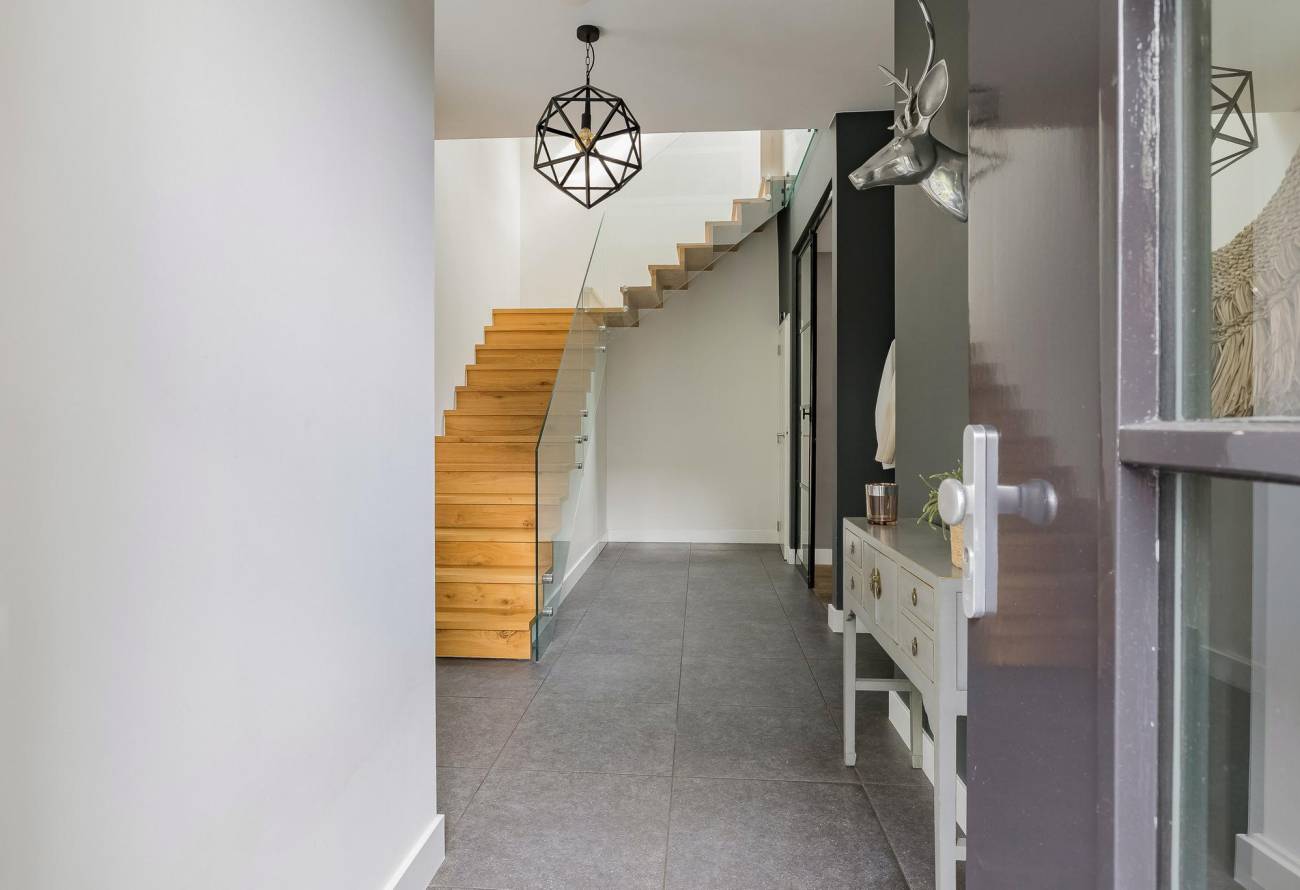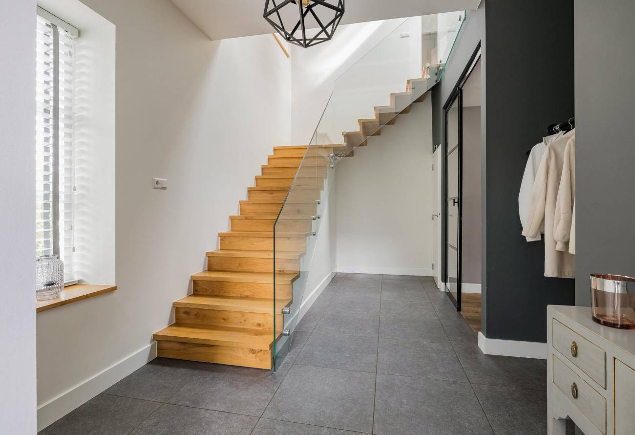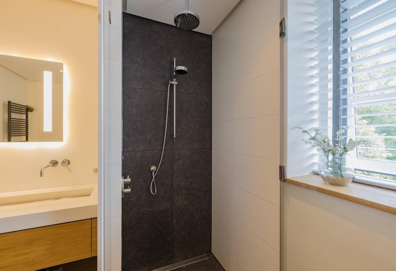 Via entree aan de voorzijde kom je in de zeer ruime hal met toilet, trap naar de etage en prachtige staaldeuren naar de woonkamer. De moderne woonkamer is ruim en licht, met een sfeervolle doorkijk openhaard. Er zijn deuren naar de veranda en tuin en via staaldeuren loop je zo de woonkeuken binnen.