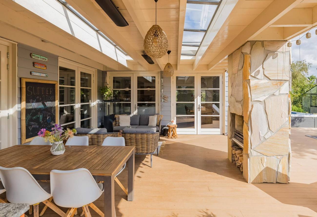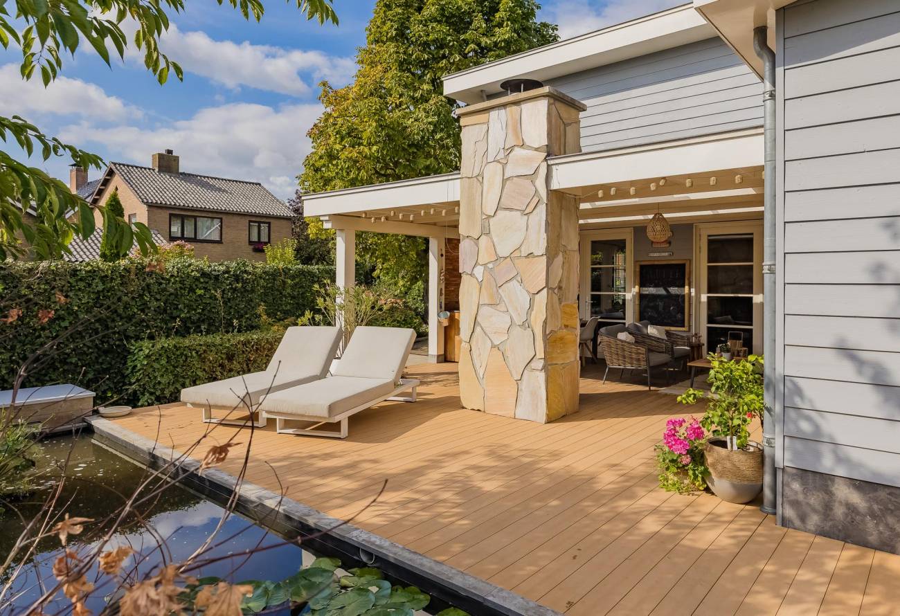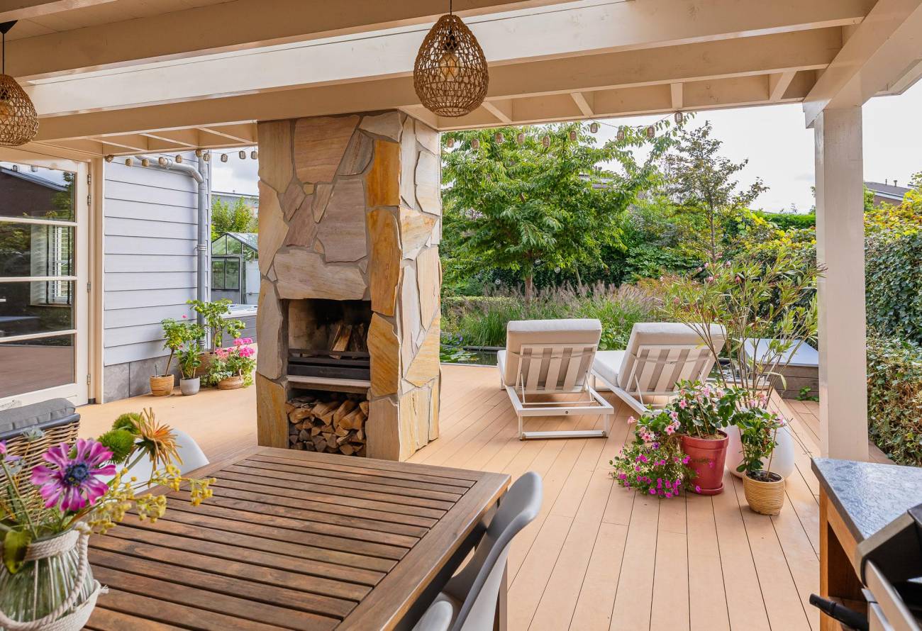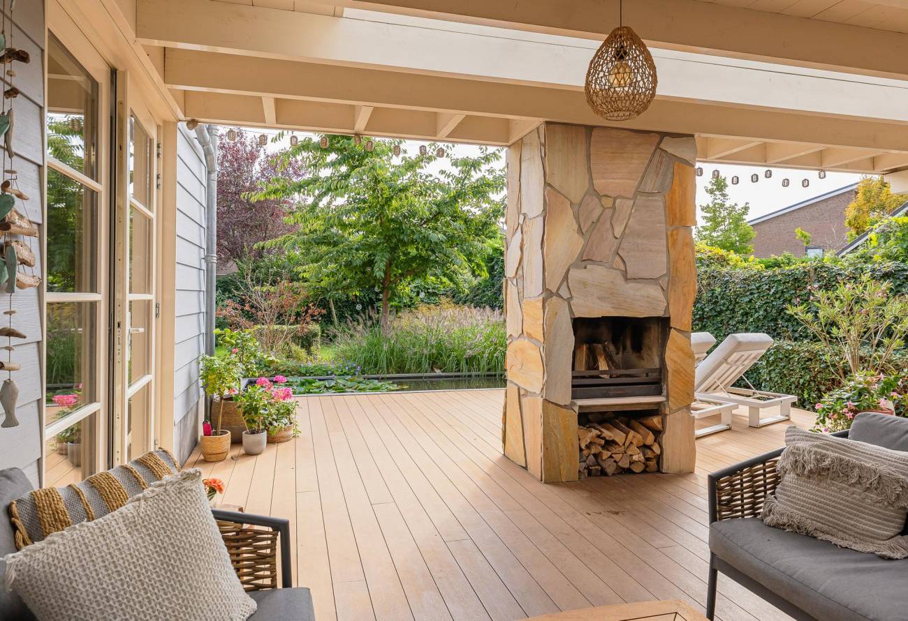 De aangebouwde veranda heeft een openhaard en fijne heaters! Hier geniet je het hele jaar door van het buitenleven en heb je schitterend zicht op de mooi aangelegde tuin.