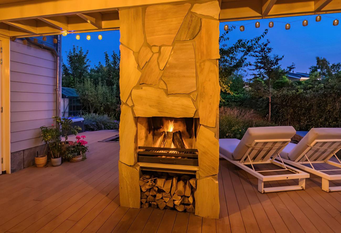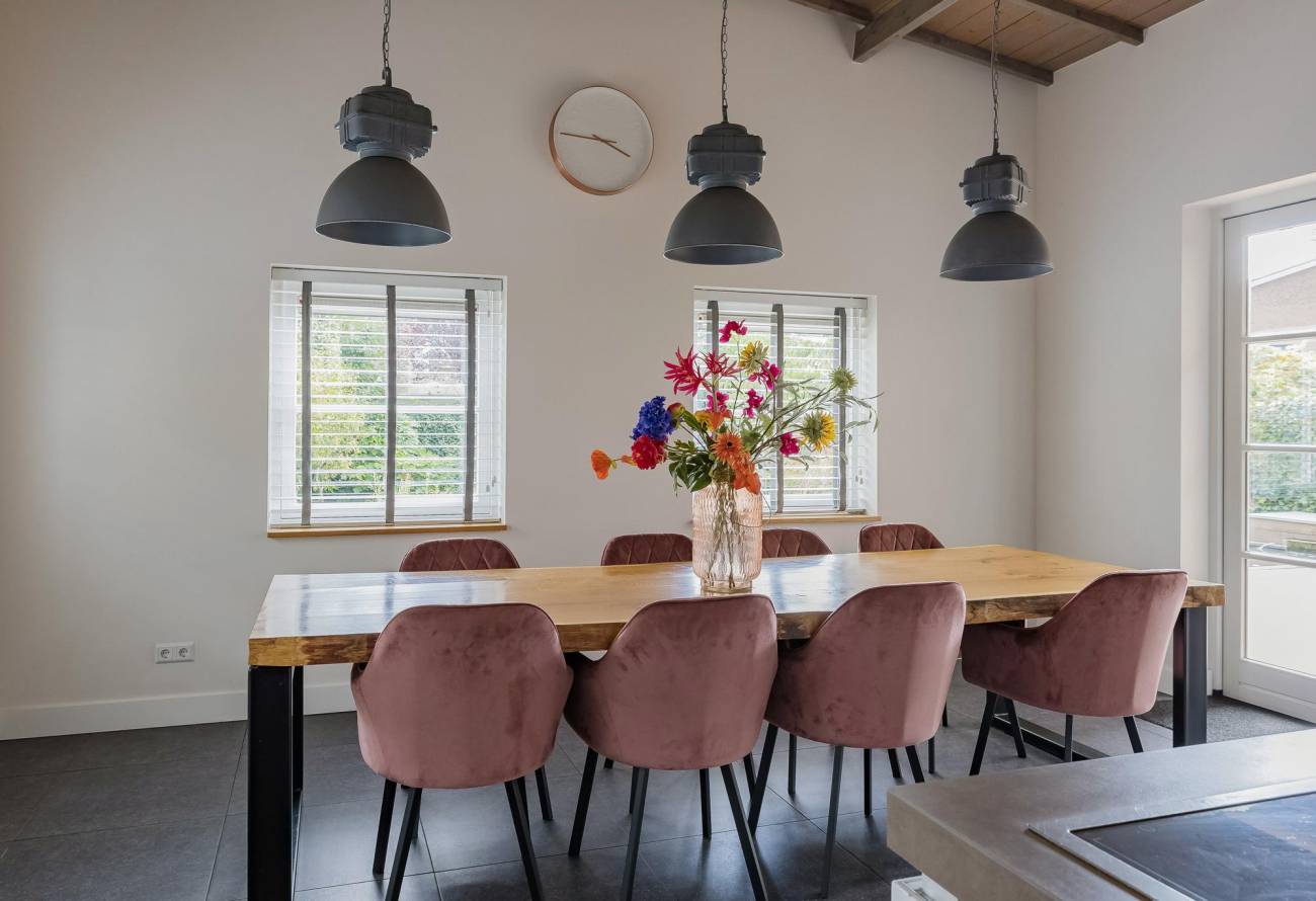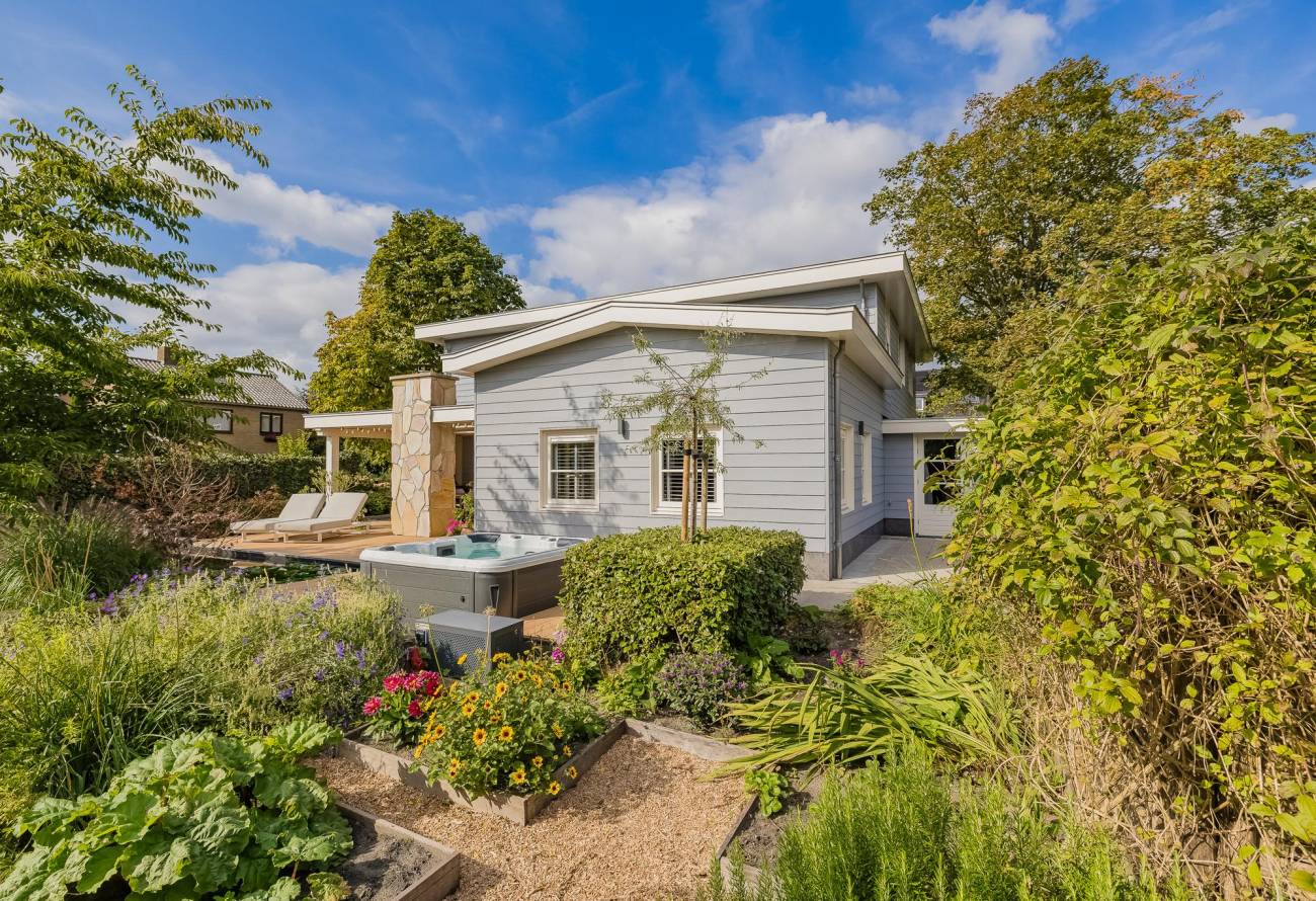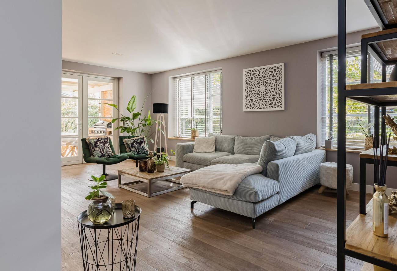 De aangebouwde veranda heeft een openhaard en fijne heaters! Hier geniet je het hele jaar door van het buitenleven en heb je schitterend zicht op de mooi aangelegde tuin.