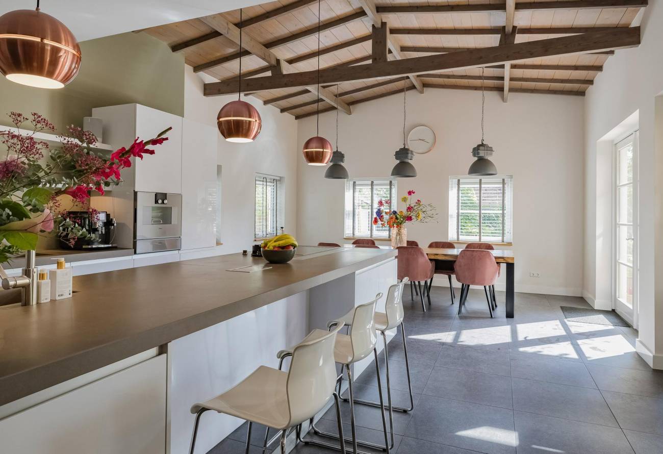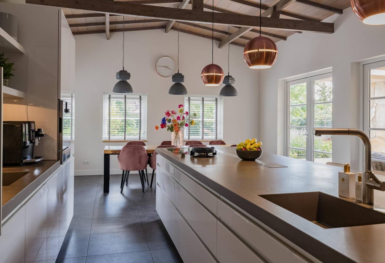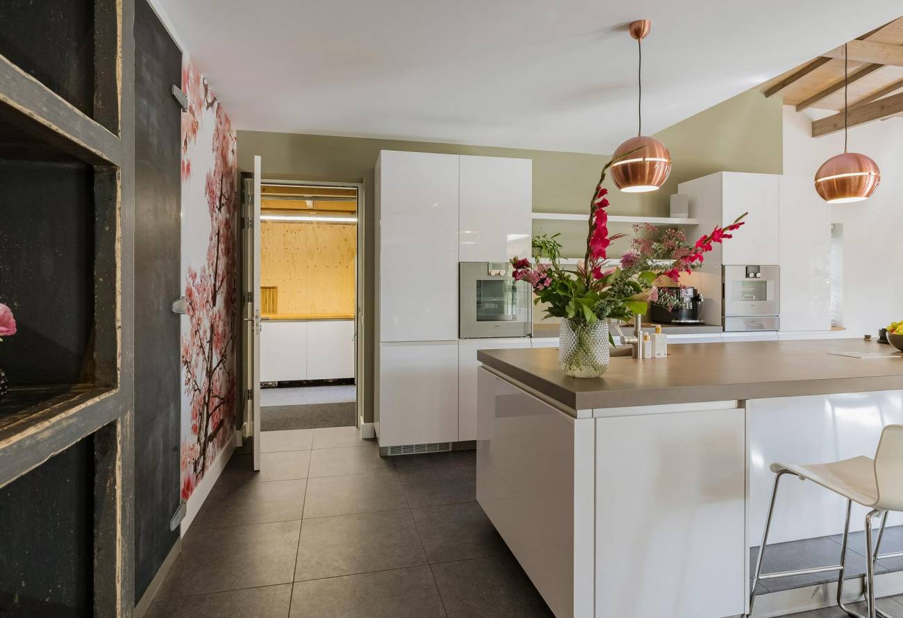 Deze luxe woonkeuken met hoog plafond is een fantastische leefruimte, voorzien van kookeiland en allerhande inbouwapparatuur! Compleet met vloerverwarming die over de gehele begane grond is aangelegd. Er zijn deuren naar de berging/bijkeuken en werkplaats. Ook vanuit de keuken is er toegang tot de veranda.
