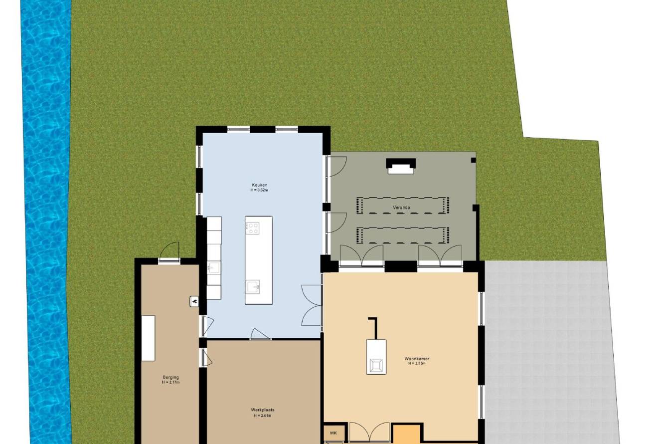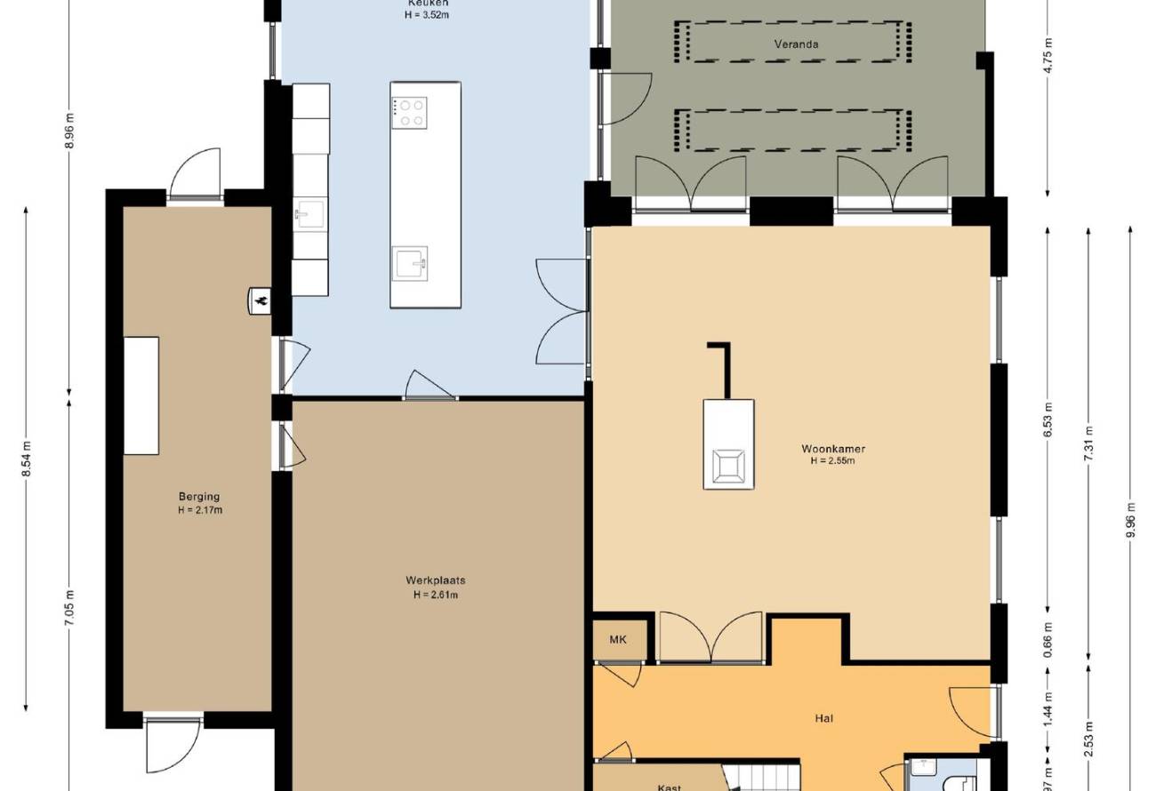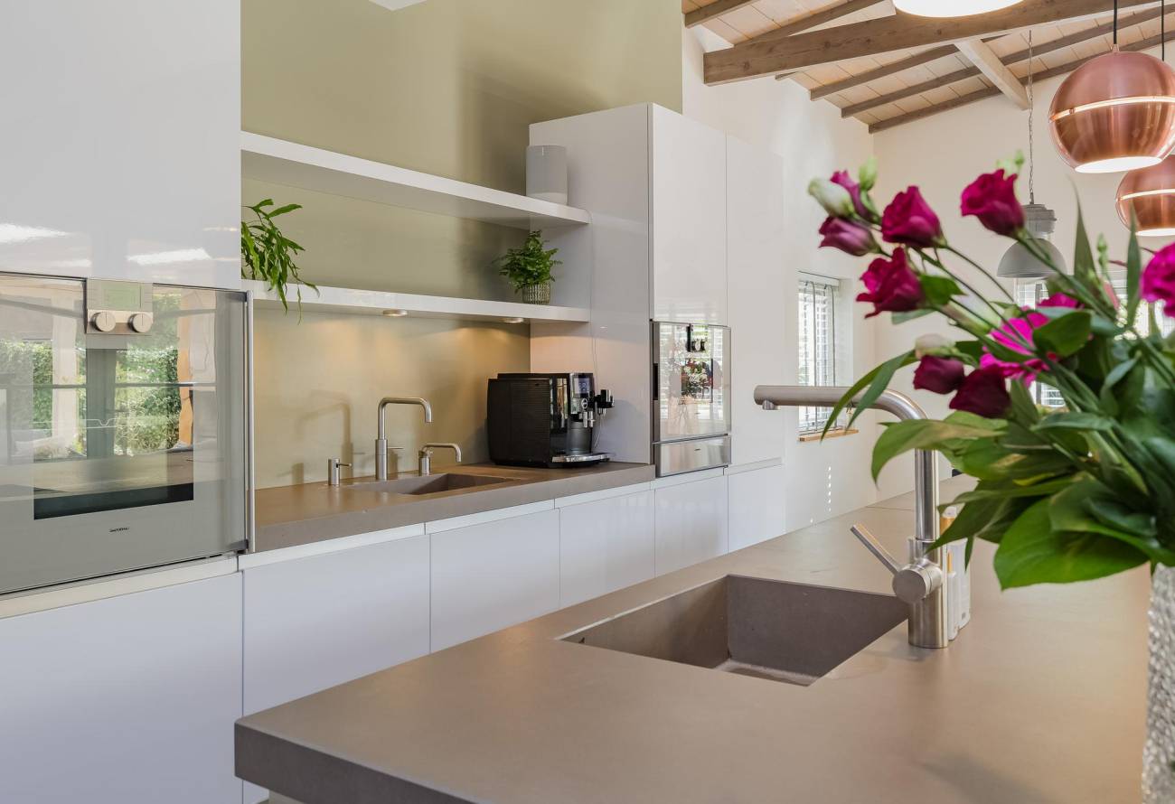 Deze luxe woonkeuken met hoog plafond is een fantastische leefruimte, voorzien van kookeiland en allerhande inbouwapparatuur! Compleet met vloerverwarming die over de gehele begane grond is aangelegd. Er zijn deuren naar de berging/bijkeuken en werkplaats. Ook vanuit de keuken is er toegang tot de veranda.