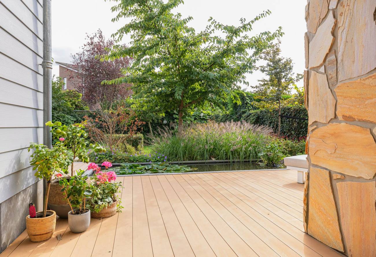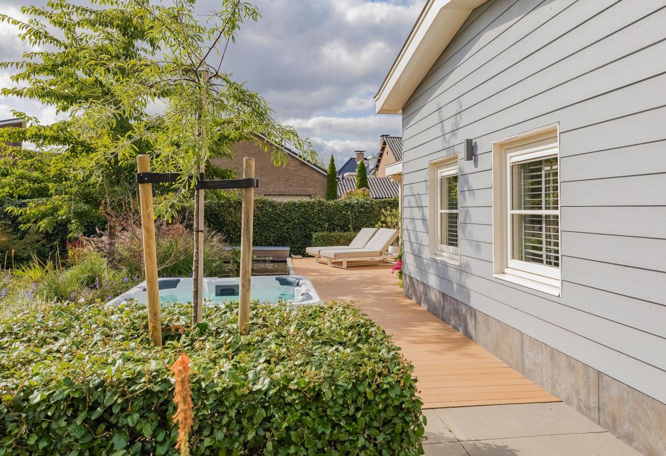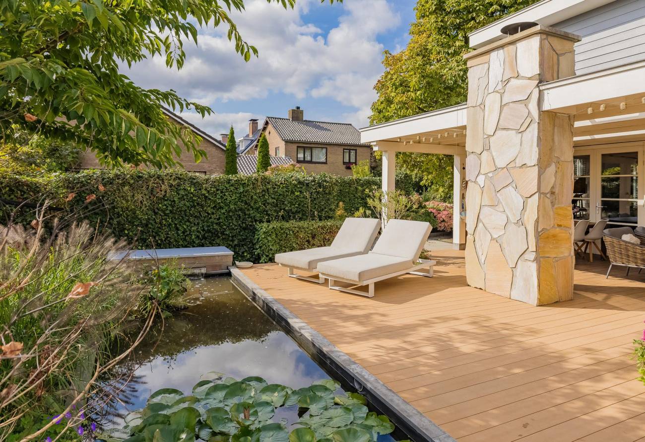 De grote tuin rondom het huis biedt volop privacy, met ruimte om te genieten, te tuinieren of te ontspannen. De Koi karper vijver sluit aan op het terras en in de hoek is een Jacuzzi voor een ontspannend bad.