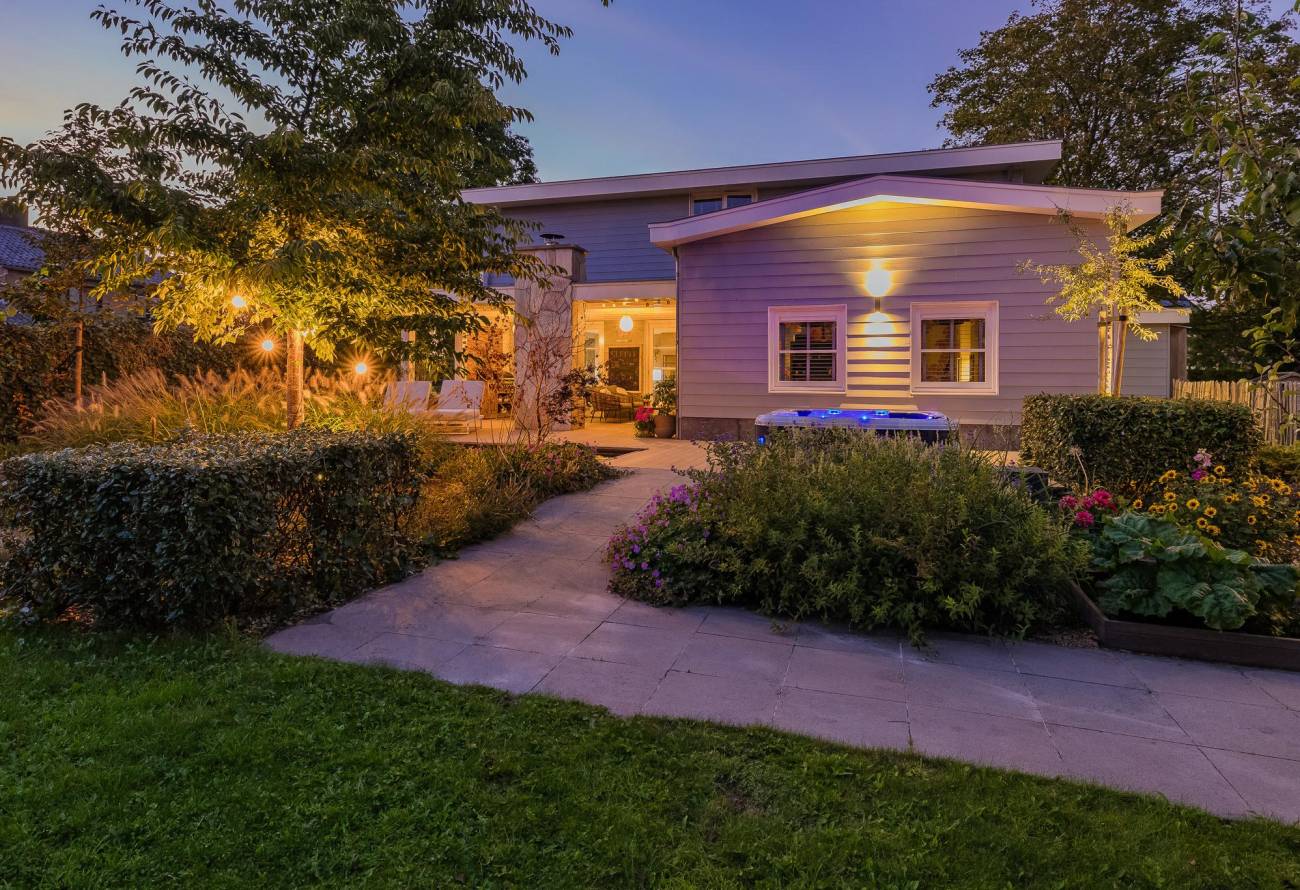 De tuin heeft fraai aangelegde verlichting voor sfeervolle avonden.