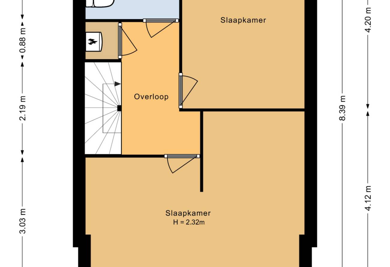 Via de trap naar de 2e verdieping komt u op de overloop welke toegang biedt naar de zeer ruime hoofdslaapkamer aan de achterzijde en de 2e slaapkamer en badkamer aan de voorzijde. Tevens treft u in de kast op de overloop de CV ketel.