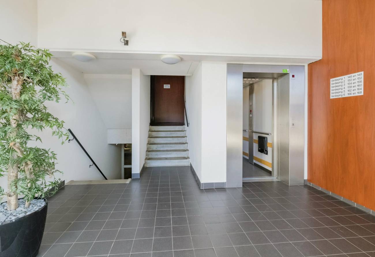 Ruime centrale hal met bellentableau, brievenbussen, lift en trappenhuis.