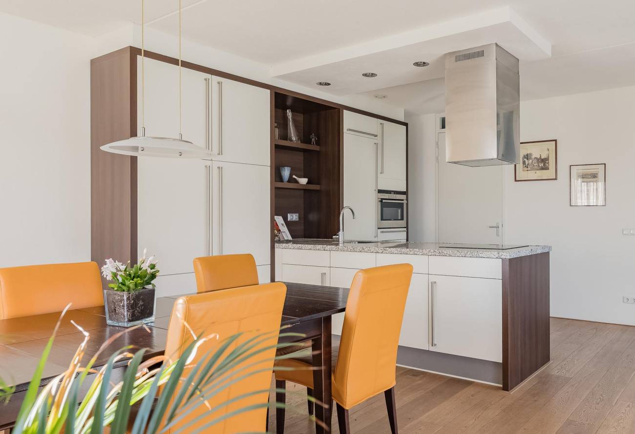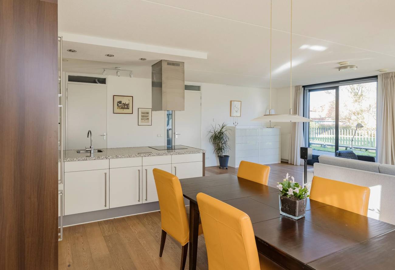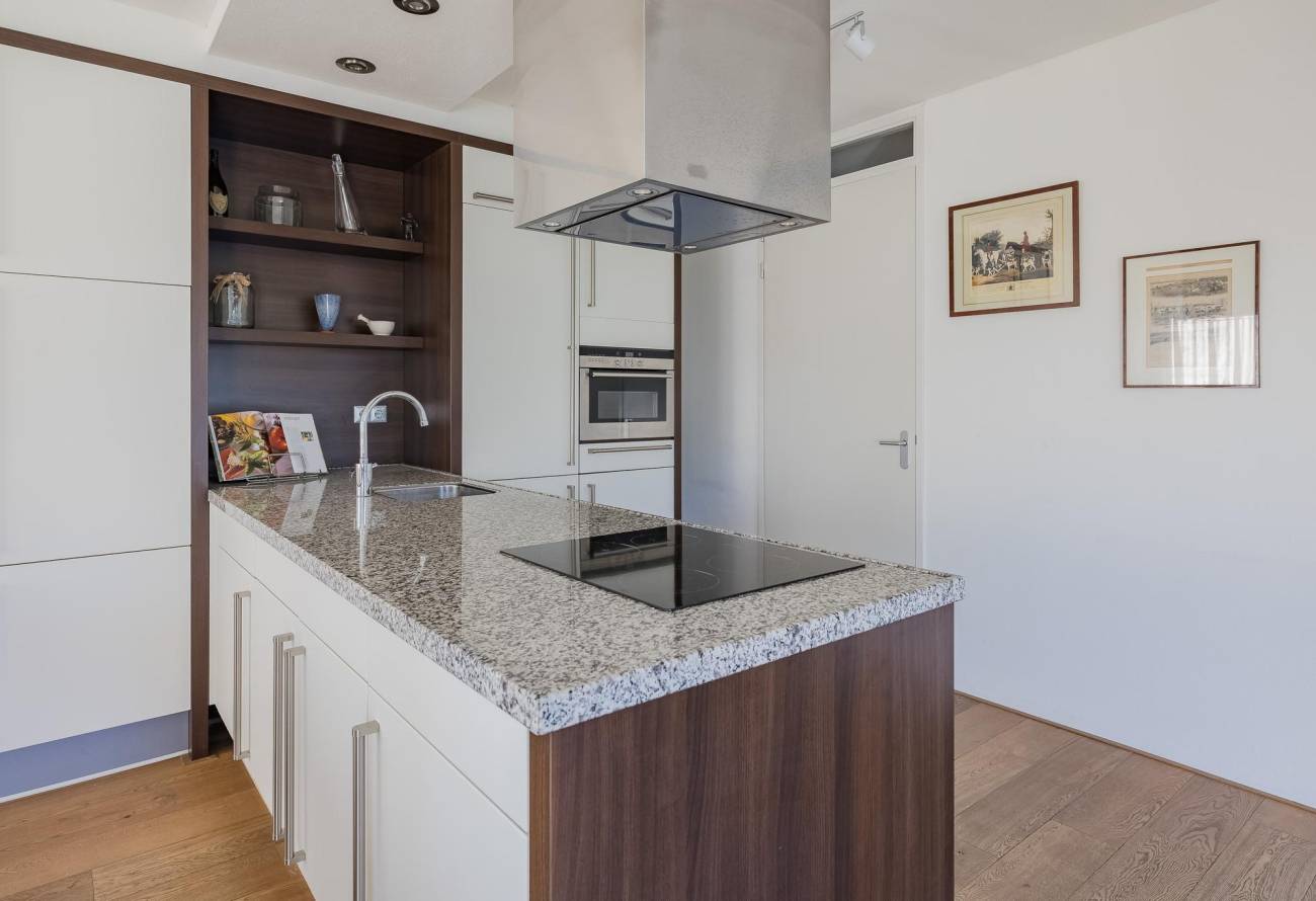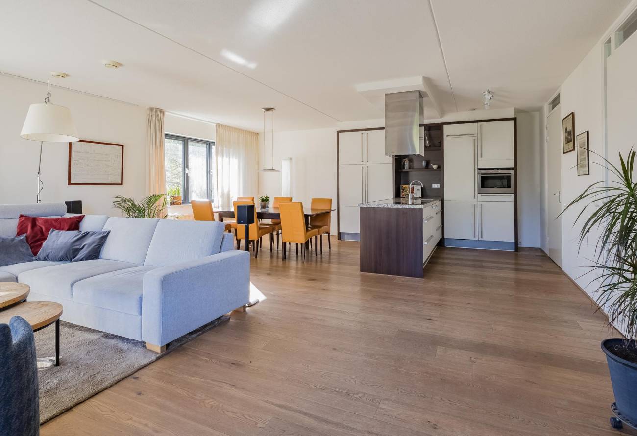De lichte woonkamer met keuken heeft veel lichtinval door de ramen en de openslaande deuren naar het heerlijke terras (Oost). De keuken is voorzien van een kook/spoel schiereiland en luxe inbouwapparatuur. Tevens is er de deur naar de berging met wasmachine aansluitingen.