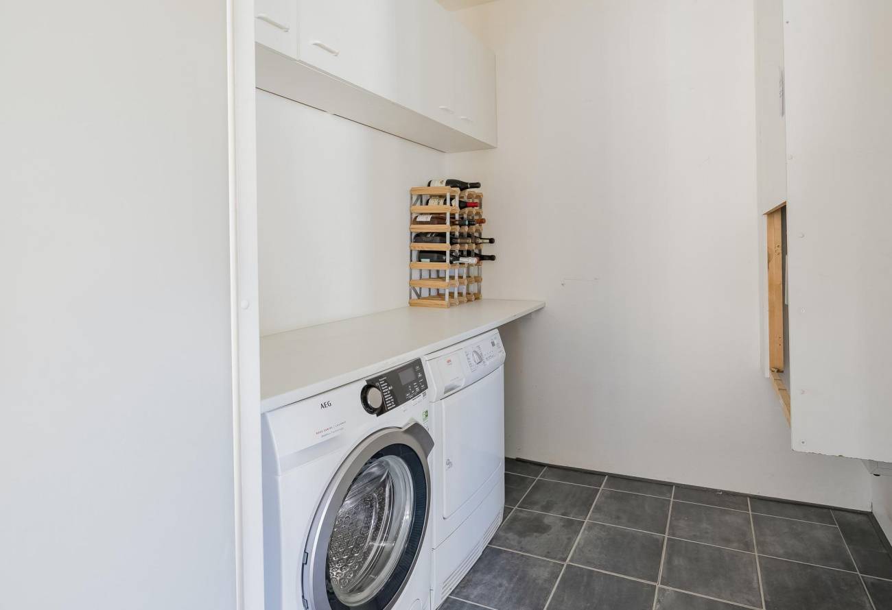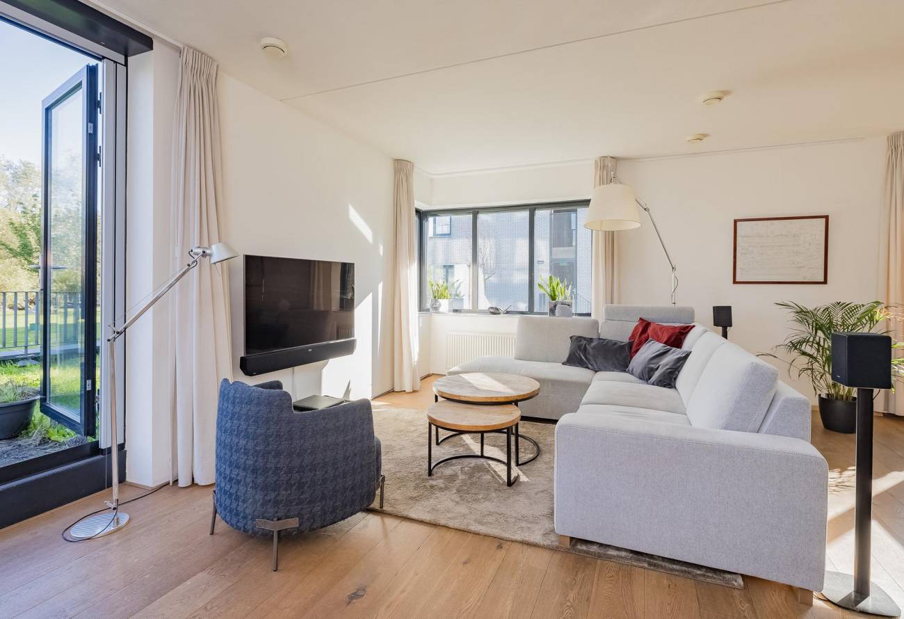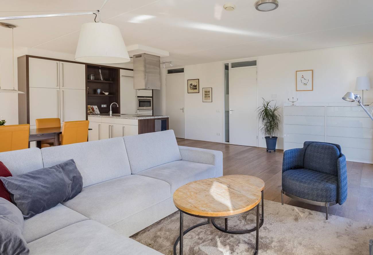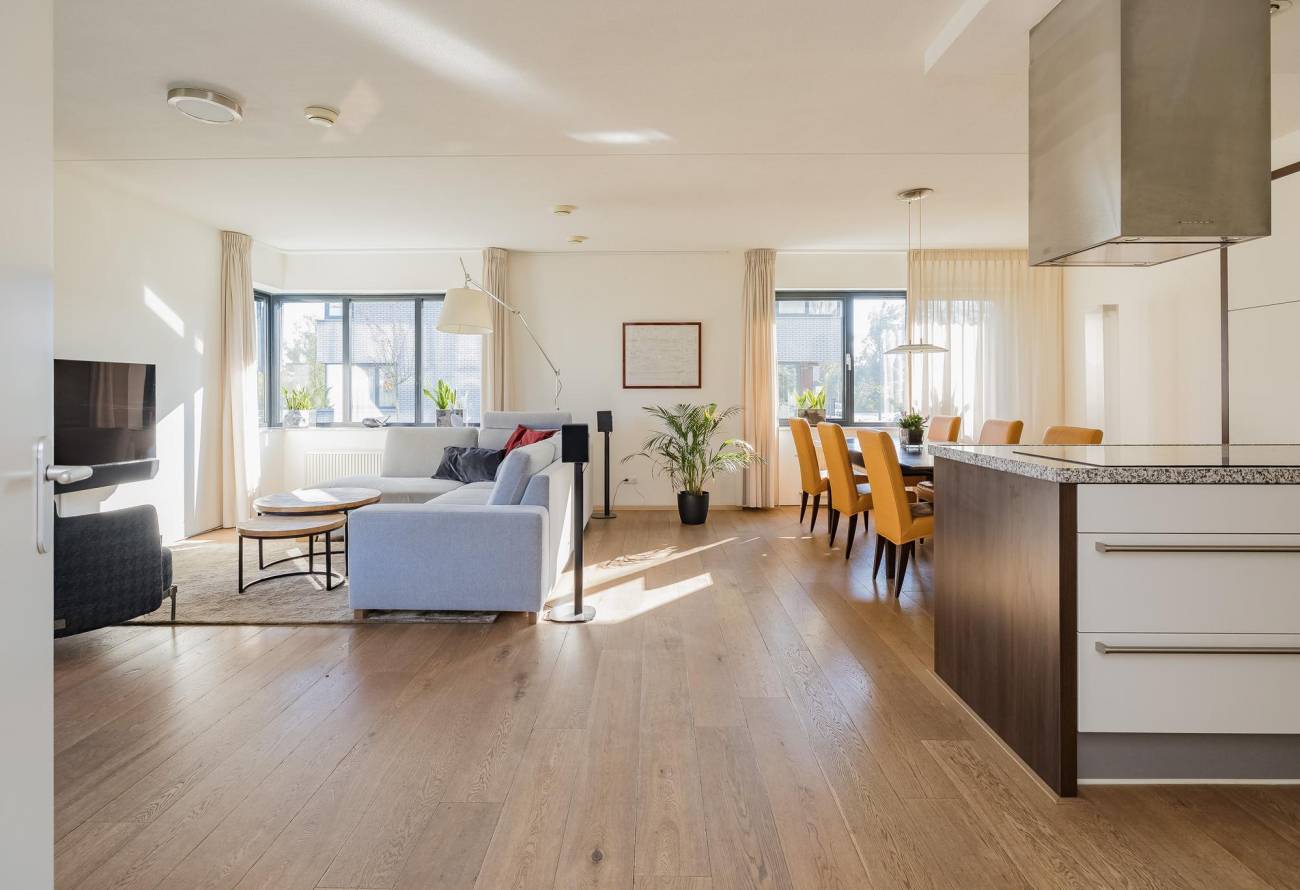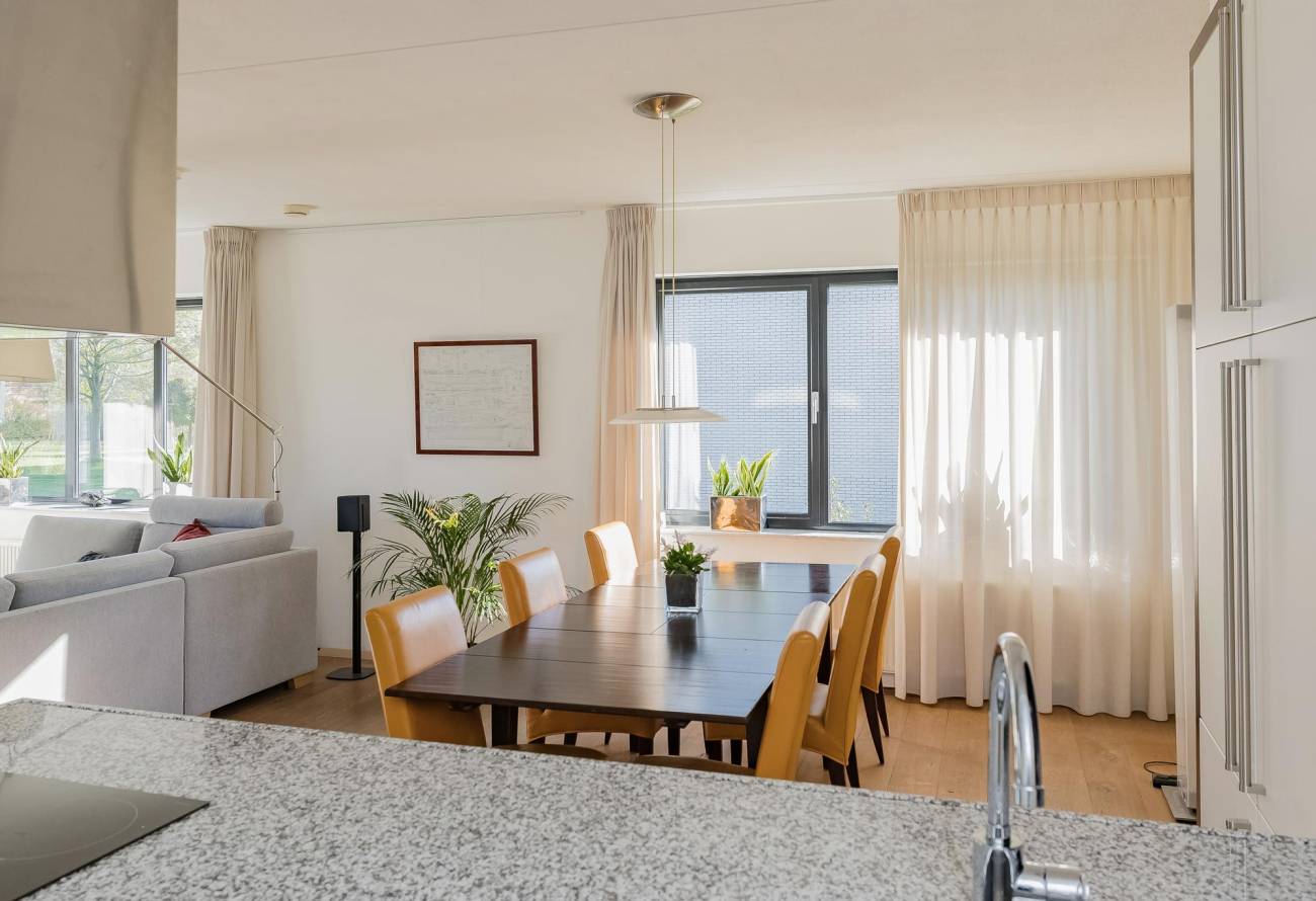 De lichte woonkamer met keuken heeft veel lichtinval door de ramen en de openslaande deuren naar het heerlijke terras (Oost). De keuken is voorzien van een kook/spoel schiereiland en luxe inbouwapparatuur. Tevens is er de deur naar de berging met wasmachine aansluitingen.