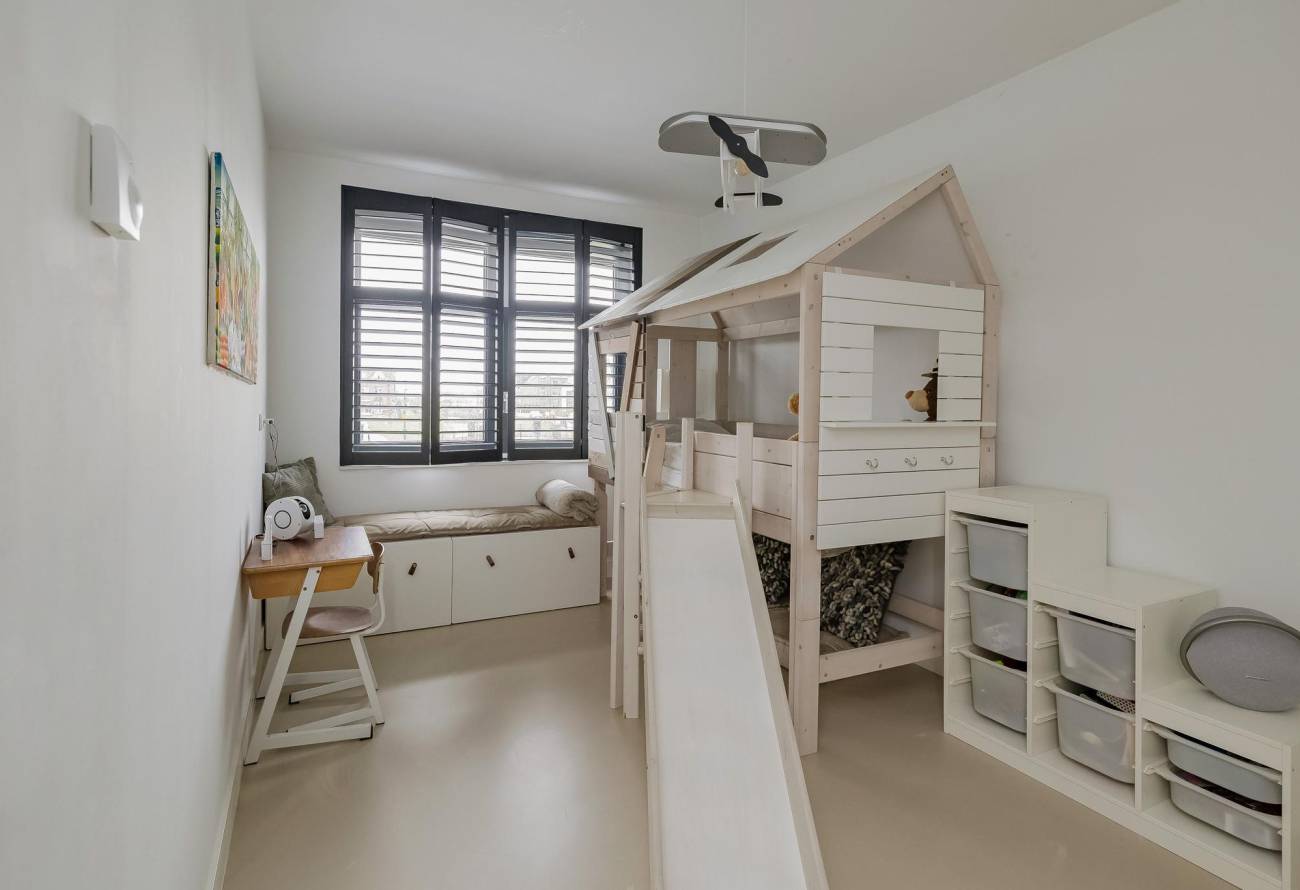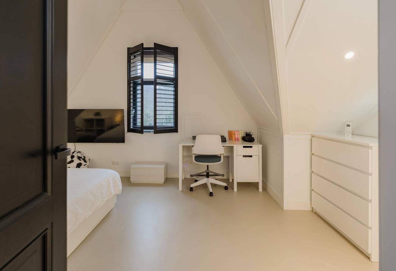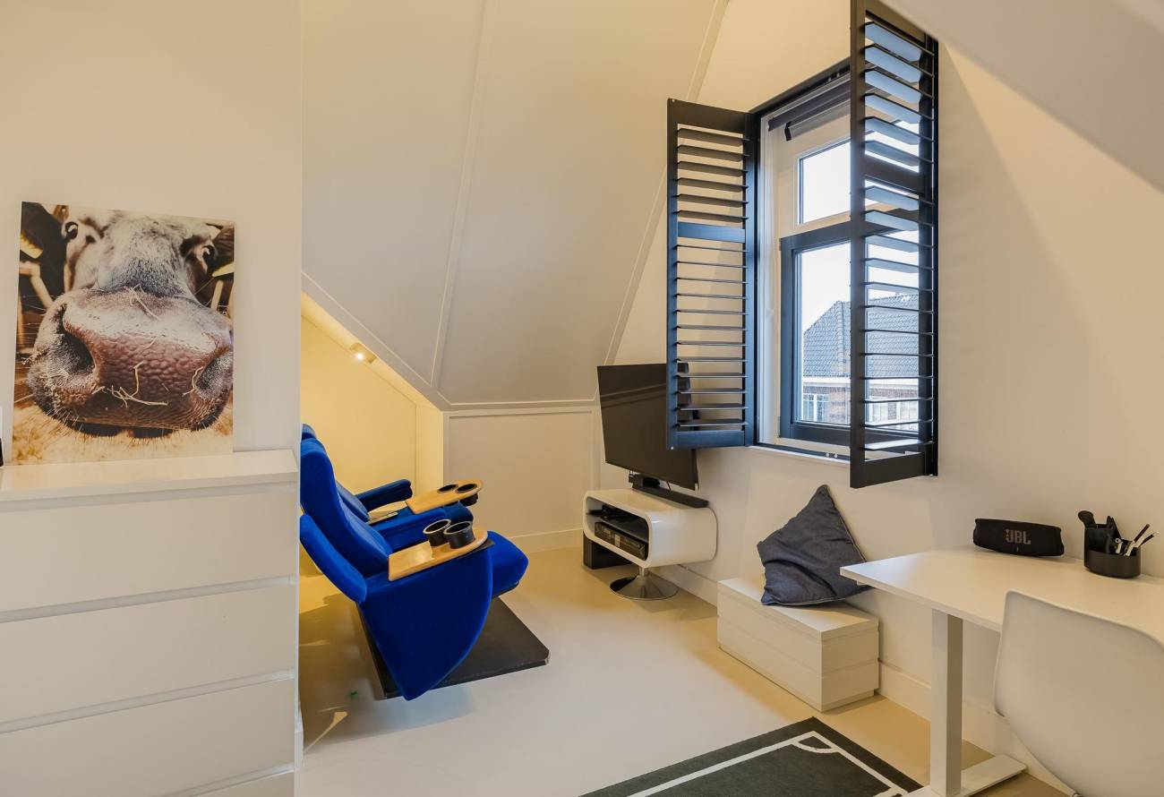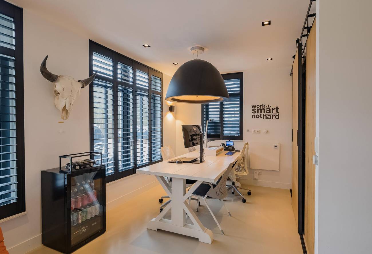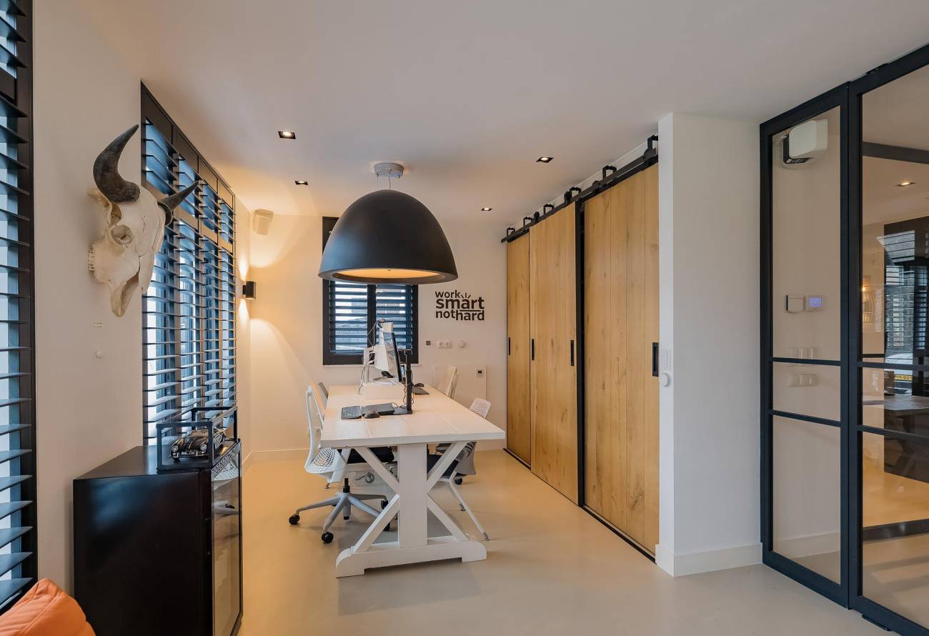 Aan de voorzijde van de woning is, afgesloten met openslaande deuren, een grote werkkamer met vaste kast gerealiseerd; een riante werkplek met veel lichtinval.