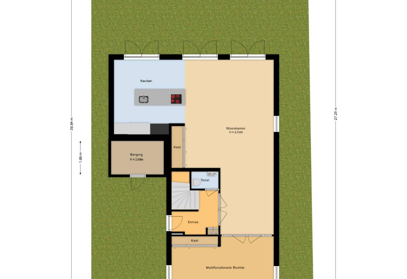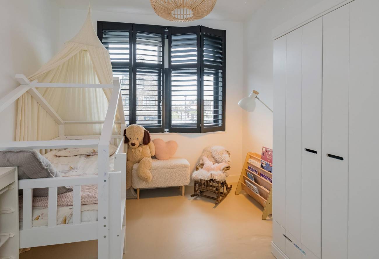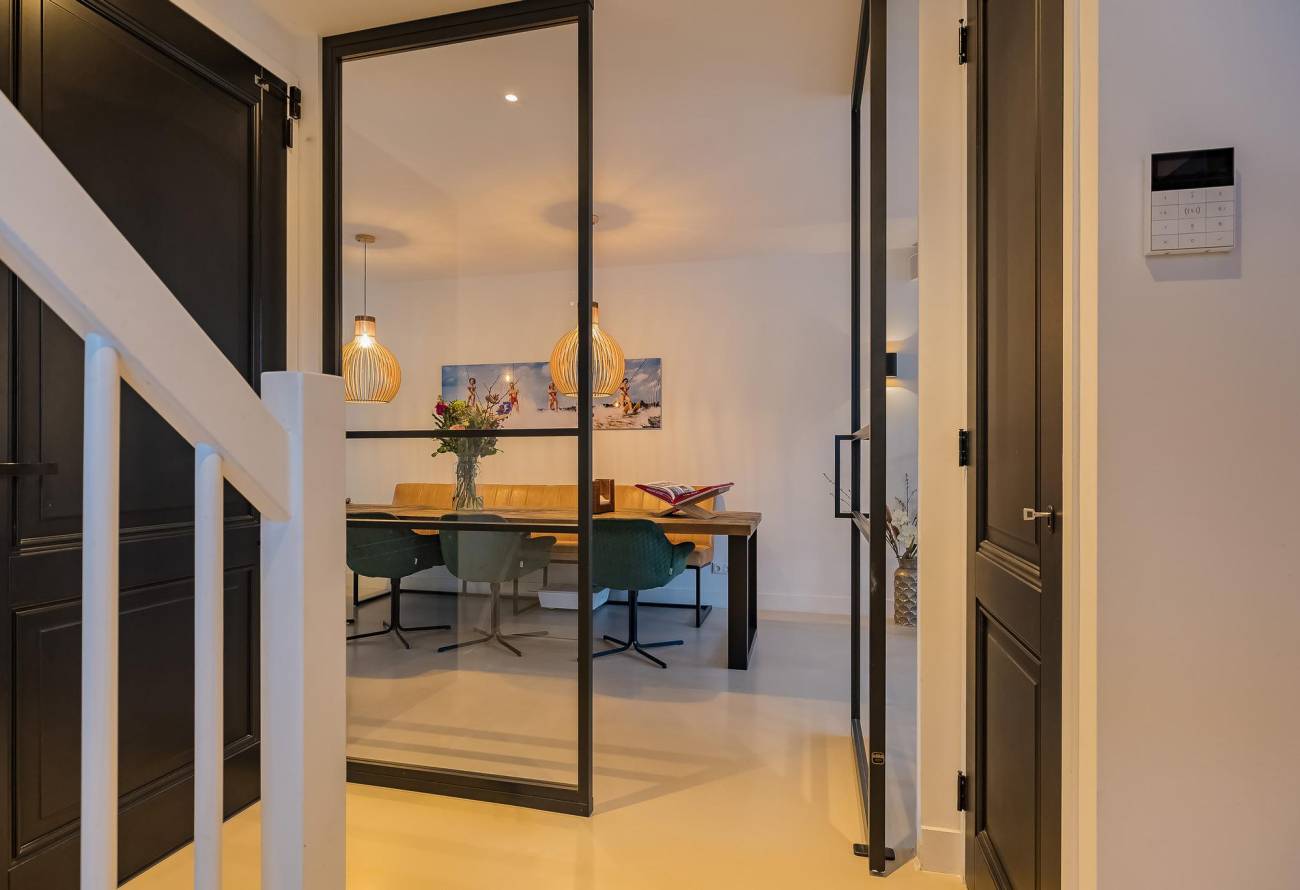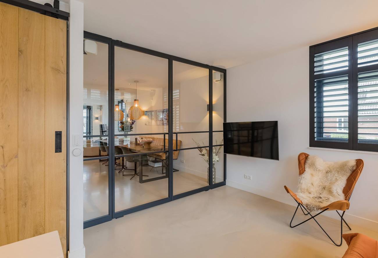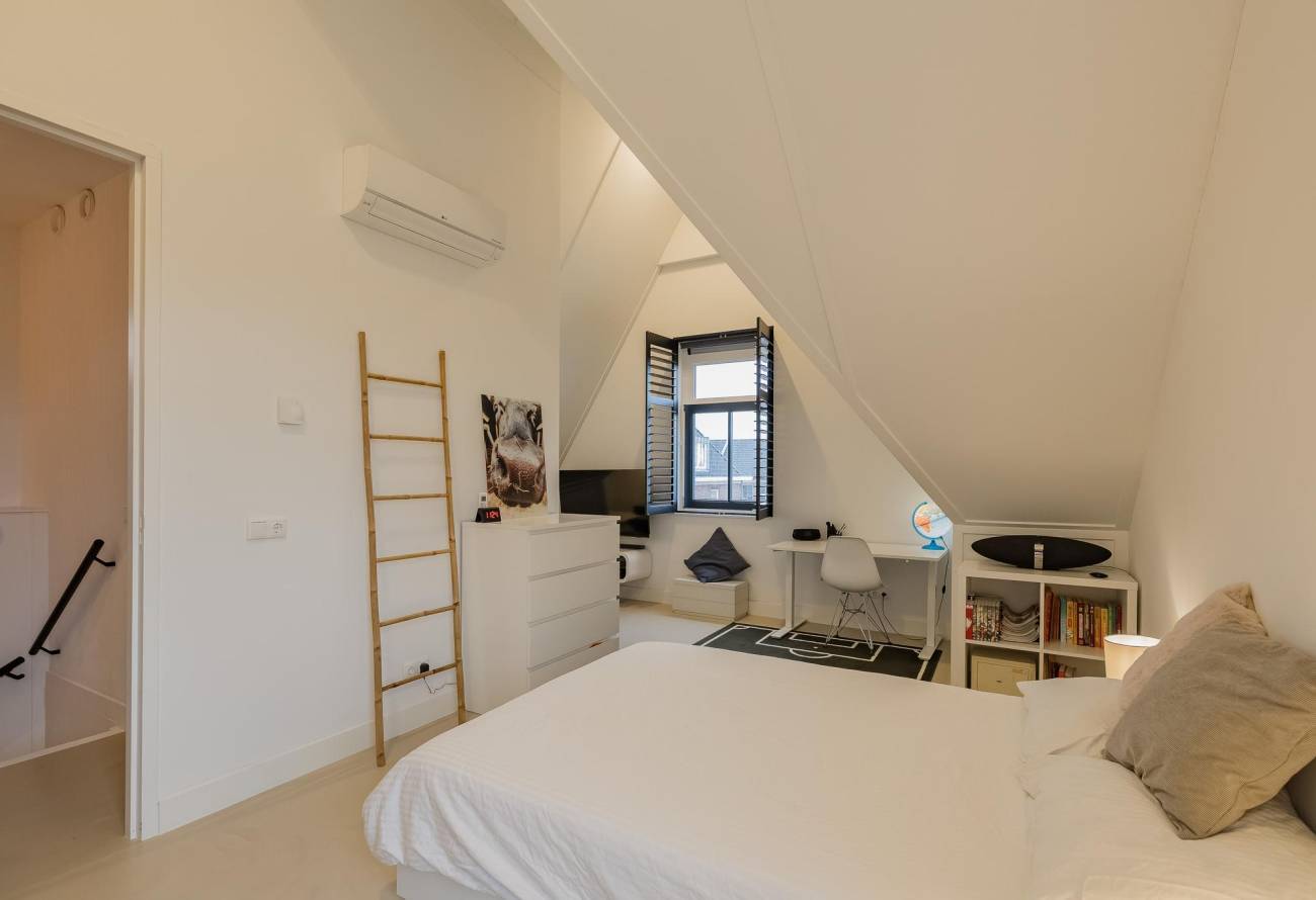 Aan de voorzijde van de woning is, afgesloten met openslaande deuren, een grote werkkamer met vaste kast gerealiseerd; een riante werkplek met veel lichtinval.