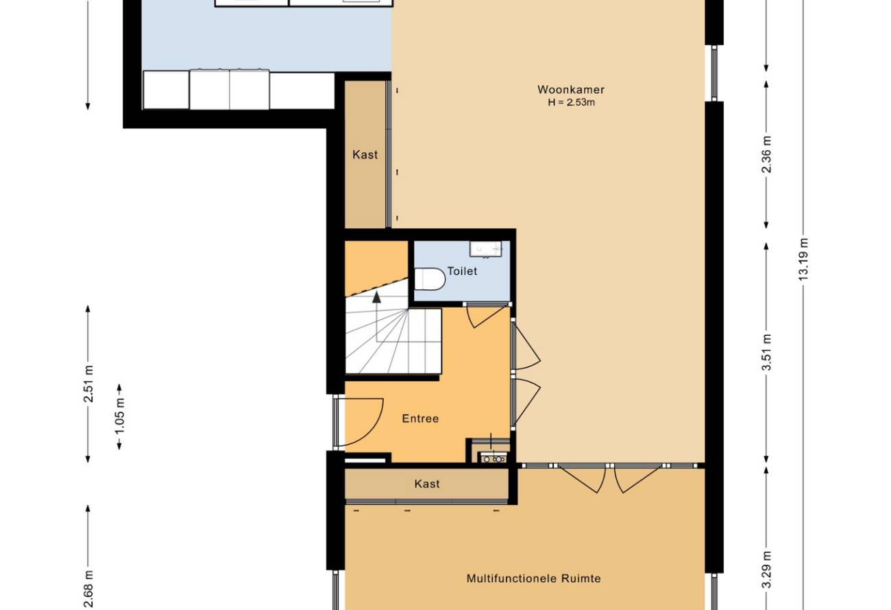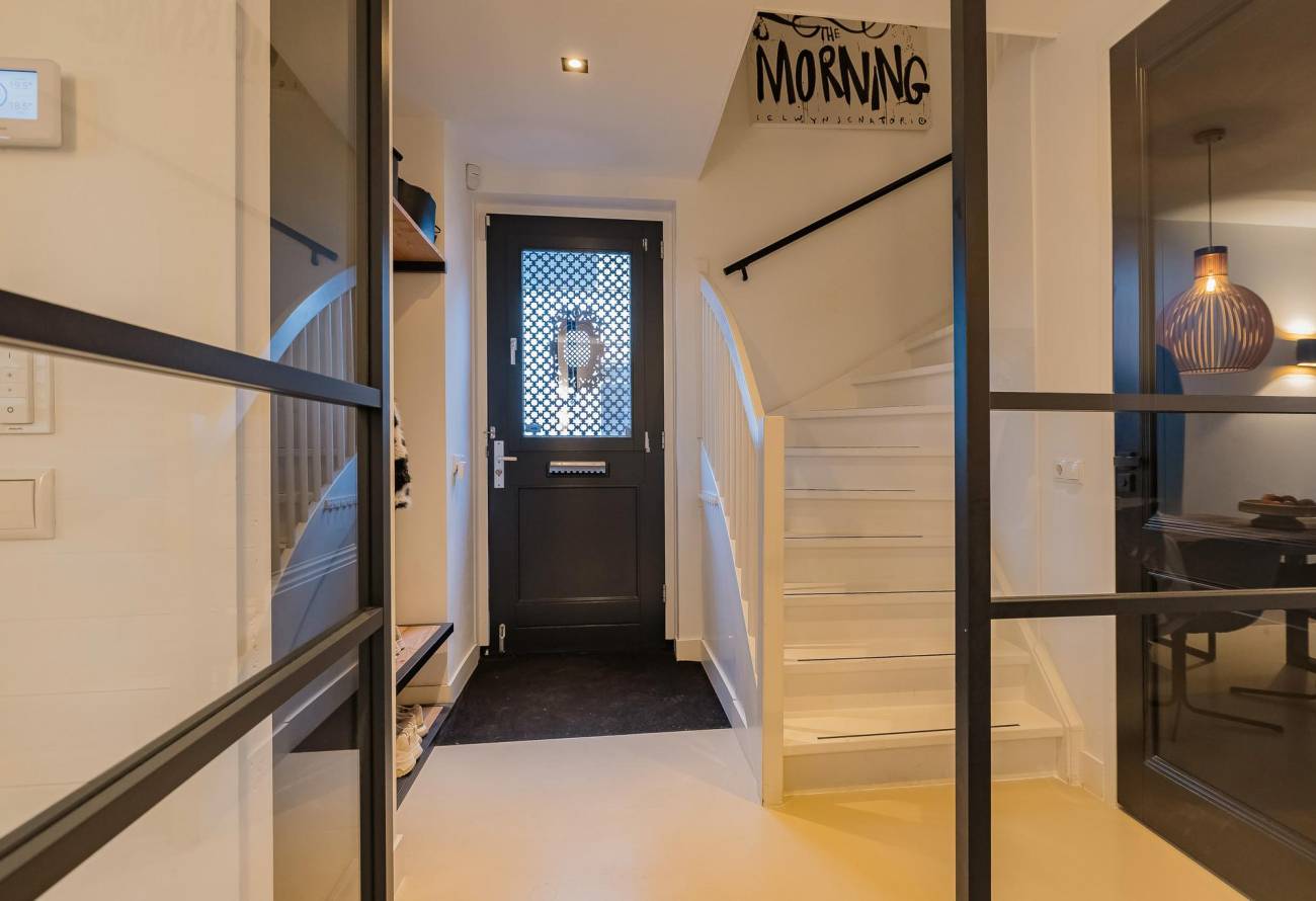 Bij binnenkomst is er een hal met meterkast, toiletruimte met spa-toilet, trap naar de eerste verdieping en een stalen deur naar de living.