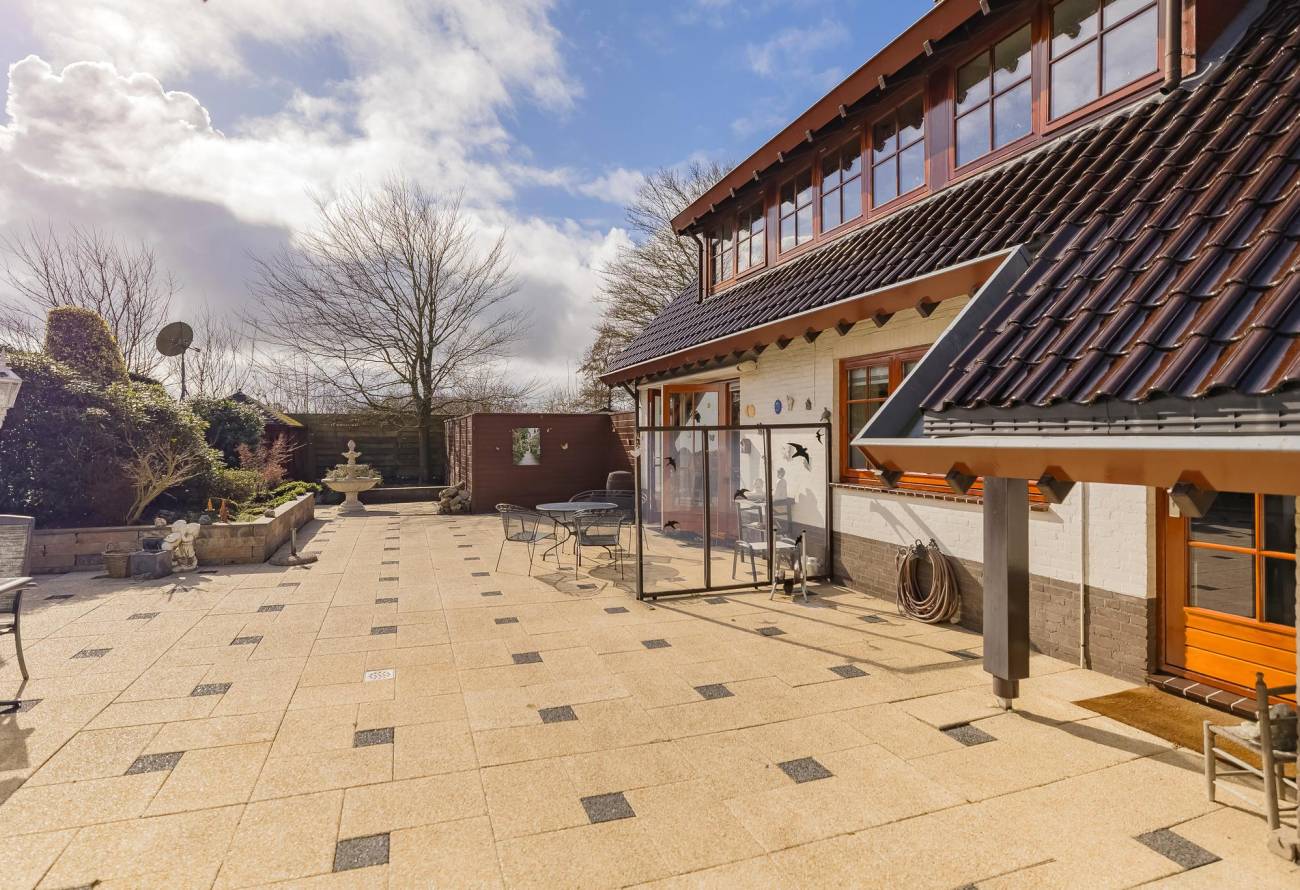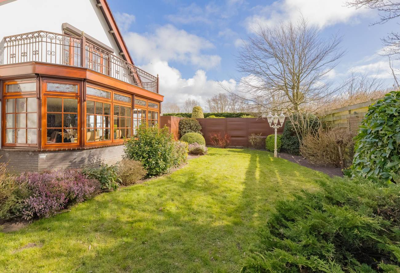 De tuin rondom de woning is verdeeld in twee gedeelten. Het betegelde deel biedt volop mogelijkheden voor meerdere loungeplekken en een gezellig eetgedeelte. Het andere, groenere deel is afgeschermd en voorzien van een prachtig gazon met vaste planten en bomen – de perfecte plek om tot rust te komen.