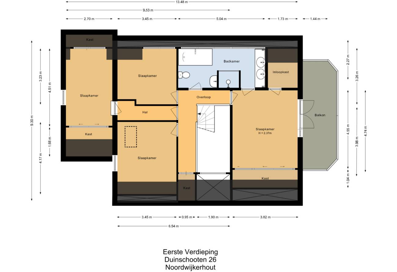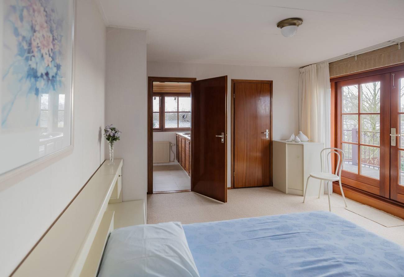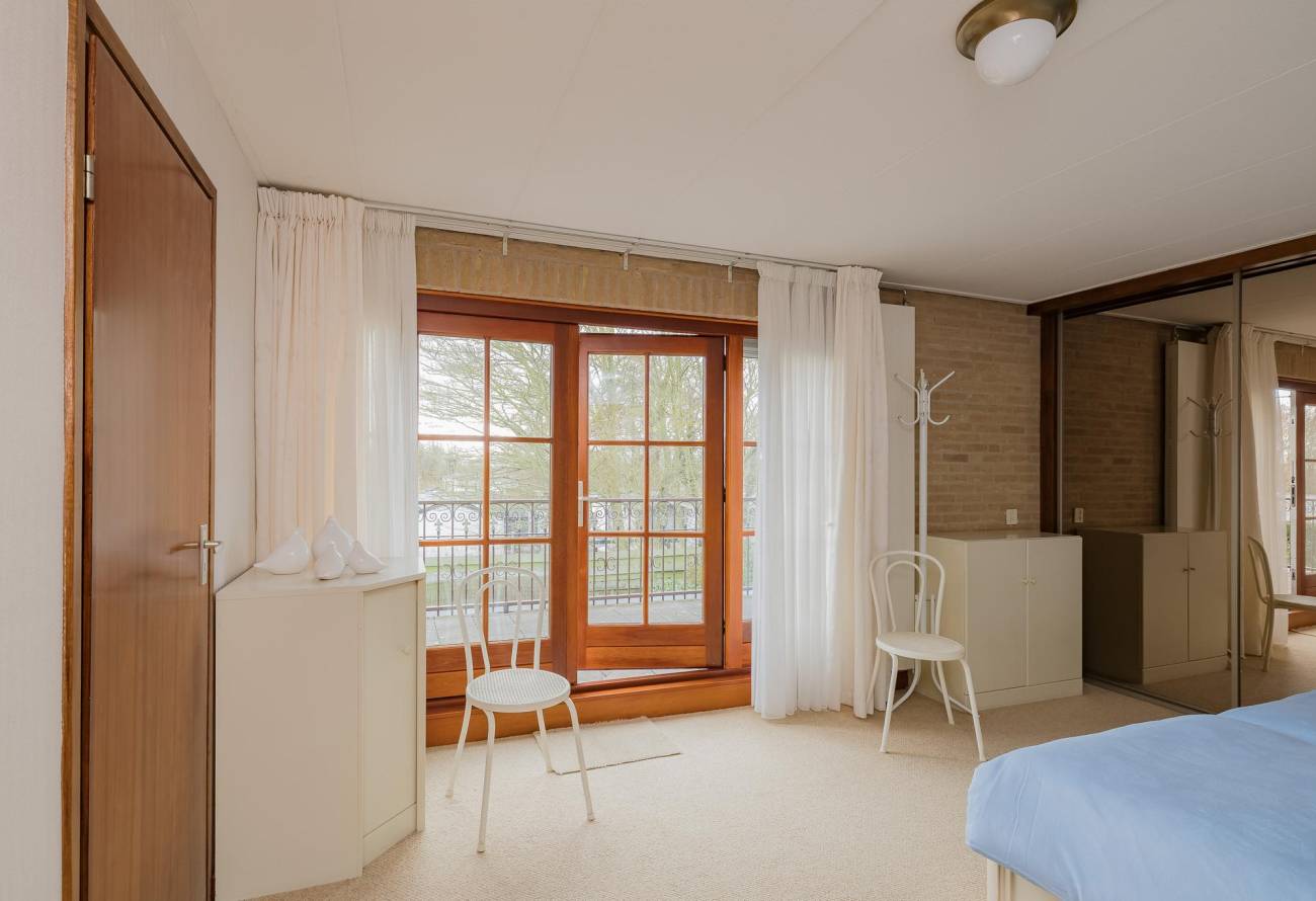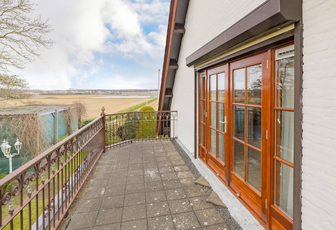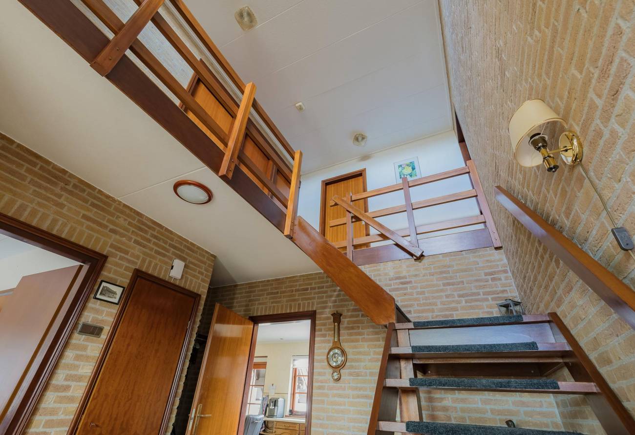 Ruimte hardhouten trap in de vide naar de eerste etage. Daar vindt je maar liefst vier slaapkamers. De ouderslaapkamer heeft openslaande deuren naar een riant balkon met een schitterend (zij) uitzicht over de bollenvelden. Er is ook een kleding inloopkast.