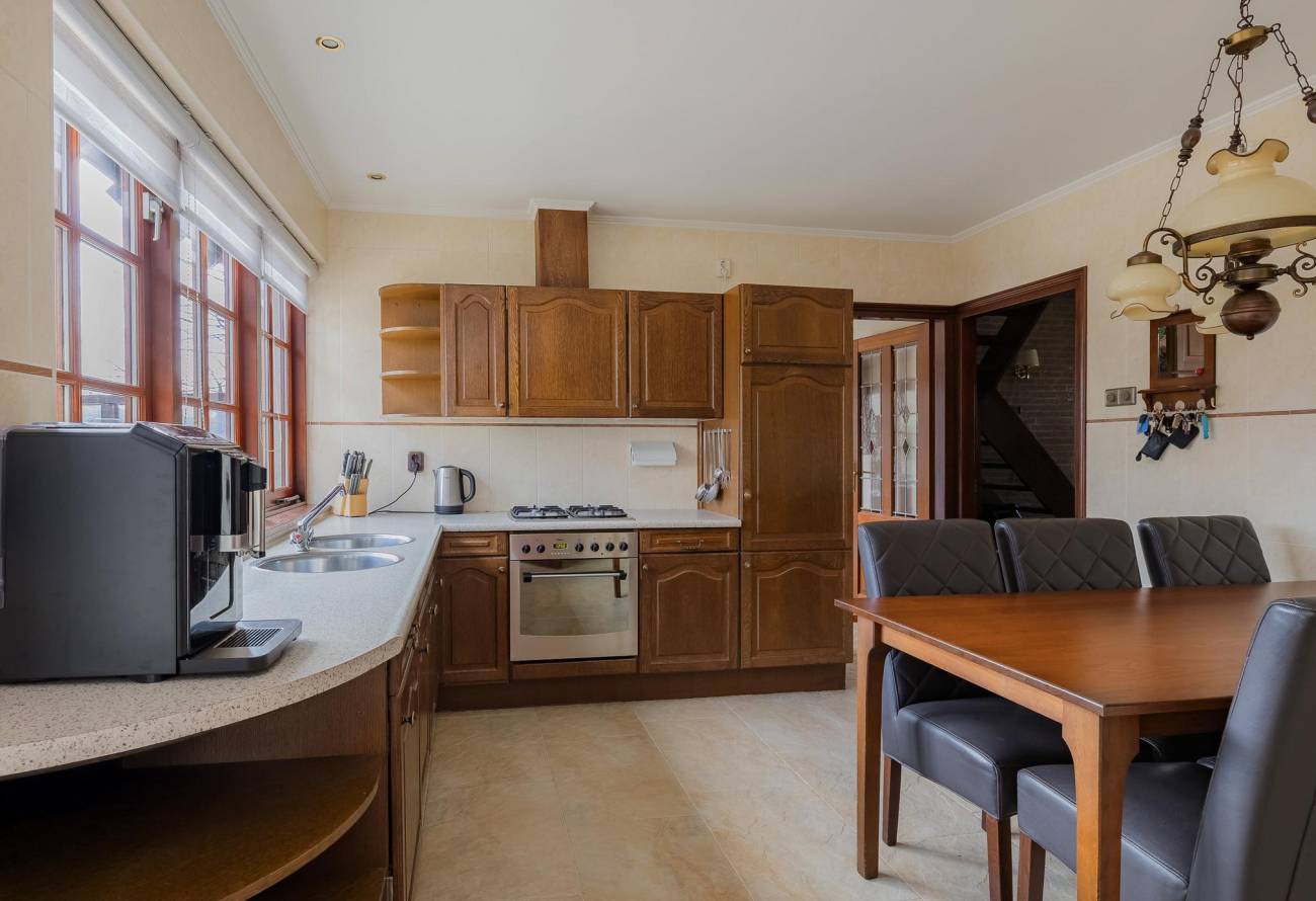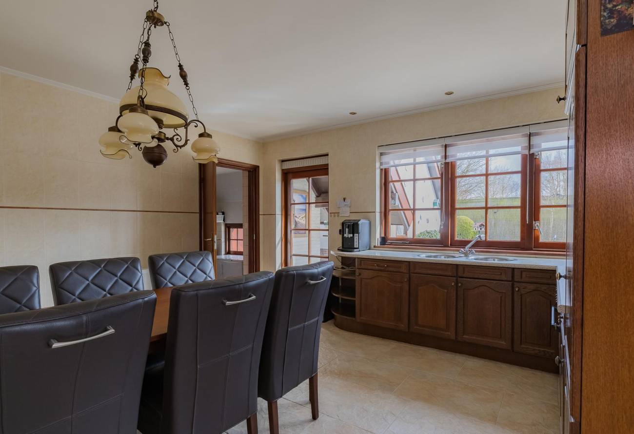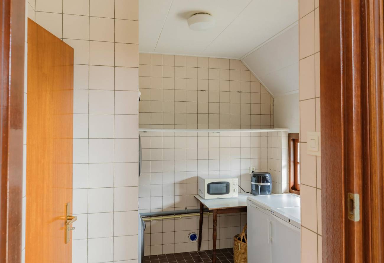De ruime woonkeuken heeft een praktische L-vormige opstelling en grenst aan een bijkeuken voor de extra vriezer of garderobe. Vanuit de keuken kijk je uit over de achtertuin.