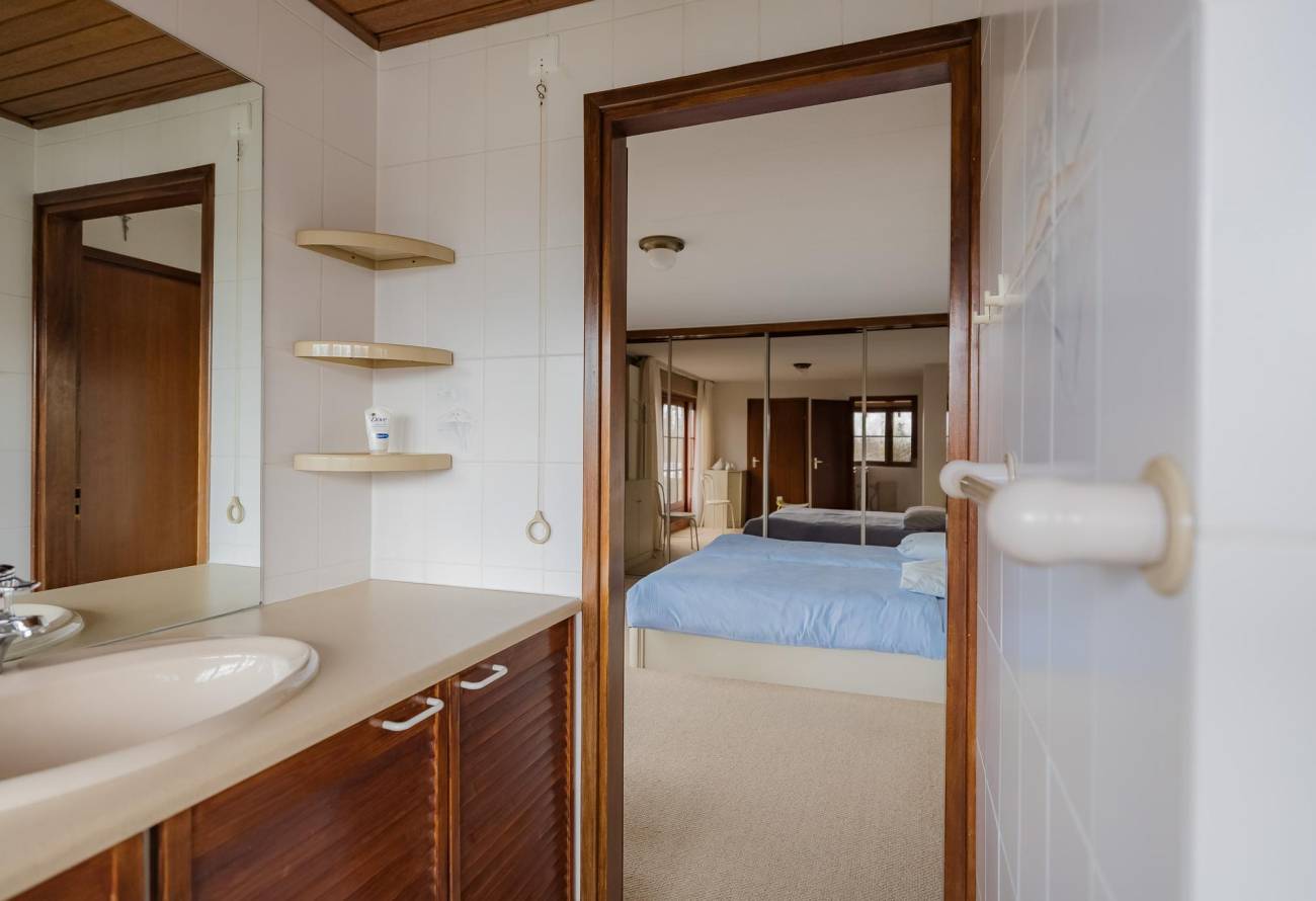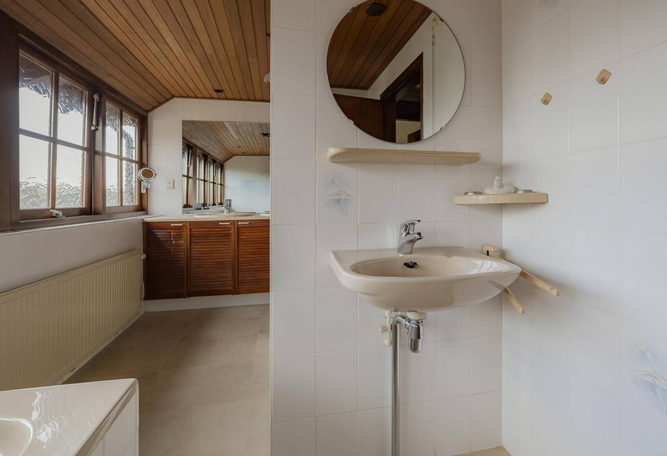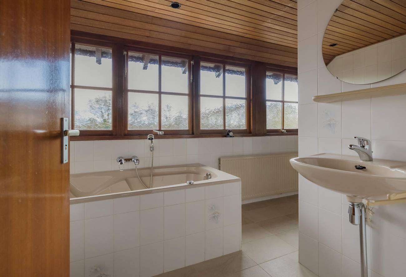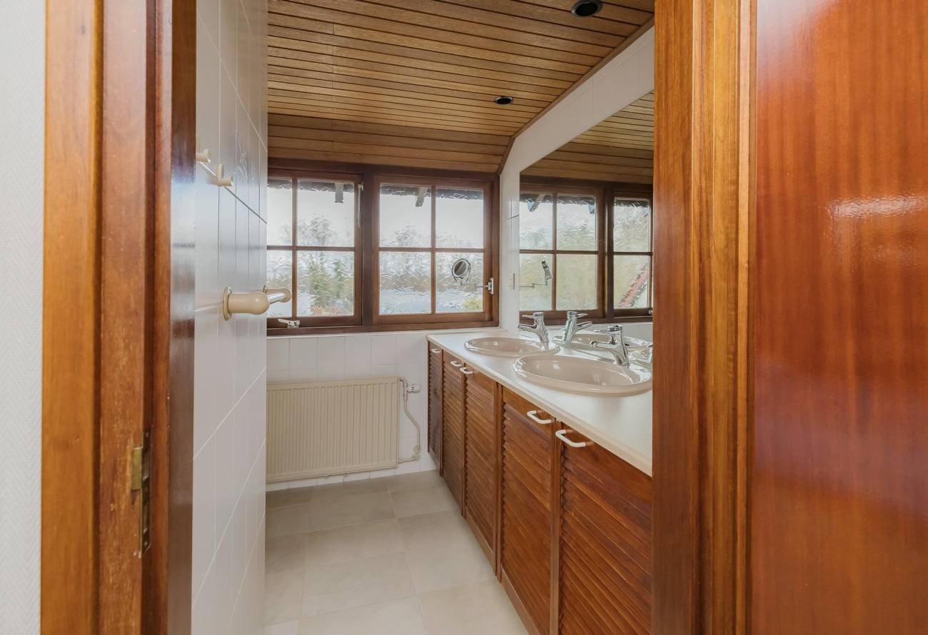 De ruime badkamer beschikt over een ligbad, toilet, een apart douchegedeelte en een dubbele wastafel in meubel. Eén van de slaapkamers is extra ruim dankzij een dakkapel en is boven de (voorheen) garage.