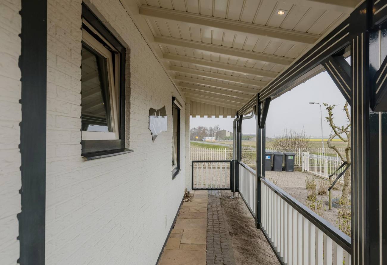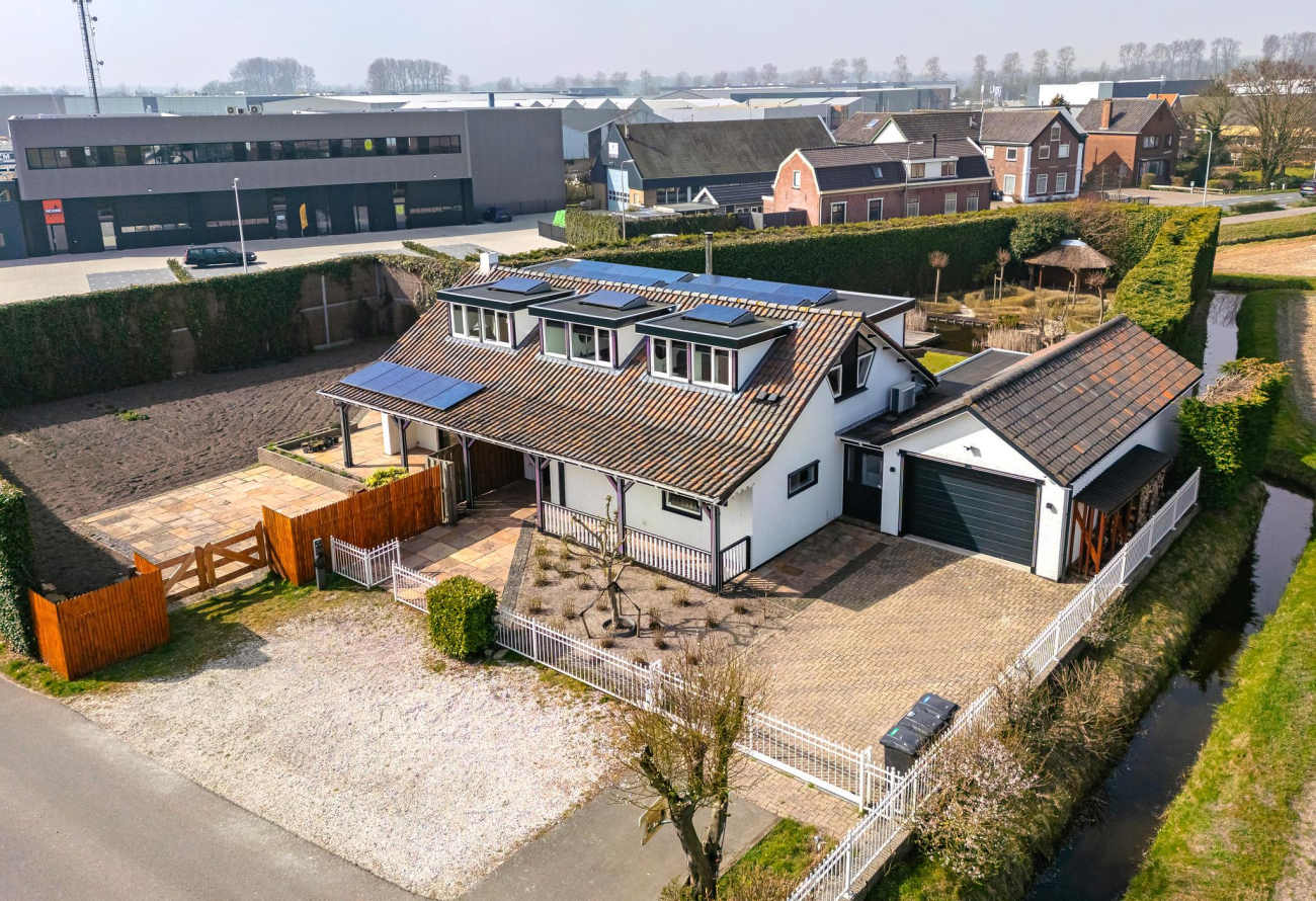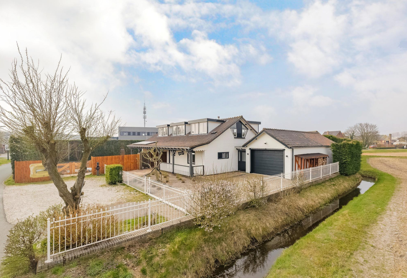 Ruime voortuin met oprit, parkeergelegenheid voor wel 5 auto’s, laadpaal en sierhek.
