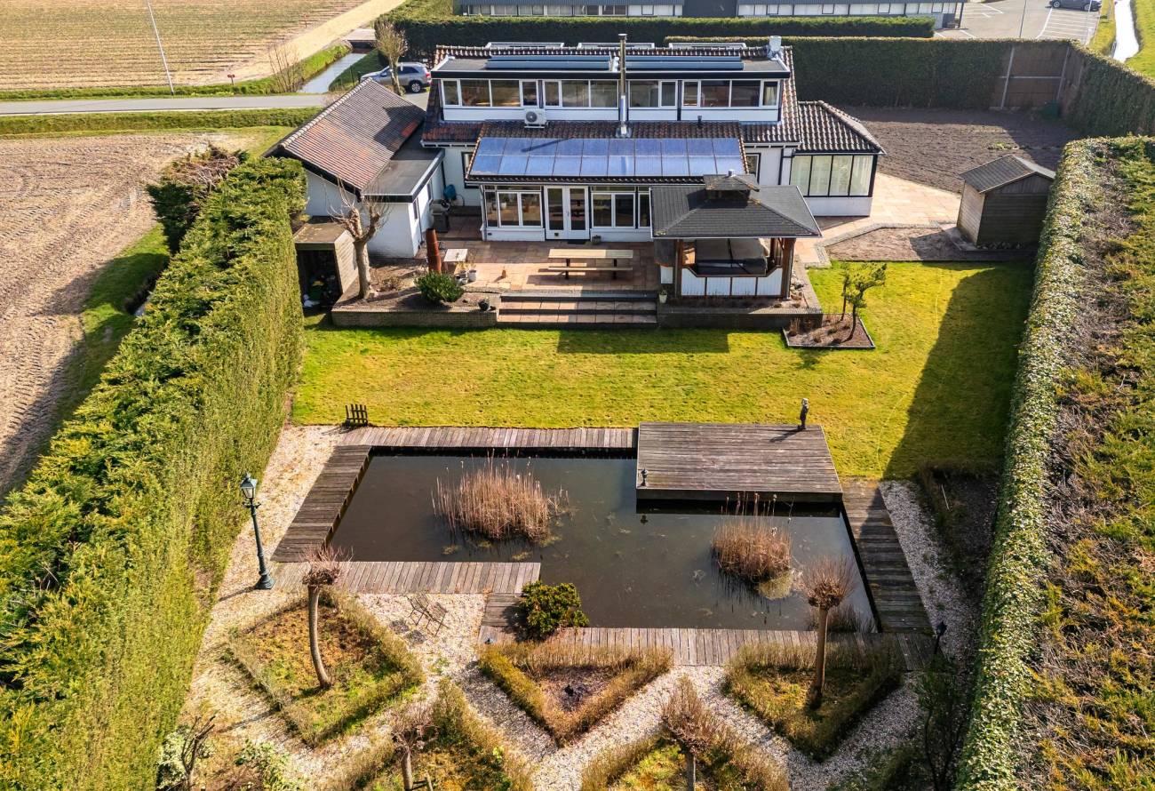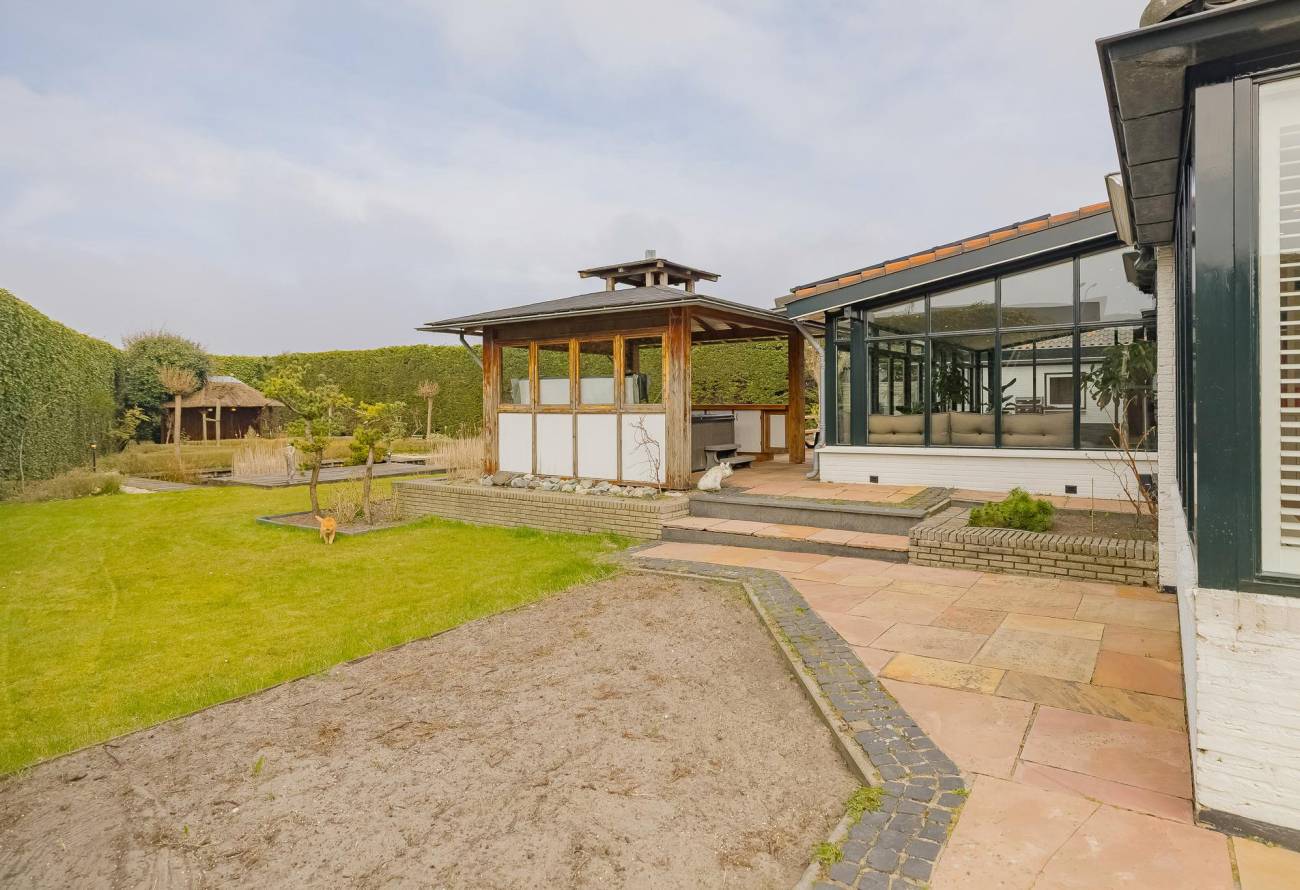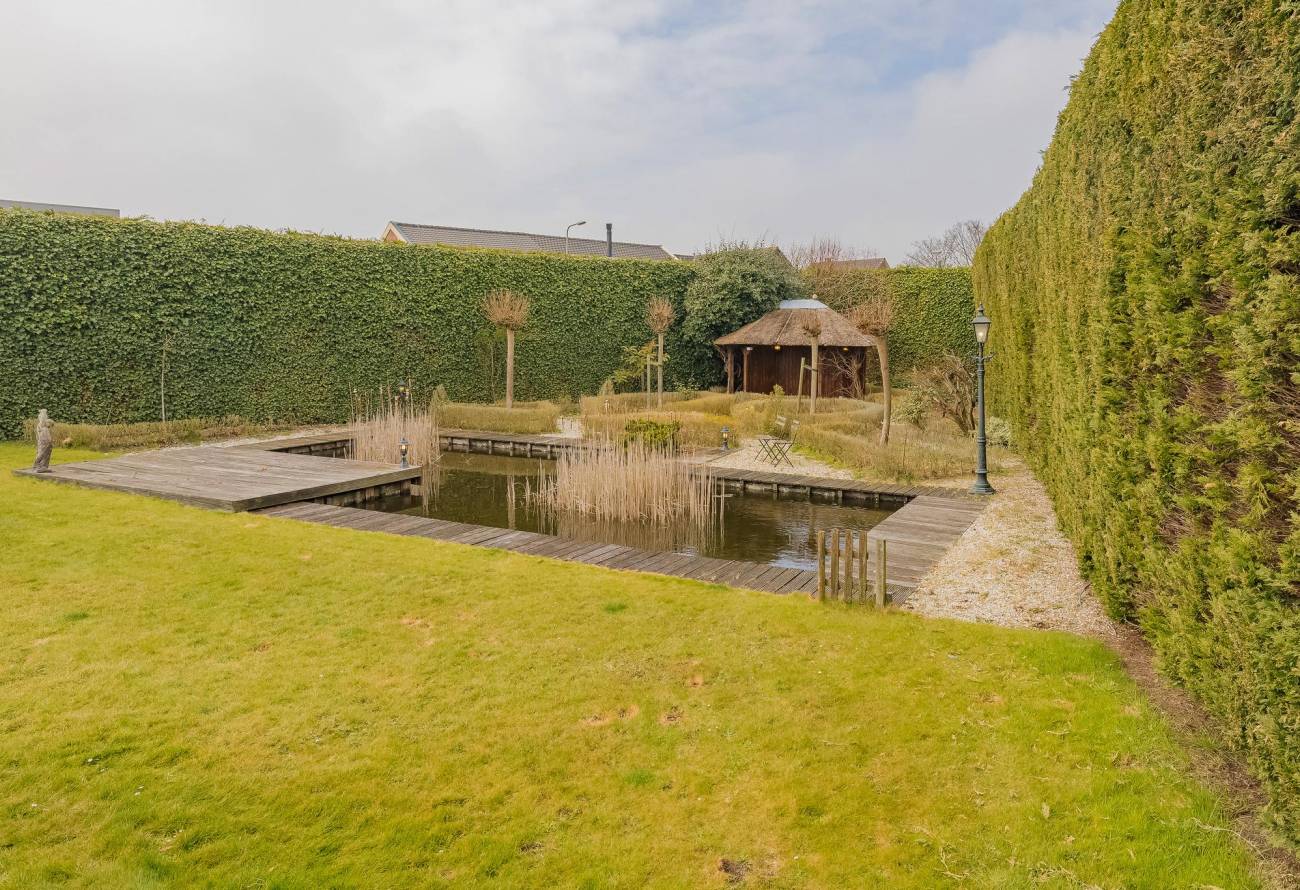 Fraai aangelegde tuin rondom de woning met hagen, bloemperken, een vijver, diverse terrassen, een moestuin en sierpaden. De tuin is voorzien van verlichting en een beregeningsinstallatie.