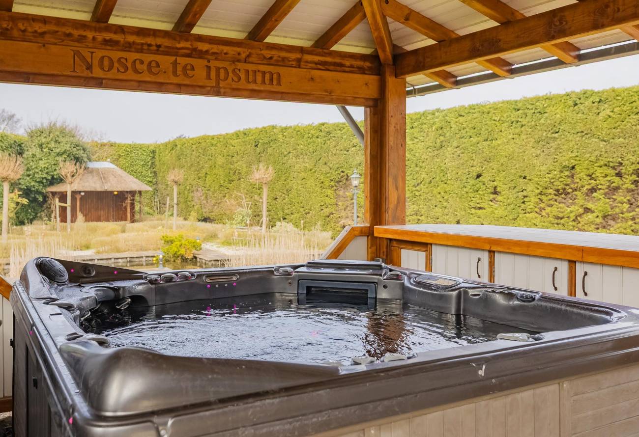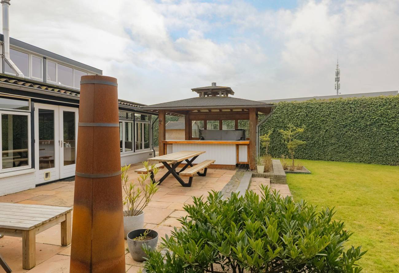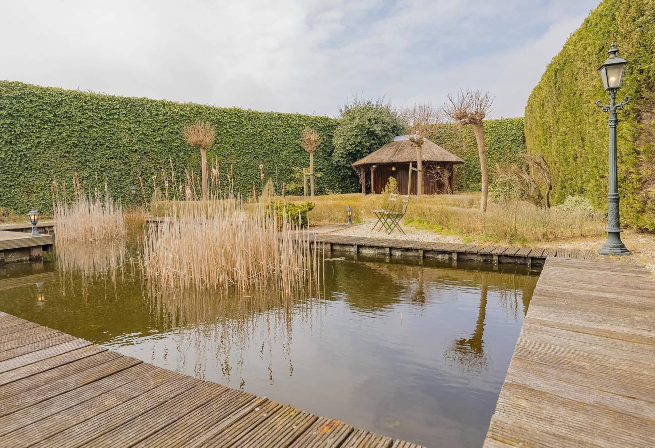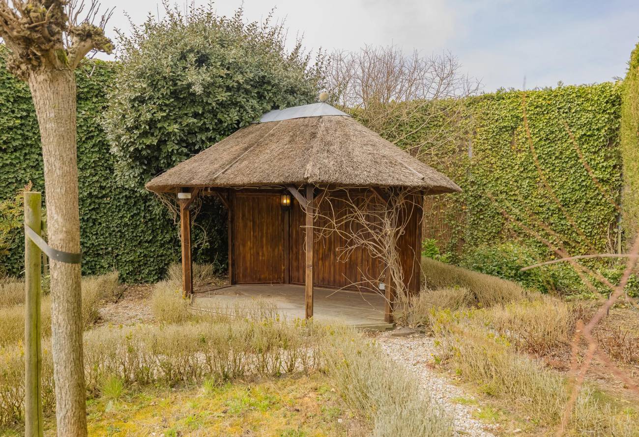 Fraai aangelegde tuin rondom de woning met hagen, bloemperken, een vijver, diverse terrassen, een moestuin en sierpaden. De tuin is voorzien van verlichting en een beregeningsinstallatie.