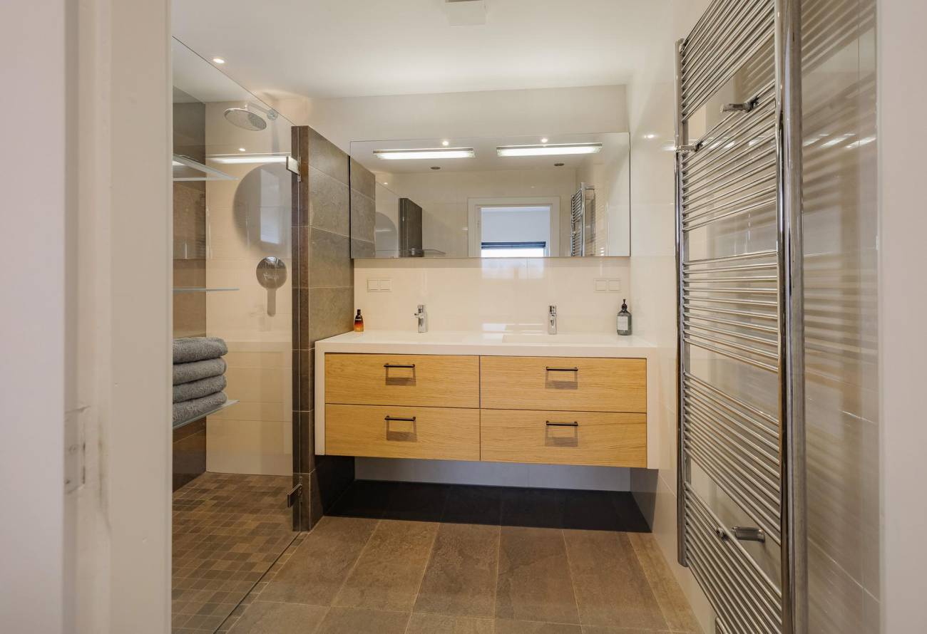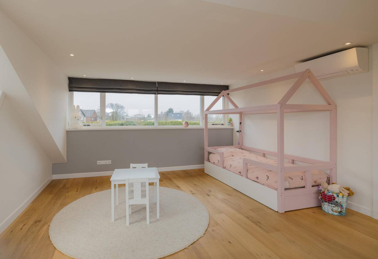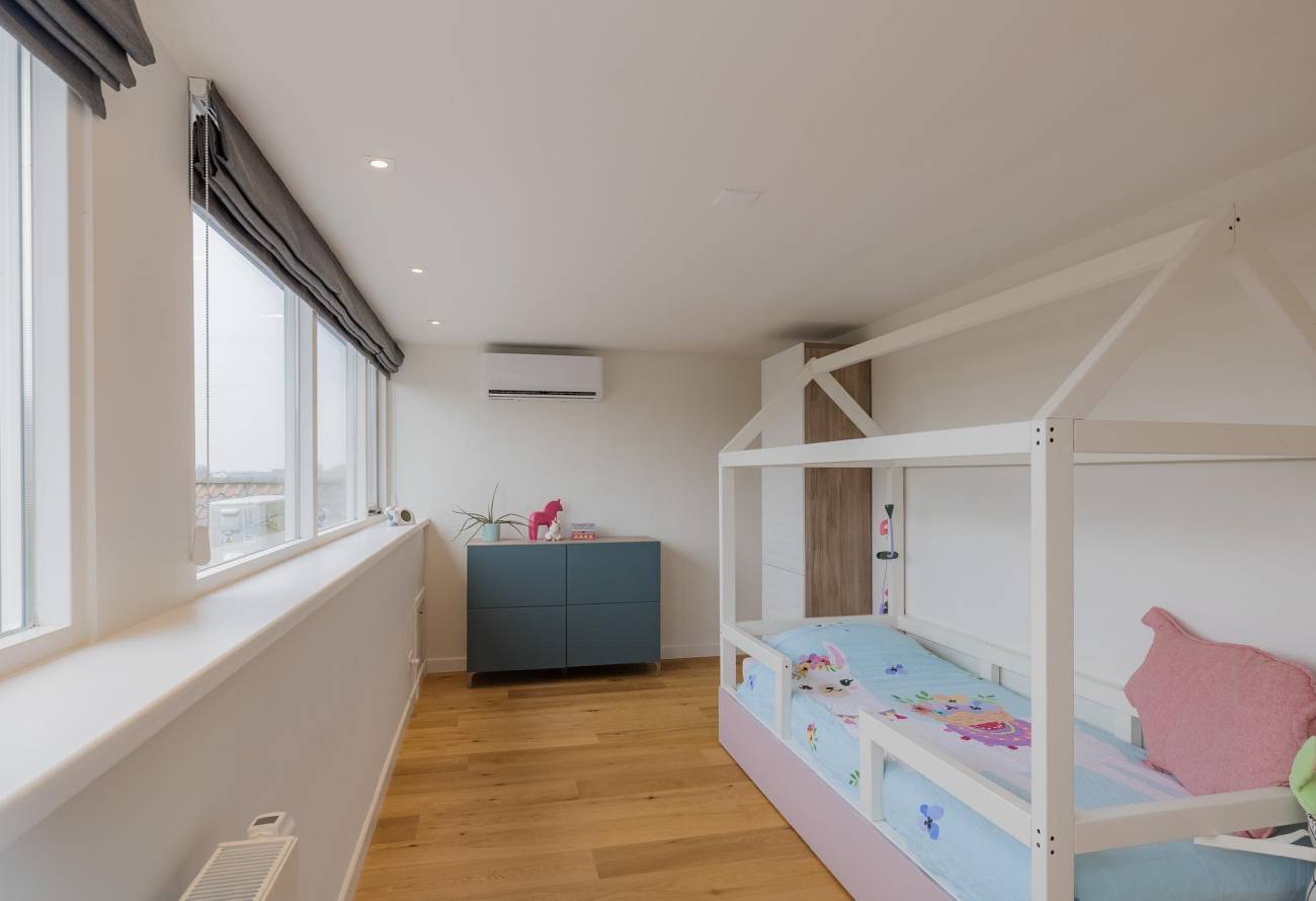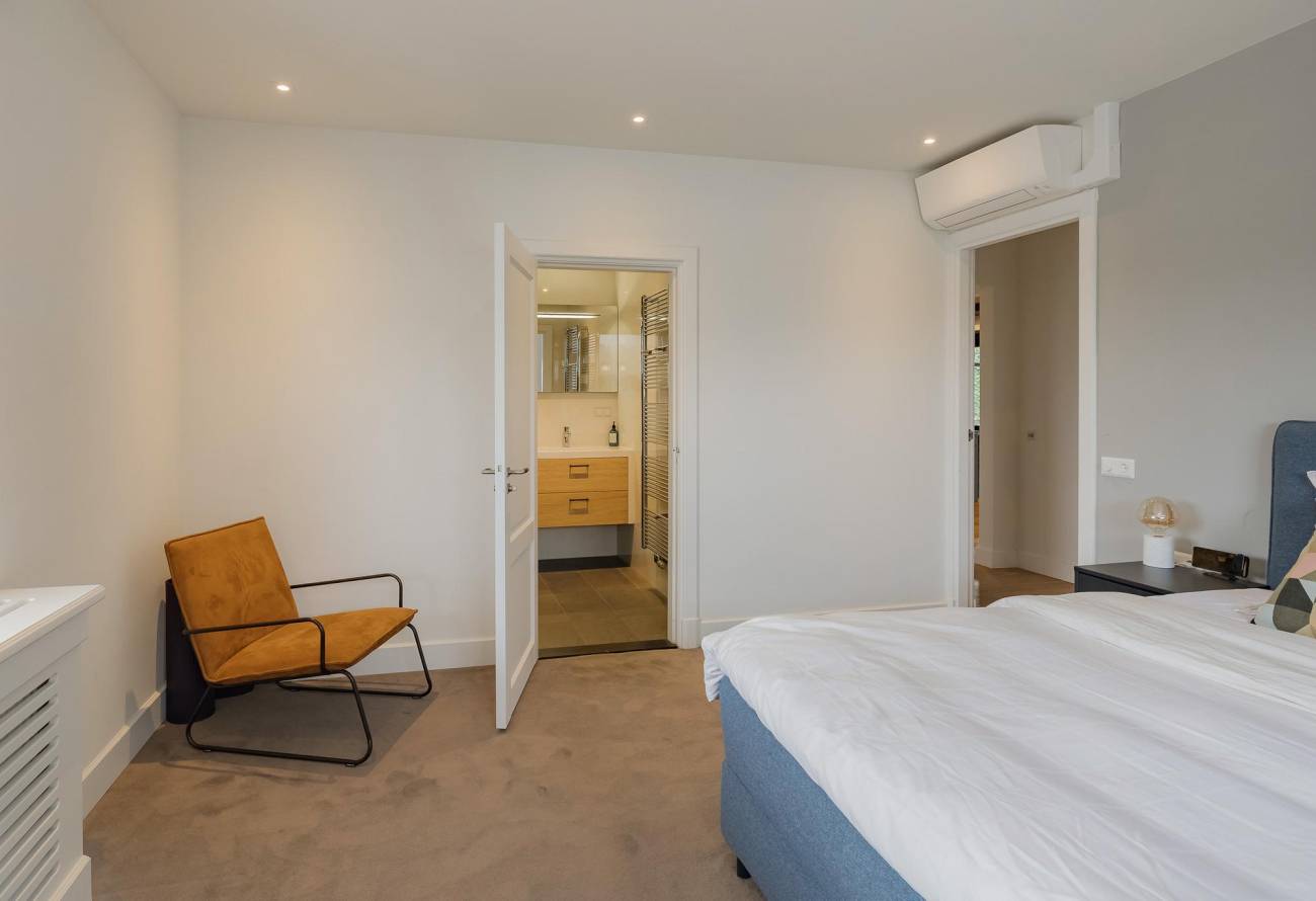 Op de verdieping zijn 3 slaapkamers en 2 badkamers waarvan er één toegankelijk is vanuit de slaapkamer. De slaapkamers zijn voorzien van airco en een grote dakkapel over de hele breedte van de woning zorgt voor ruime lichtinval.