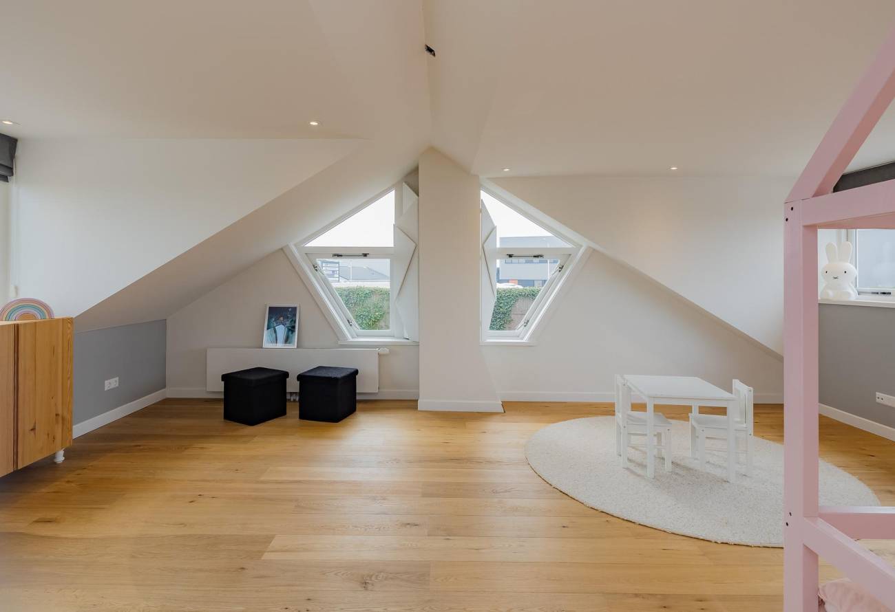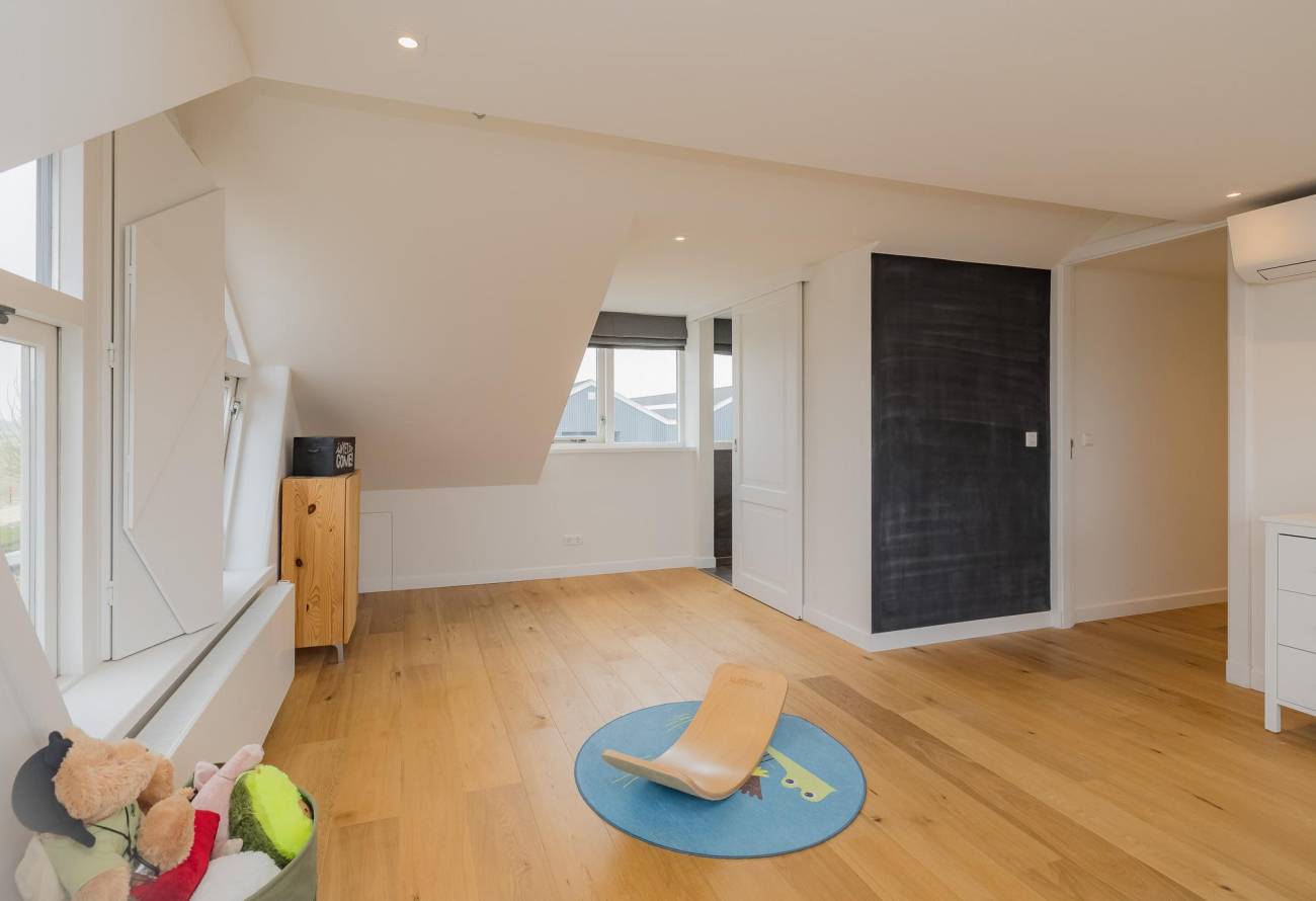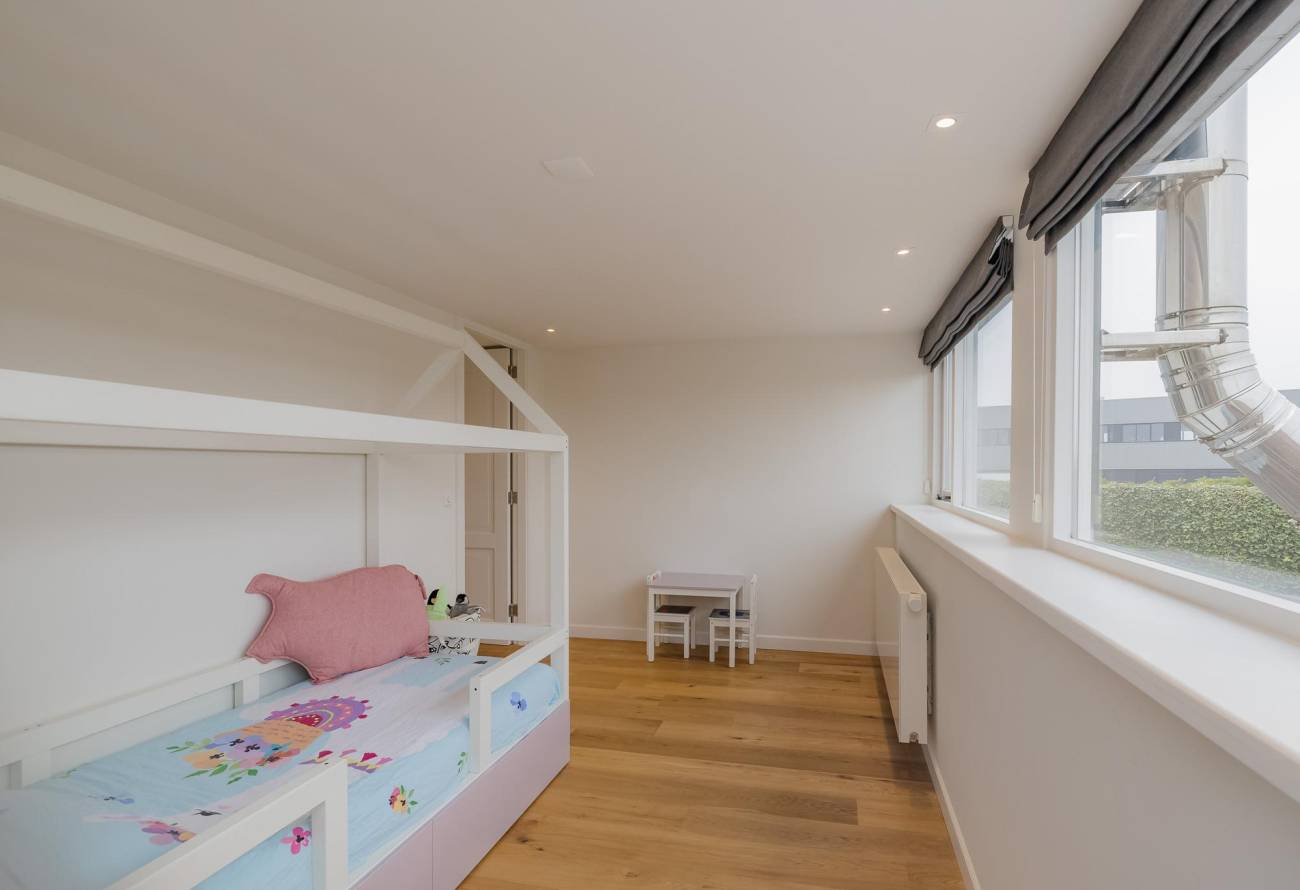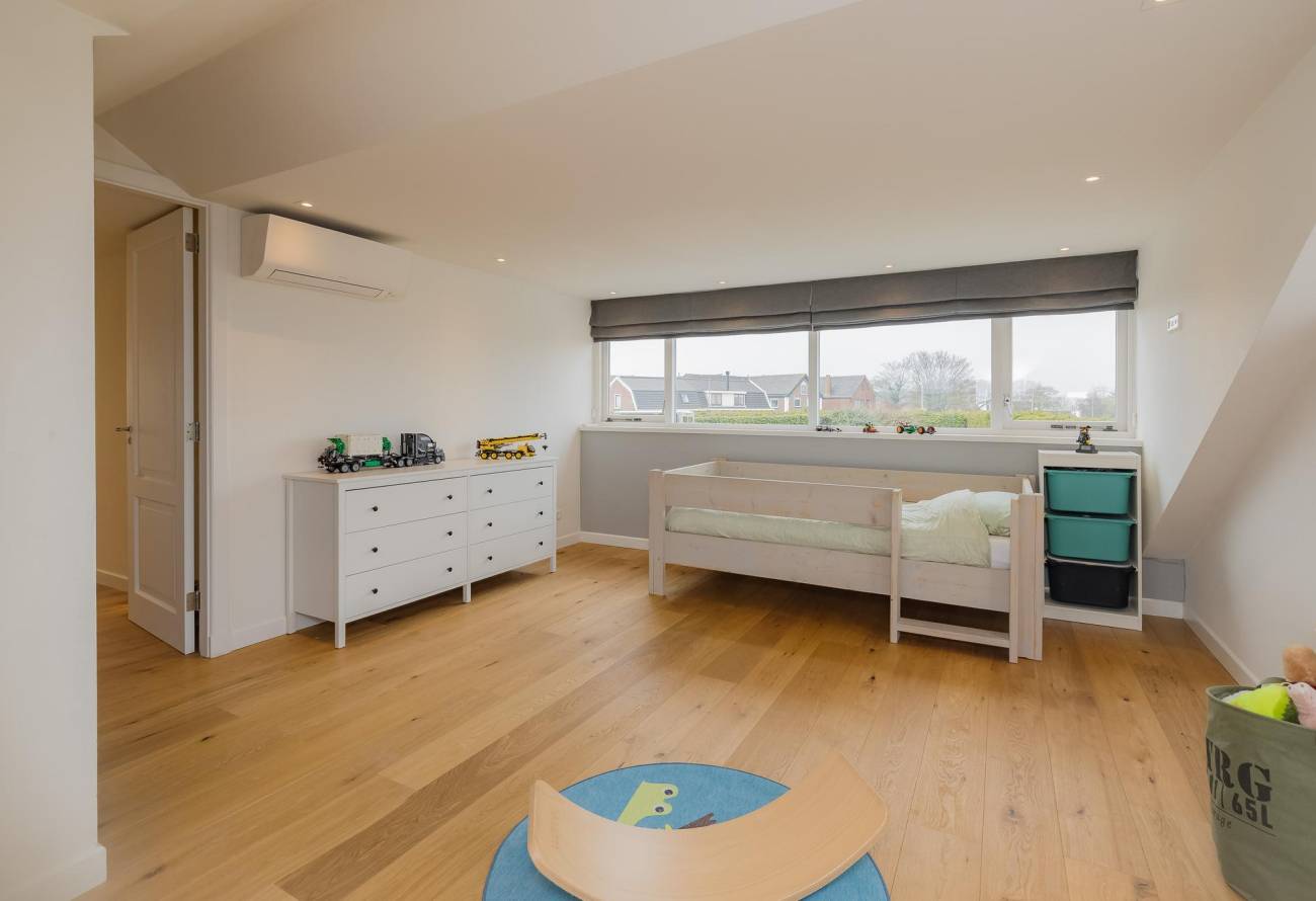 Op de verdieping zijn 3 slaapkamers en 2 badkamers waarvan er één toegankelijk is vanuit de slaapkamer. De slaapkamers zijn voorzien van airco en een grote dakkapel over de hele breedte van de woning zorgt voor ruime lichtinval.
