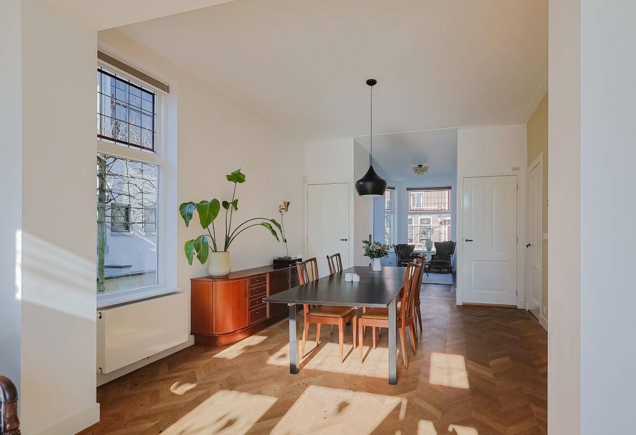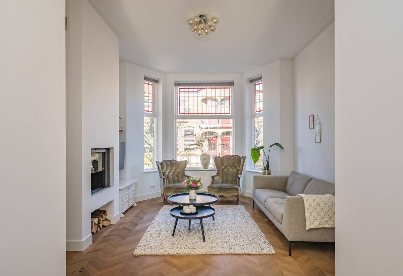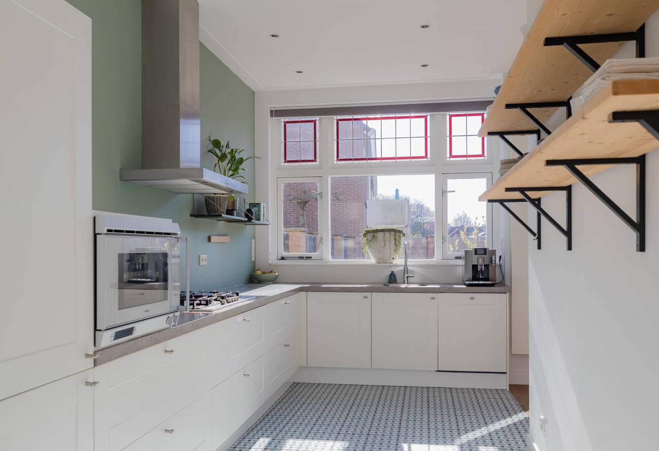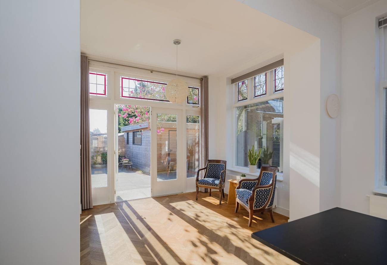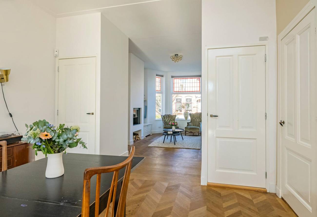 Mooie authentieke voordeur met aan weerszijden glas-in lood ramen, ruime hal met sfeervolle tegelvloer, houten trap met loper, moderne toiletruimte, trapkast en nieuwe meterkast. Uitgebouwde woonkamer met aan voorzijde fraaie erker, twee vaste kasten, dubbele deuren naar tuin en eikenhouten vloer in Hongaarse punt. Mede door de ramen in de zijgevel is het een heerlijk lichte kamer. De half open keuken heeft een moderne inrichting in off white, diverse inbouwapparatuur en sfeervolle tegelvloer.