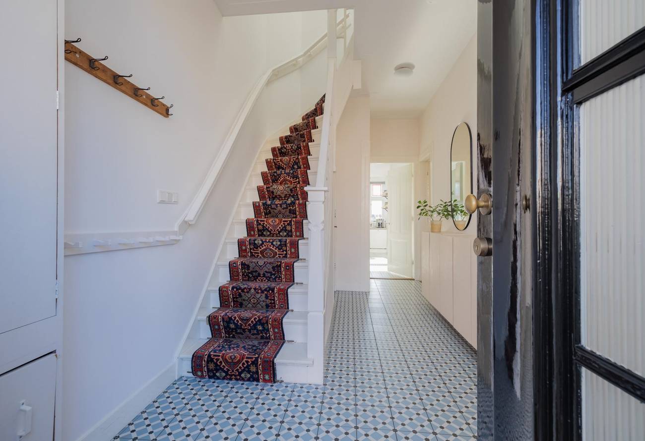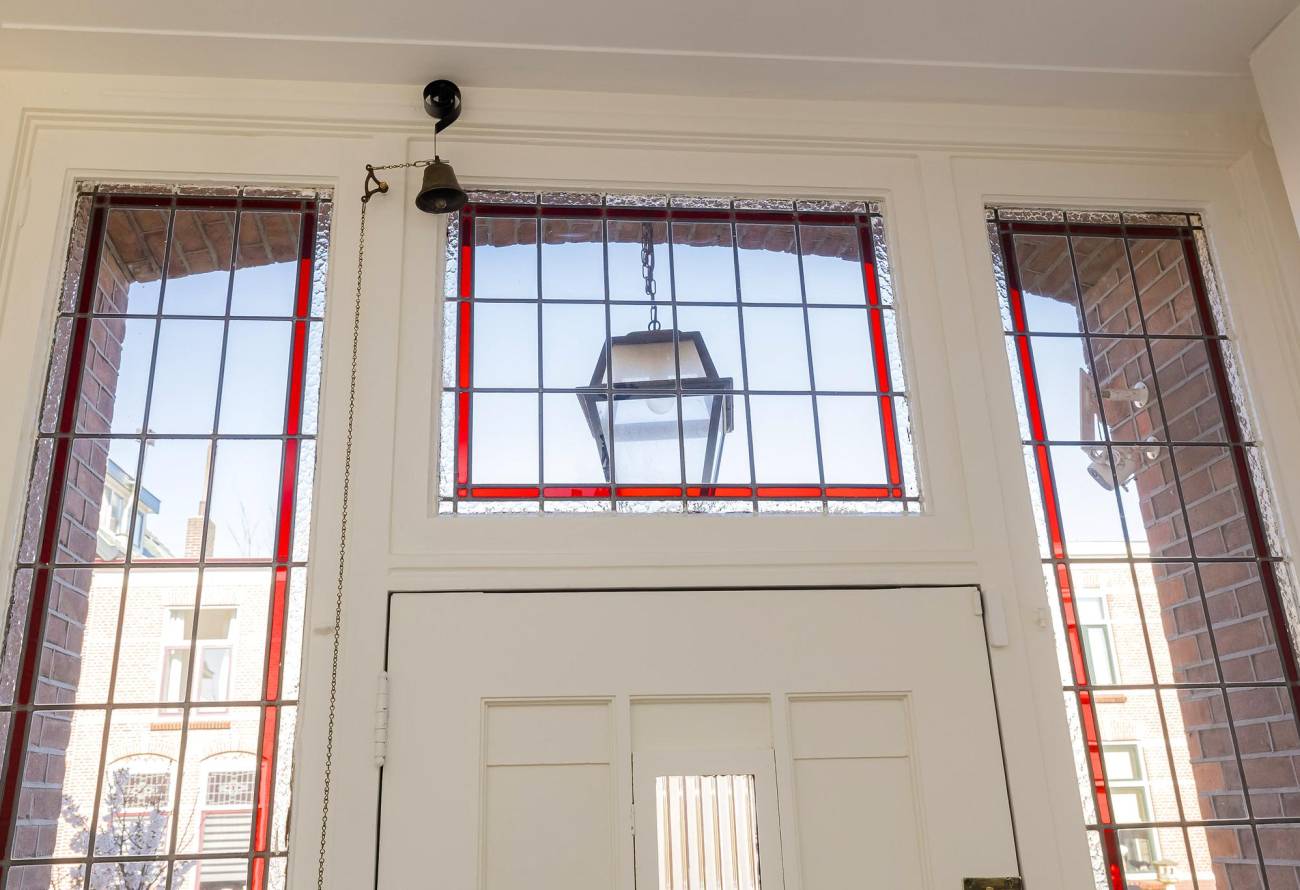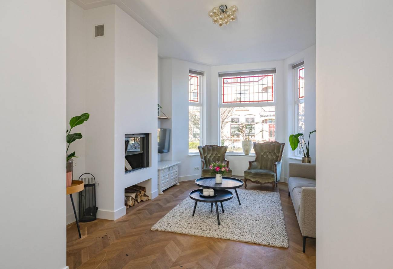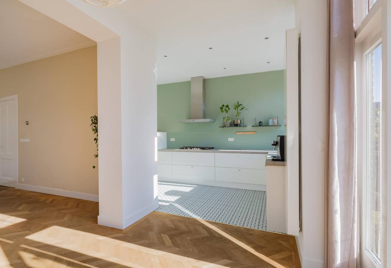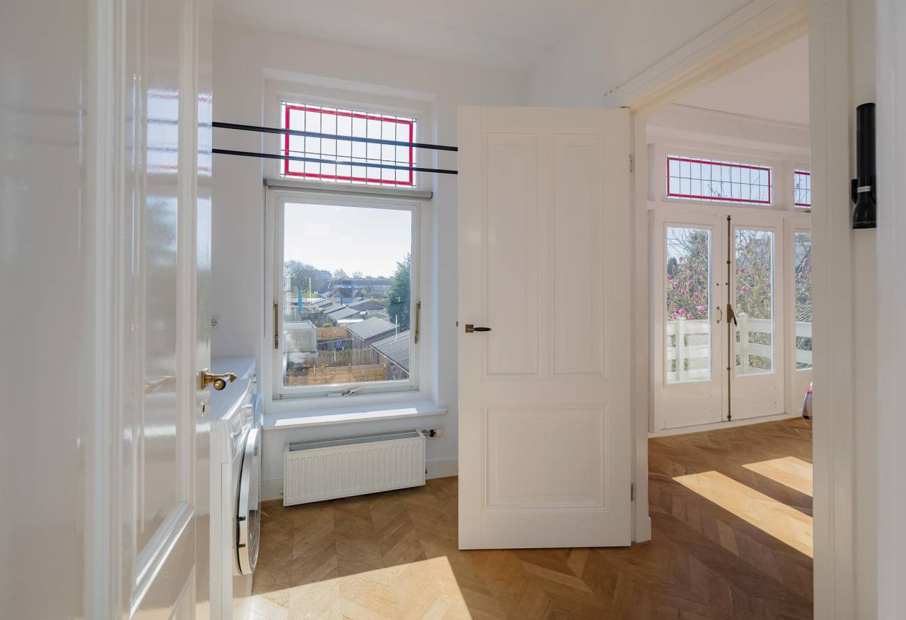 Mooie authentieke voordeur met aan weerszijden glas-in lood ramen, ruime hal met sfeervolle tegelvloer, houten trap met loper, moderne toiletruimte, trapkast en nieuwe meterkast. Uitgebouwde woonkamer met aan voorzijde fraaie erker, twee vaste kasten, dubbele deuren naar tuin en eikenhouten vloer in Hongaarse punt. Mede door de ramen in de zijgevel is het een heerlijk lichte kamer. De half open keuken heeft een moderne inrichting in off white, diverse inbouwapparatuur en sfeervolle tegelvloer.
