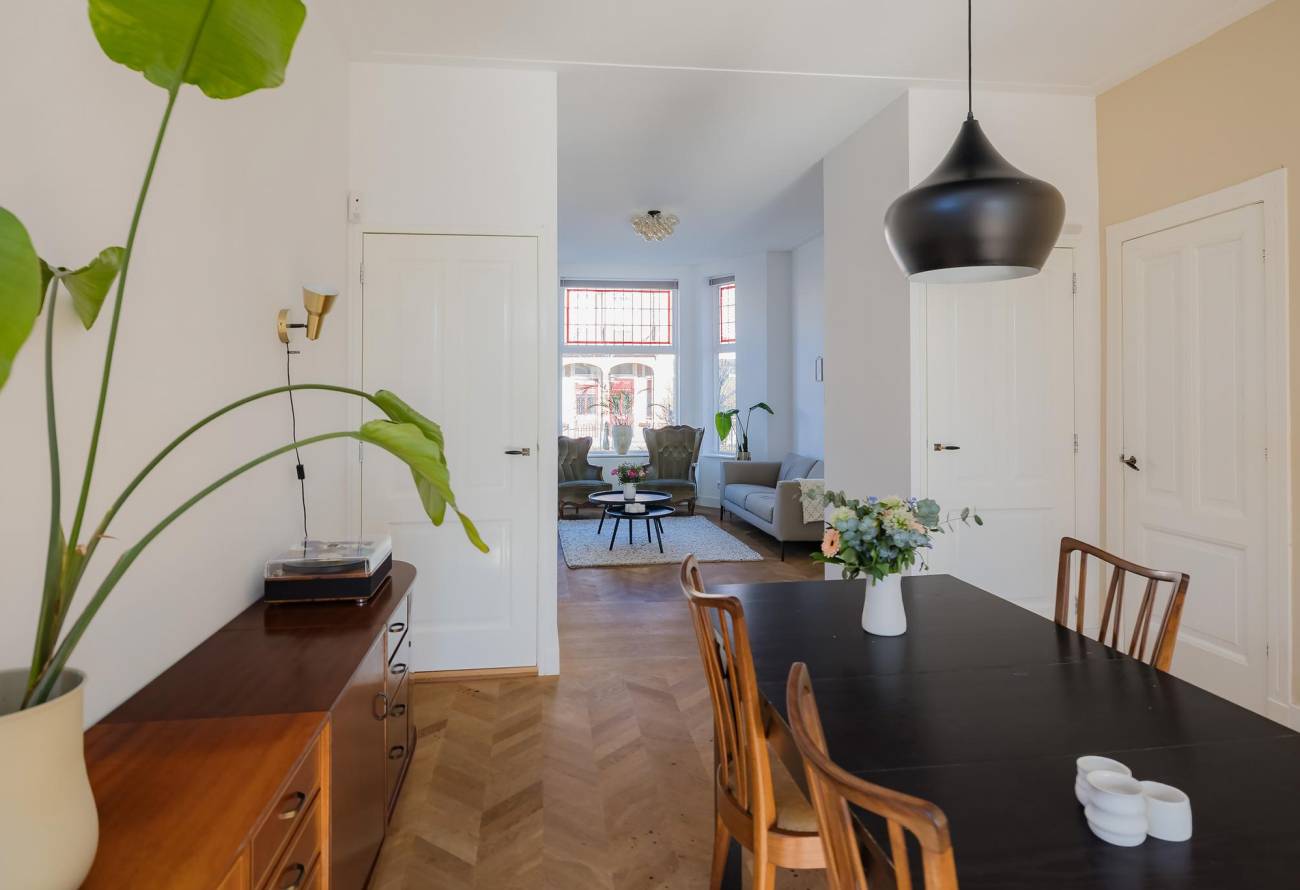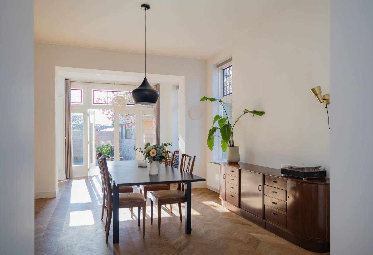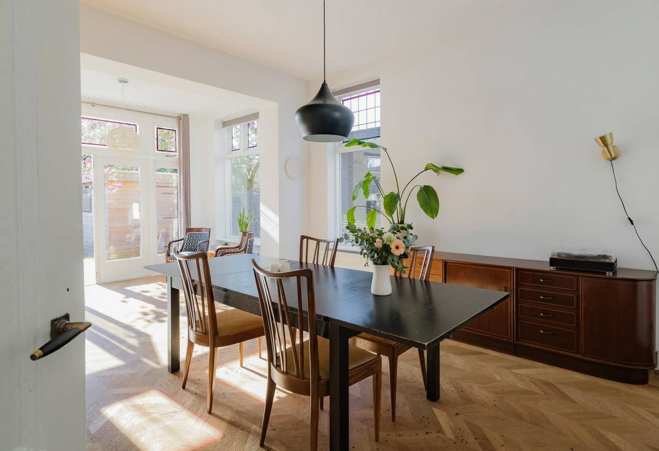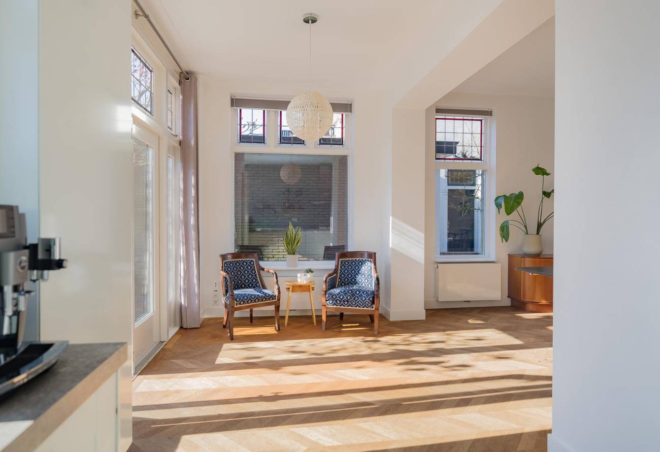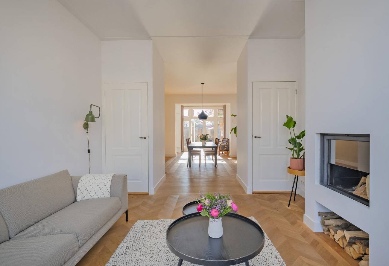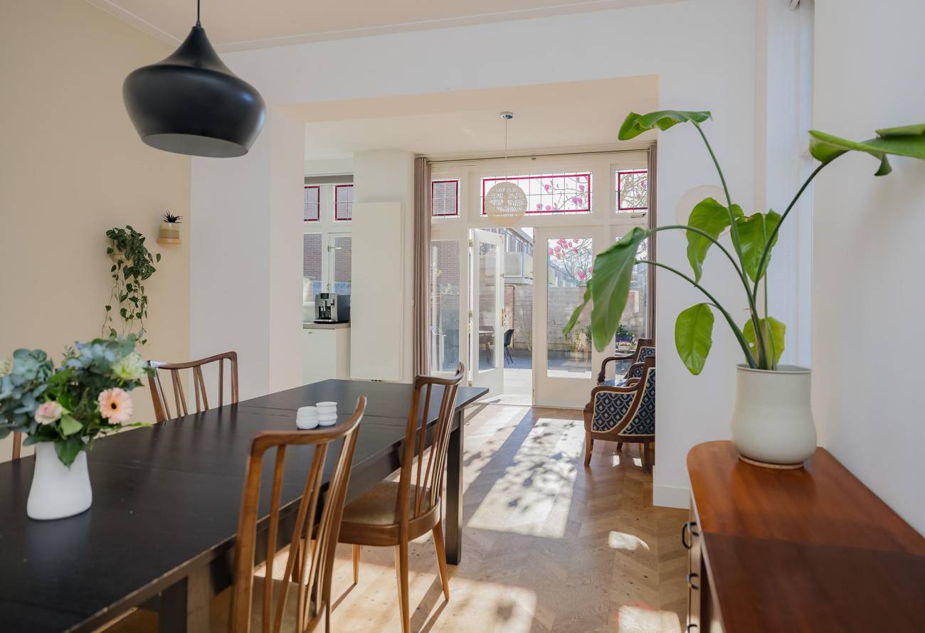 Mooie authentieke voordeur met aan weerszijden glas-in lood ramen, ruime hal met sfeervolle tegelvloer, houten trap met loper, moderne toiletruimte, trapkast en nieuwe meterkast. Uitgebouwde woonkamer met aan voorzijde fraaie erker, twee vaste kasten, dubbele deuren naar tuin en eikenhouten vloer in Hongaarse punt. Mede door de ramen in de zijgevel is het een heerlijk lichte kamer. De half open keuken heeft een moderne inrichting in off white, diverse inbouwapparatuur en sfeervolle tegelvloer.