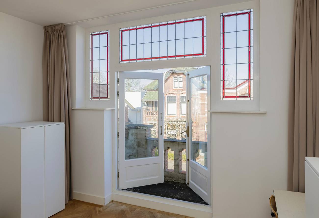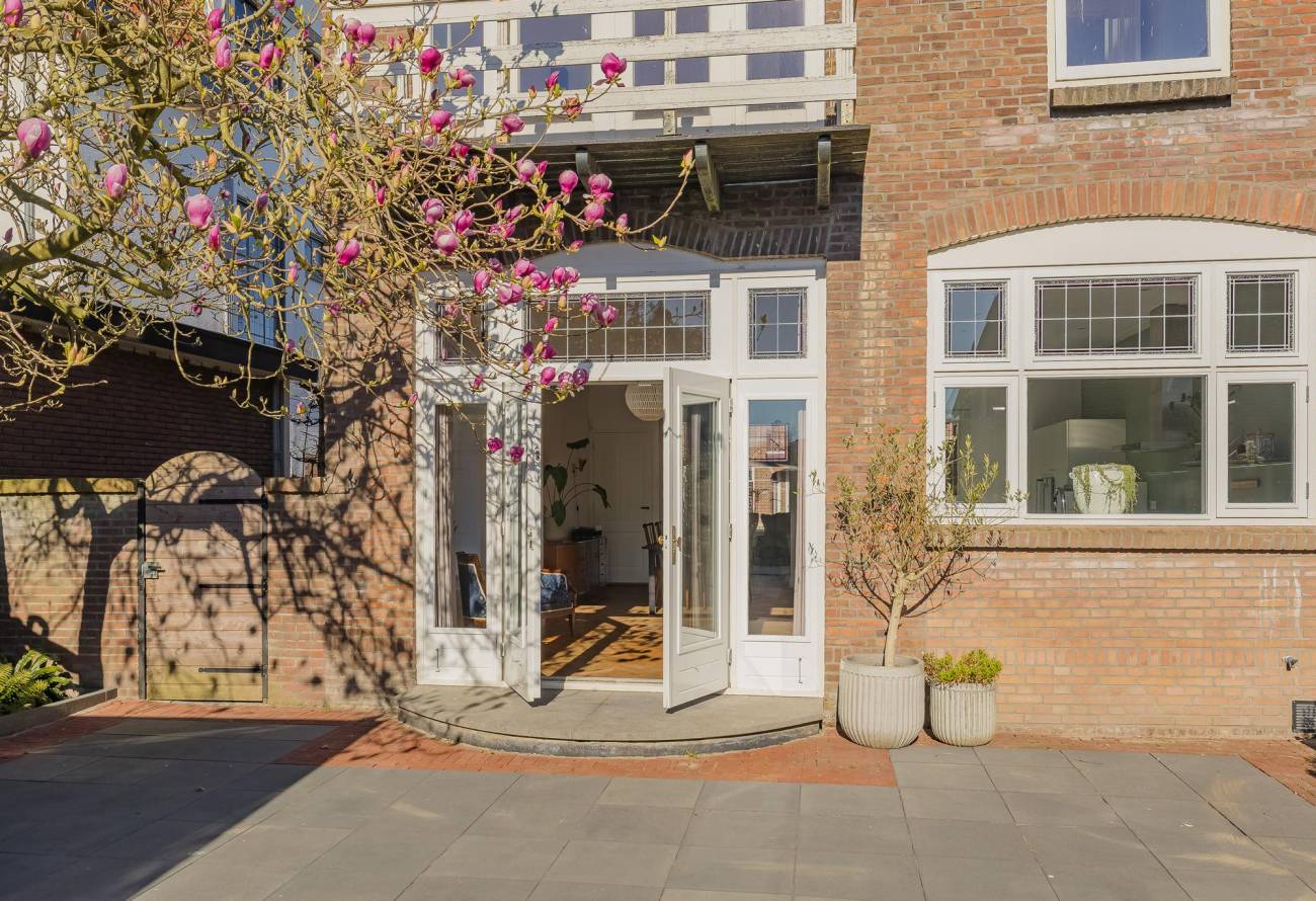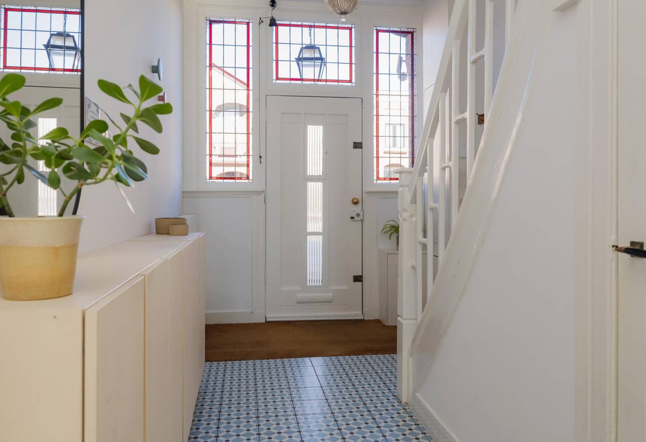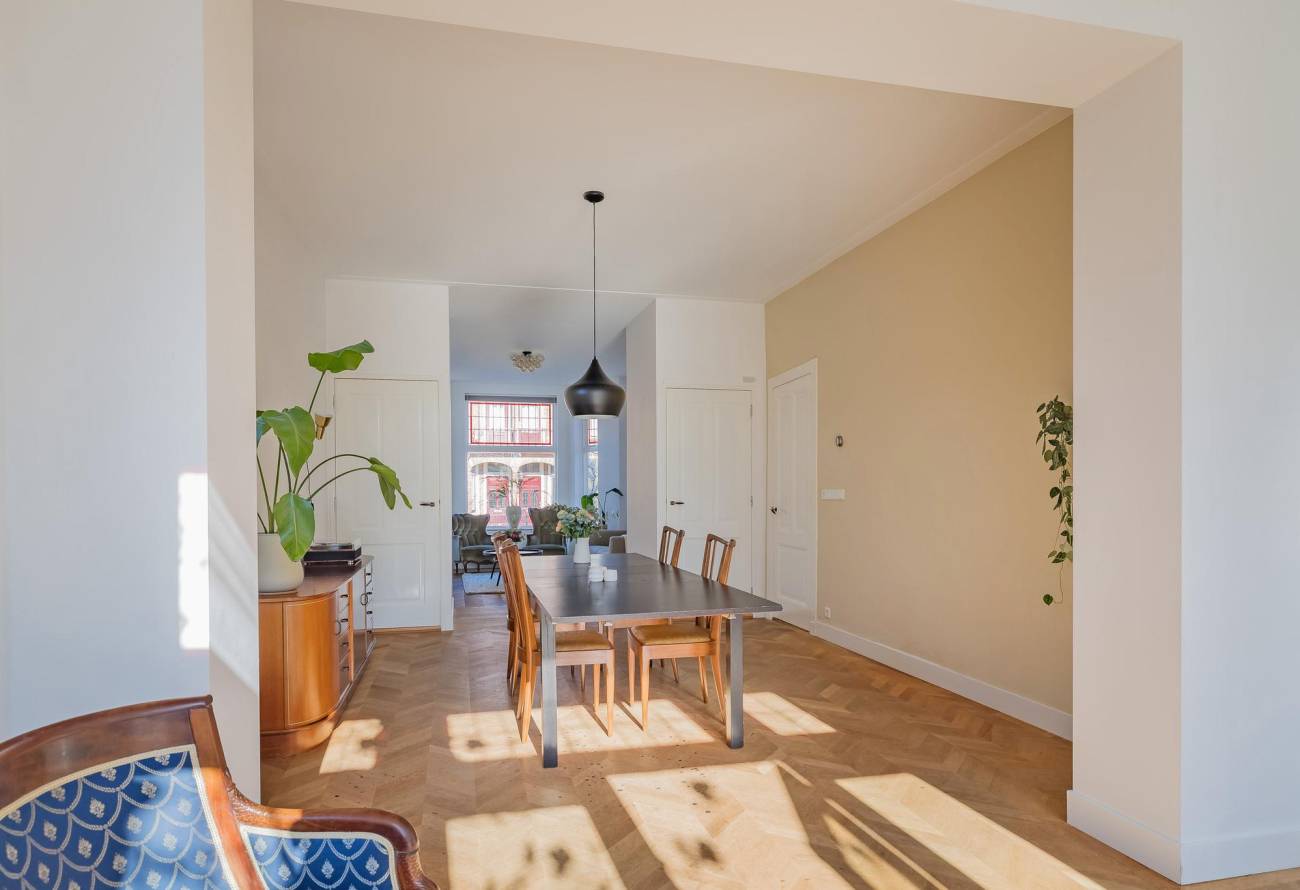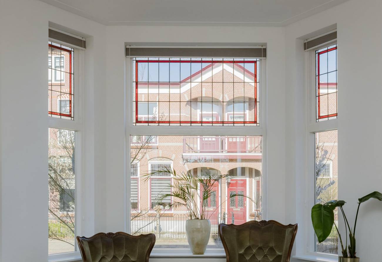 Mooie authentieke voordeur met aan weerszijden glas-in lood ramen, ruime hal met sfeervolle tegelvloer, houten trap met loper, moderne toiletruimte, trapkast en nieuwe meterkast. Uitgebouwde woonkamer met aan voorzijde fraaie erker, twee vaste kasten, dubbele deuren naar tuin en eikenhouten vloer in Hongaarse punt. Mede door de ramen in de zijgevel is het een heerlijk lichte kamer. De half open keuken heeft een moderne inrichting in off white, diverse inbouwapparatuur en sfeervolle tegelvloer.