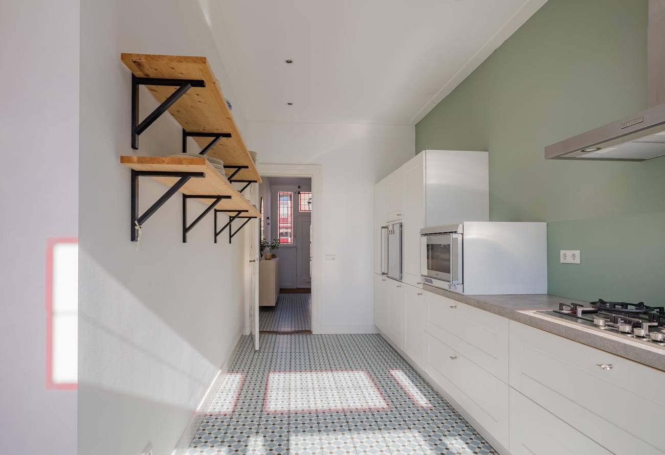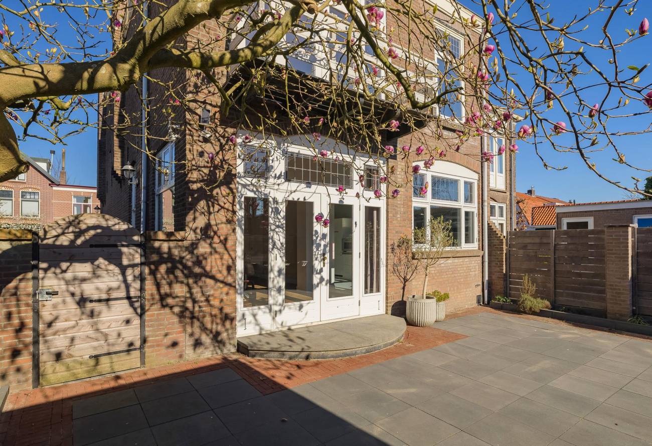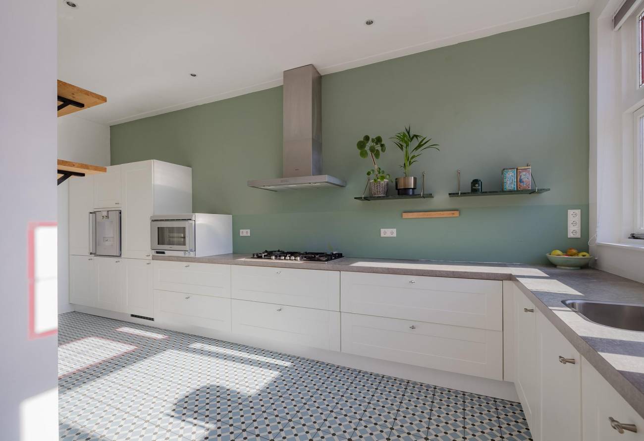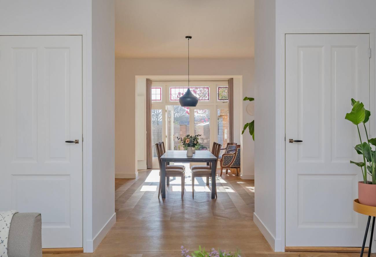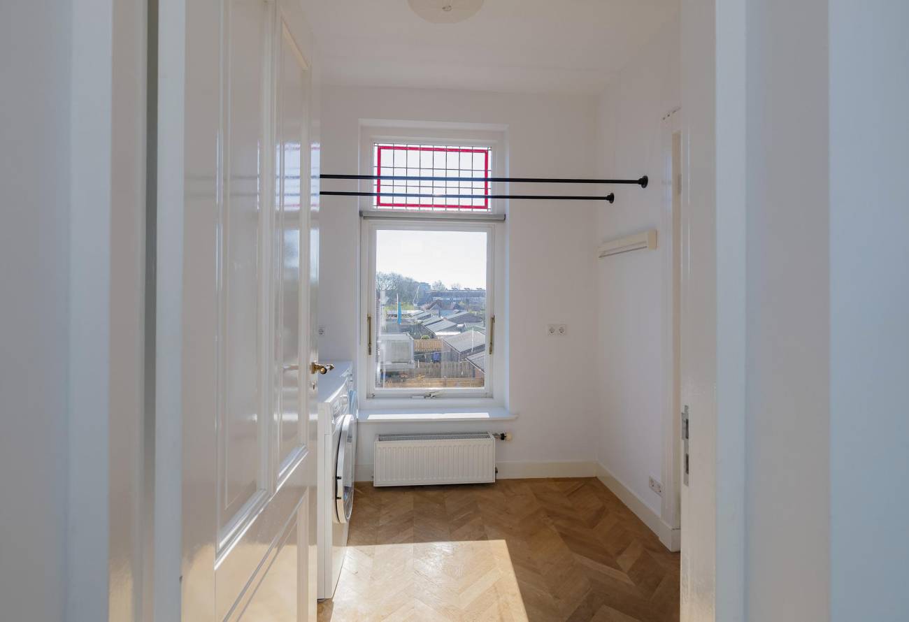 Mooie authentieke voordeur met aan weerszijden glas-in lood ramen, ruime hal met sfeervolle tegelvloer, houten trap met loper, moderne toiletruimte, trapkast en nieuwe meterkast. Uitgebouwde woonkamer met aan voorzijde fraaie erker, twee vaste kasten, dubbele deuren naar tuin en eikenhouten vloer in Hongaarse punt. Mede door de ramen in de zijgevel is het een heerlijk lichte kamer. De half open keuken heeft een moderne inrichting in off white, diverse inbouwapparatuur en sfeervolle tegelvloer.